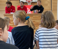 Mit von der Partie waren auch drei Spieler der 1. Mannschaft. Sascha Marquet, Kai Försterling und Jan-Luca Rumpf hatten verschiedene Übungen für die Kids der KGS Forststraße mitgebracht.