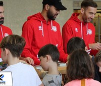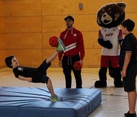 Neue Woche, neue Schulaktion: Am Montag waren Robin Scheu, Benjamin Pintol und Aaron Eichhorn zu Gast an der Förderschule Deutz. Gemeinsam mit Maskottchen Fred führten die Profis die Kinder durch ein Training mit insgesamt drei Stationen.