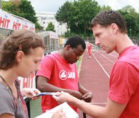 Kurz nachdem dieses Bild entstand, musste Neuzugang Nassirou Ouro-Akpo den gestrigen Sprinttest verletzt abbrechen. Er zog sich einen Muskelfaserriss im linken Oberschenkel zu, wie sich bei einer Kernspintomografie im Kölner Eduardus-Krankenhaus herausstellte. Er wird ca. vier Wochen ausfallen. Ebenfalls nicht mit dabei waren Stephan Glaser (Magen-Darm-Infekt) und Chamdin Said (Bauchmuskelzerrung), der aber zumindestens ein leichtes Lauftraining...