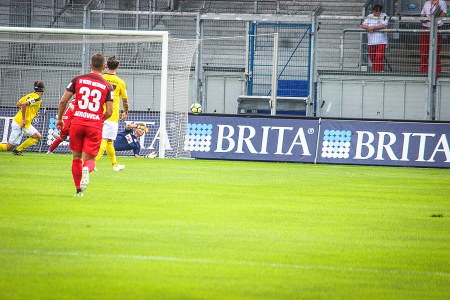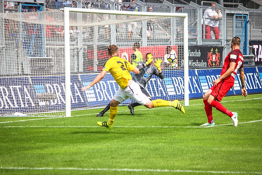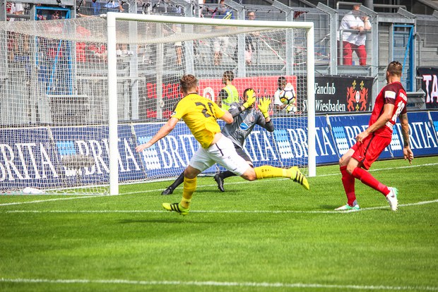 In der Anfangsphase der Partie tasteten sich beide Mannschaften zunächst einmal ab. Das Spiel fand hauptsächlich im Mittelfeld statt, wobei die Wiesbadener versuchten, früh das Heft des Handelns in die Hand zu nehmen. Die ersten Versuche von Schäffler (5.) und Andrich (8.) stellten Boss aber vor keine große Probleme. Kurz darauf war es Robin Scheu, der mit einem Kopfball (9.) die erste Chance für die Fortuna hatte. In der Folge bestimmten lange Bälle das Spielgeschehen, wobei die Fortuna defensiv äußerst souverän agierte. Kegel versuchte immer wieder die Anspiele auf die schnellen Außen Farrona Pulido und Scheu, was in der 18. Minute gelang: Scheu tauchte im Strafraum unter Bedrängnis vor Kolke auf. Der Torhüter der Wiesbadener konnte die erste wirkliche Chance der Partie aber parieren. Auf der anderen Seite war es wenige Minuten später Boss, der bei einem Versuch von Müller aus kurzer Distanz seine ganze Klasse zeigen musste (24.). Kurz vor der Pause gab es dann die bis dato größte Doppelchance für die Gastgeber. Ruprecht und Dams trafen nach einer Ecke aber jeweils nur das Aluminium (42.). So ging es für beide Mannschaften torlos in die Kabinen.