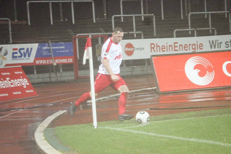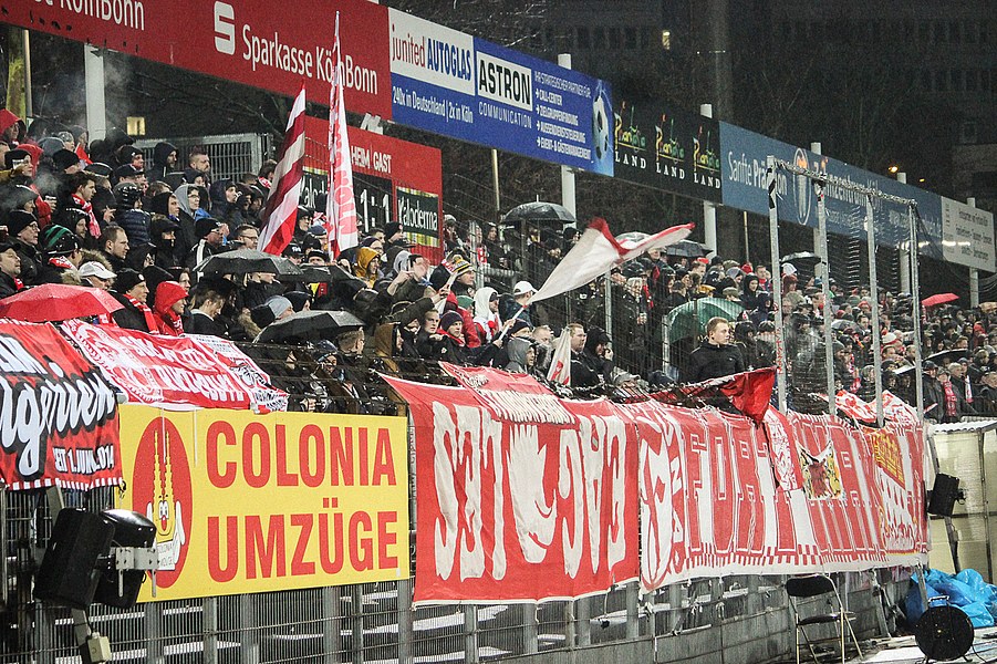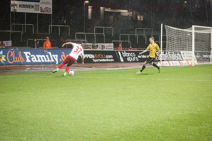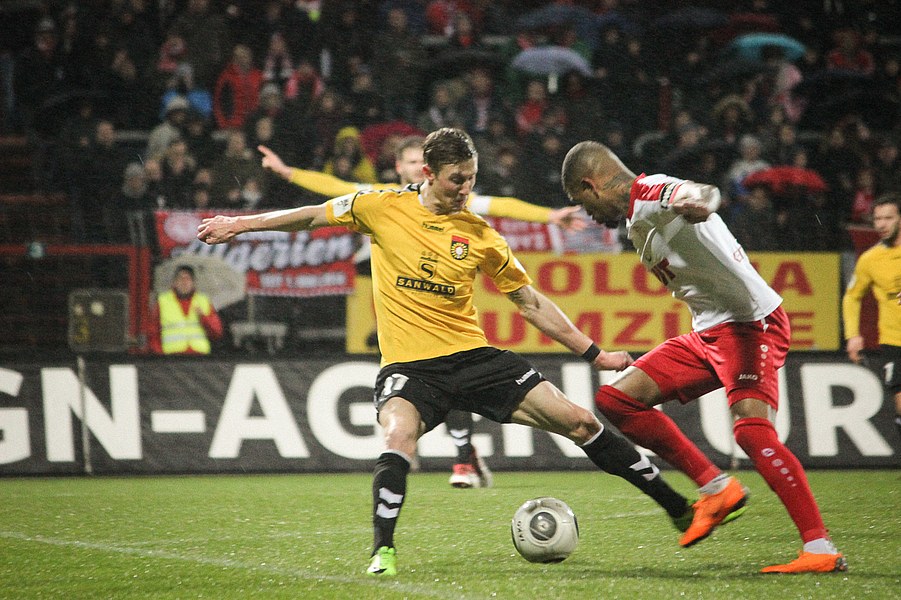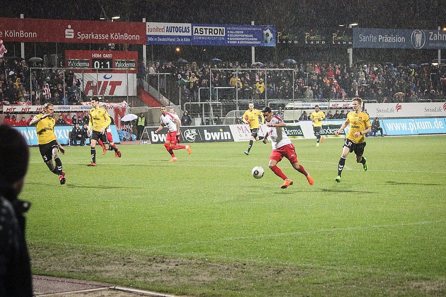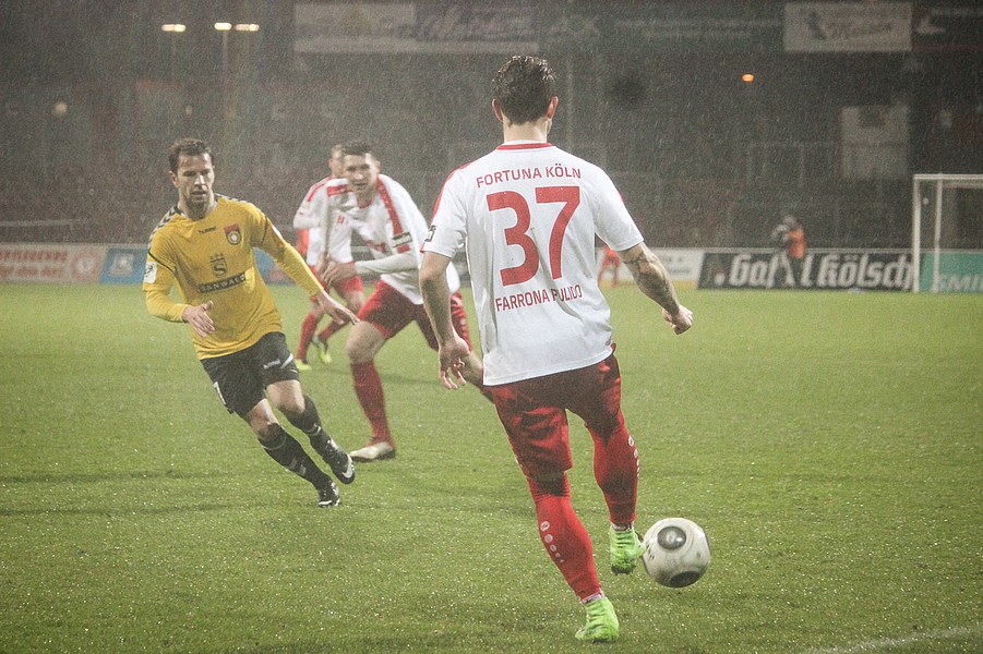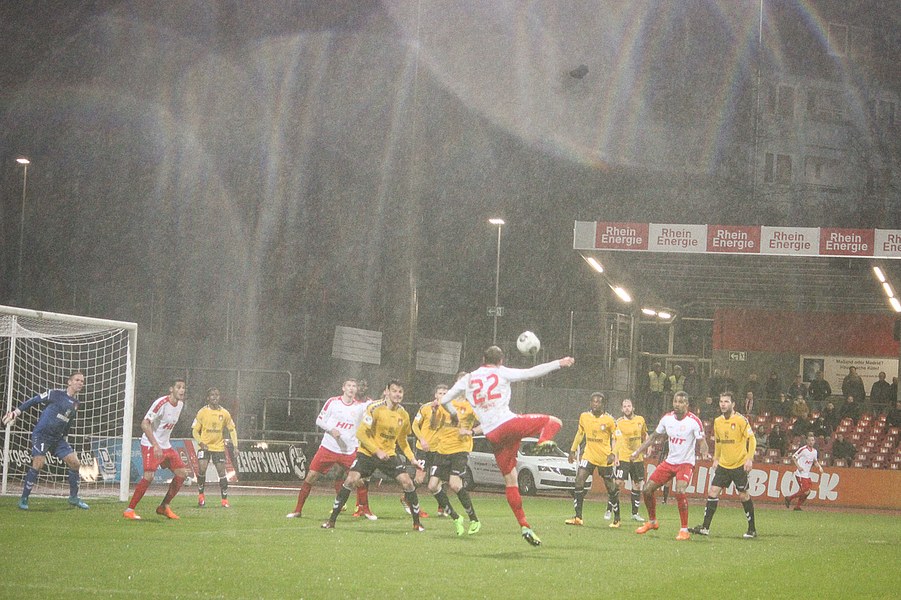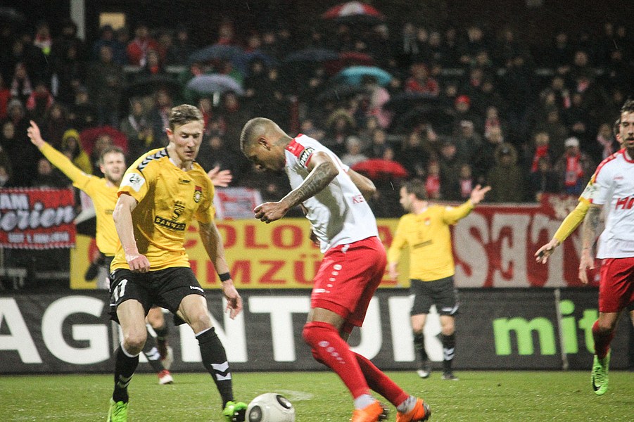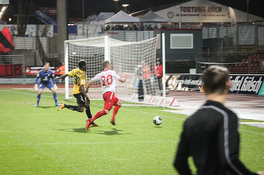 Die SG Sonnenhof Großaspach konnte in der Rückrunde noch kein Spiel für sich entscheiden. Den daraus resultierenden Frust konnte man den Schwaben in der Anfangsphase anmerken. Sie griffen die Kölner früh an und provozierten Fehler. In den Anfangsminuten trug dieses Pressing bereits Früchte: Boss wollte das Spiel über Brandenburger aufbauen. Fountas lauerte auf diesen Pass, ging entschieden dazwischen und konnte den Ball erobern. Schließlich überlupfte er den Kölner Schlussmann zur Gäste-Führung (3.). In der Folgezeit liefen die Spieler der SG immer wieder entschlossen an. Die Fortuna brauchte etwas, um ins Spiel zu finden, erhöhte aber zusehends den Druck und kam dem schwäbischen Tor näher. So erspielte man sich ein optisches Übergewicht. Nach einer Hereingabe von Farrona Pulido setzte Dahmani zum Flugkopfball an, der Ball ging aber knapp vorbei (26.). Schließlich konnten die Kölner durch eigenes Pressing den Ball erobern und sofort umschalten: Scheu gewann den Ball in der Hälfte der Gäste und spielte nach Doppelpass mit Ernst Kegel frei, der überlegt zum 1:1 einschob (30.). Kurz darauf hatte Brandenburger die Führung auf den Kopf, Broll konnte seinen Versuch aber parieren (35.). Die SG Sonnenhof Großaspach war zu der Phase eigentlich nicht im Spiel und schlug dann doch eiskalt zu: Nach einem langen Ball tauchte Gyau frei vor Boss auf und erzielte eiskalt das 2:1 für die Gäste (43). So gingen die Schwaben mit einer Führung in die Pause.