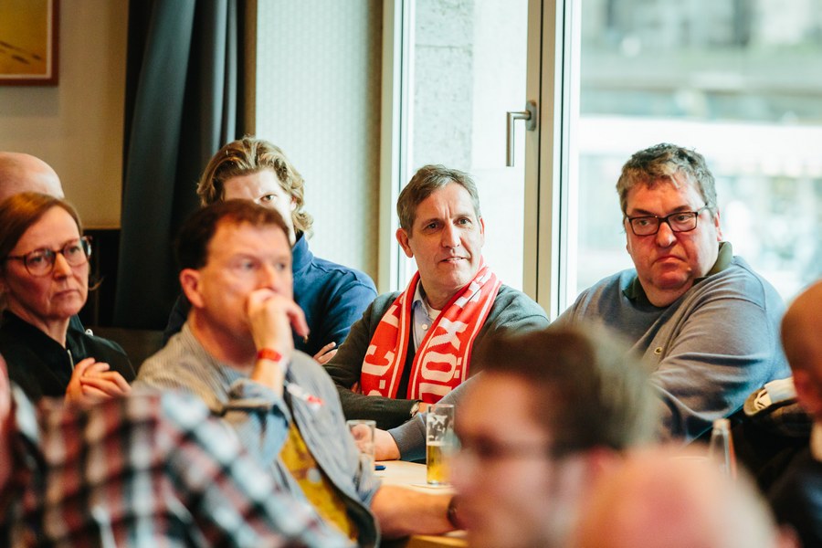 Zunächst begrüßten Geschäftsführer Benjamin Bruns, Präsident Hanns-Jörg Westendorf, Marketingleiter Stefan Kurth von junited AUTOGLAS, sowie Ehrengast Hannes Linßen die eingeladenen Gäste im Gaffel am Dom. Der Abend startete mit einer brisanten Verkündung. Alexander Ende wird seinen im Sommer auslaufenden Vertrag bei der Fortuna nicht verlängern. Dementsprechend war der Fokus der Veranstaltung zunächst auf das Traineramt und die weitere Ausrichtung gerichtet. Nach ausführlichen Erläuterungen der beiden Vereinsoffiziellen Bruns und Westendorf wurde das Augenmerk aber schnell auf den Ehrengast Hannes Linßen gerichtet. Dieser unterhielt in einer unglaublich witzigen Art den gesamten Saal und plauderte über alte Zeiten aus dem Nähkästchen. Nachdem in der Halbzeitpause ein reichhaltiges Buffet aus der Küche des Gaffel am Doms um Inhaber Erwin Ott durch junited AUTOGLAS gesponsert wurde, ging es anschließend mit dem offiziellen Teil und den vorab eingereichten Fragen weiter, welche je nach Themenbereich von Benjamin Bruns und Hanns-Jörg Westendorf beantwortet wurden. Nachfolgend durften alle anwesenden Fans und Partner der Fortuna Fragen aus dem Plenum stellen, bevor der Abend in einem gemütlichen Miteinander ausklang.
