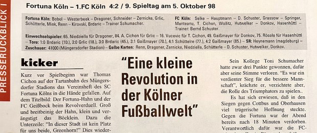 Der sportliche Leiter der Fortuna stand beim ersten Zweitliga-Duell, dass die Südstädter am 5. Oktober 1998 vor 41.000 Zuschauern in Müngersdorf mit 4:2 gewannen 90 Minuten auf dem Platz. Thomas Brdaric (10., 44.) und Ivica Grlic (18.) sorgten für eine 3:0-Führung zur Halbzeit. Für den 1. FC traf später Holger Gaißmayer zweimal (70./85.), das zwischenzeitliche 4:1 erzielte Rainer Schütterle (77.). „An das Spiel habe ich gute Erinnerungen. Ich habe auf der Sechs gegen Dorinel Munteanu gespielt. Beim darauffolgenden Derby war eine Spielszene von unserem Duell im Geißbock-Echo auf dem Titelblatt und meine Frau Kerstin war ganz stolz, als sie das Heft in die Hand gedrückt bekam. „Für uns war es ein damals ein sehr außergewöhnliches Spiel. Ich habe noch Bilder davon, als wir nach dem Abpfiff in die Fortuna-Kurve gegangen sind und gefeiert haben. Später wurde im Decksteiner Tennis-Club noch das eine oder andere Kölsch auf den Sieg getrunken.“