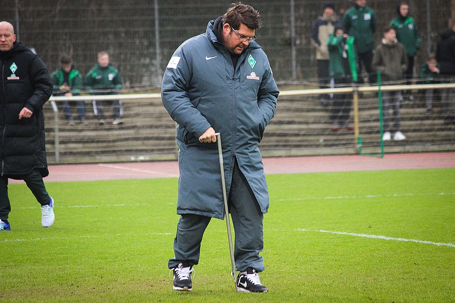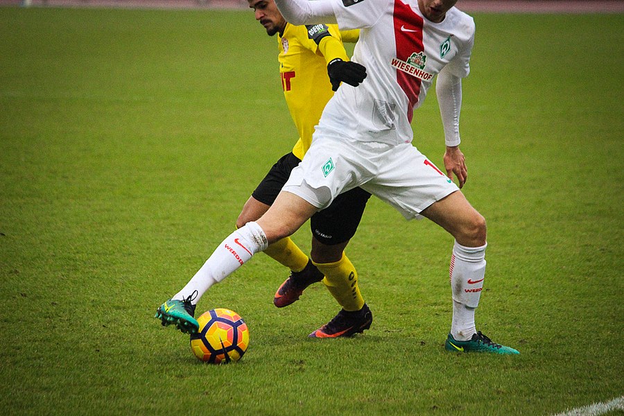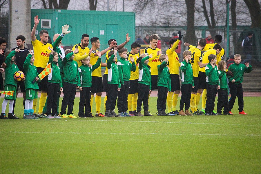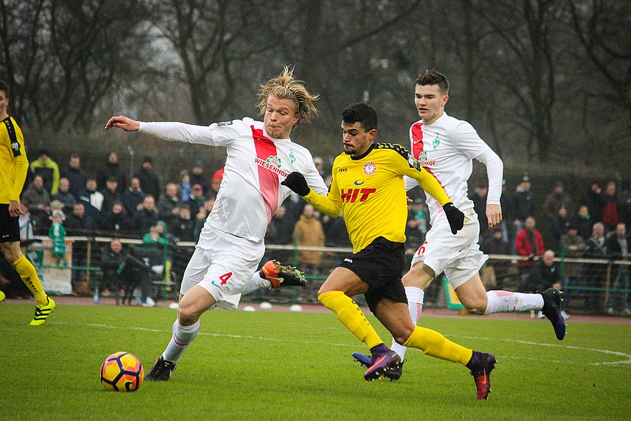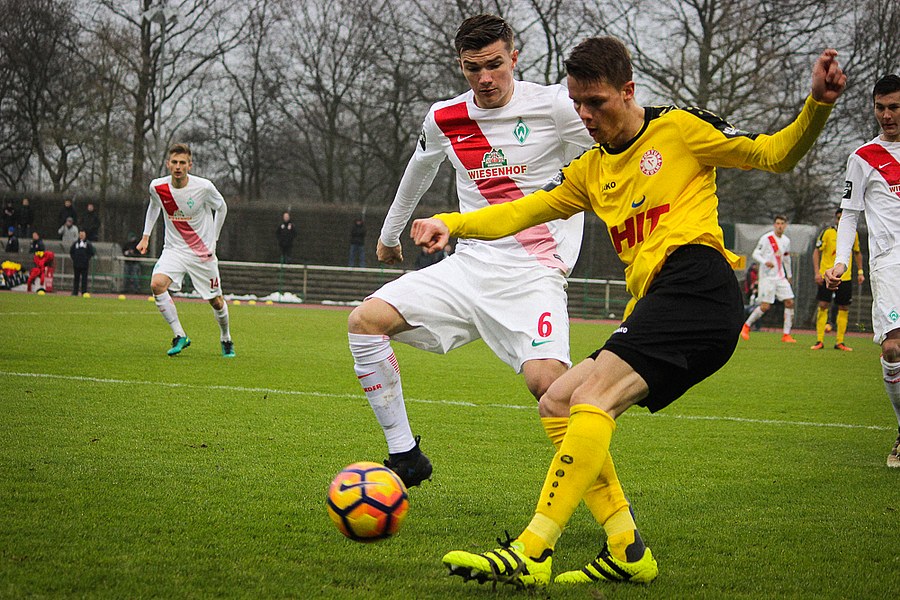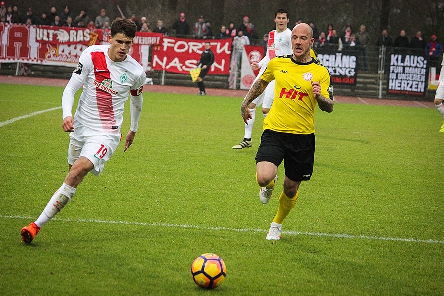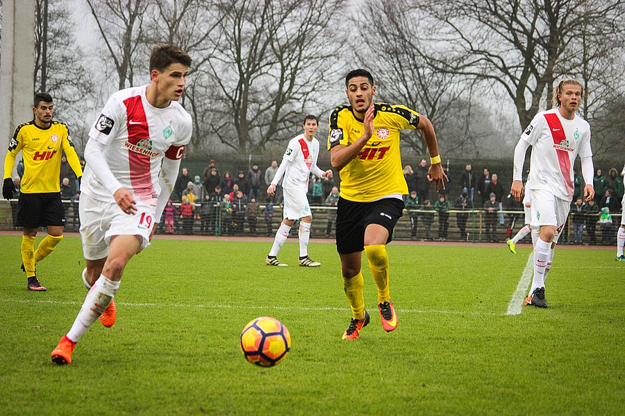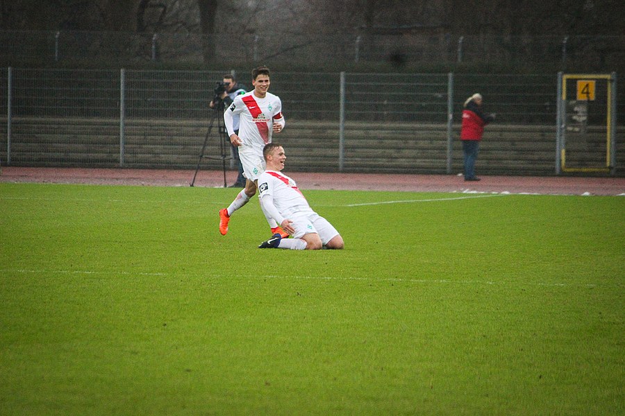 Die Fortuna versuchte früh, Kontrolle auf das Spiel zu bekommen und Dominanz auszuüben. Bremen ließ die Südstädter erstmal kommen, um dann auf Konter zu lauern. Zwei solcher Möglichkeiten ergaben sich früh dabei über die Profileihgabe Eilers (3.) und Stürmer Eggestein (6.). Die Fortuna suchte nun mit Bedacht die Offensive, sollte aber die erste große Möglichkeit bekommen: Nach Flanke Theisen, kam Alibaz frei vor Oeschlägel zum Abschluss, scheiterte aber am Werder-Keeper (13.). Die Kölner taten sich aber schwer, die Partie in den Griff zu bekommen. Bremen lauerte auf Fehler und schaltete blitzschnell um. So tauchte wieder Eilers frei vor Poggenborg auf, traf aber nur den Pfosten (17.). Es blieb allerdings eine zähe Angelegenheit. Auf nassem Rasen schlichen sich auf beiden Seiten Fehler ein, sodass kein Spielfluß aufkommen wollte. Aus dem Nichts hatte die Fortuna dann die Chance zur Führung, als Souza nach feiner Einzelaktion im Strafraum zu Fall gebracht wurde. Den fälligen Elfmeter konnte Oelschlägel aber gegen Dahmani parieren (30.). Kurz darauf drohte Werder beinahe der nächste Strafstoß. Schiedsrichter Osmanagic ahndete Oelschlägels Einsteigen gegen Theisen nach Rücksprache mit dem Linienrichter aber nicht als Foul (32.). Das Spiel wurde nun hektischer und kurz or der Pause sorgte dann Schmidt für das Highlight bis dato: Aus 35 Metern zimmerte der Bremer den Ball unhaltbar für Poggenborg zur Werder-Führung unter die Latte (41.). Mit dem Ergebnis ging es in die Kabine.