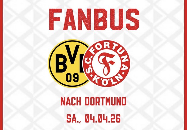 Infos zum Fanbus: Datum: Samstag, 4. April 2026. Abfahrtsort: Vereinsheim S.C. Fortuna Köln. Treffpunkt: 11:15 Uhr. Abfahrtszeit: 11:30 Uhr. Spielort: Stadion Rote Erde, Strobelallee 50, 44139 Dortmund. Preis: 20€ Vollzahler; Mitglieder 18€. Hin- und Rückfahrt inklusive. Hinweis: Das Fanbus-Ticket beinhaltet nur die Busfahrt. Eintrittskarten für das Spiel müssen separat erworben werden. Ihr bekommt das Ticket per Mail zugeschickt. Hier gibt es das Fanbus-Ticket.