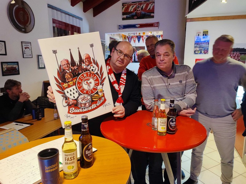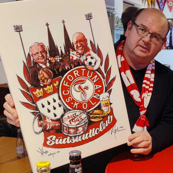 Abschließend übergaben Thomas "Bächti" Bächtold und Renato Valenti seitens der Eagles ein Kunstwerk des Künstlers Dirk "Rollo" Jochmann an den Vorstand. Abzüge von diesem hochwertigen Kunstdruck in A3 (siehe Galerie), das die Feinheiten der Fortuna herausstellt und die zwei prägendsten Personen - Jean Löring und Klaus Ulonska - würdigt, bieten die Eagles in einer limitierten Auflage von 111 Stück zum Preis von 55 Euro auf Büttenpapier an. Unter eagles-alte-garde-1986[at]web.de können die durchnummerierten Sammlerstücke vorbestellt werden. Die Ausgabe erfolgt gebündelt am 7. und 9. Februar zwischen 18 und 20 Uhr im Vereinsheim. Der Reinerlös kommt der Fanszene für Aktionen rund um das Jubiläum zugute sowie der Jugendarbeit der Fortuna.