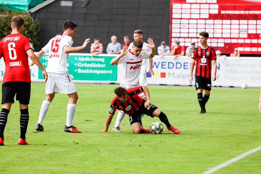 Im Stadion an Bruchbaum sahen die Zuschauer eine Anfangsviertelstunde ohne nennenswerte Torchance. Lippstadt ließ den Ball zunächst durch die eigenen Abwehrreihen laufen und suchte immer wieder mit langen Bällen Sergio Gucciardo auf der linken Angriffsseite. Mehr als eine zu weit geratene Flamke, die Rauhut sicher aus der Luft holte, kam dabei allerdings nichts heraus (5.). Fortuna hingegen tat sich schwer, durch das Mittelfeld zu dringen. Immer wieder war für die Angriff der Südstädter bereits an der Mittellinie Schluss. Die erste Torannäherung der Fortuna gab es nach 16 gespielten Minuten. Koljic schlug einen Freistoß von halbrechts in den Strafraum, fand dort aber keinen Abnehmer. Auch in den folgenden 15 Zeigerumdrehungen zeigte sich ein ähnliches Bild. Lippstadt sicherte sich mehr Ballanteile, schaffte es aber ebenso wie die Fortuna nicht, sich klare Angriffe herauszuspielen und so für Gefahr vor dem gegnerischen Tor zu sorgen. Ein erstes Raunen ging durch das Stadion, als Janik Brosch eine Hereingabe gegen die Laufrichtung von Rauhut auf das Tor brachte, den Kopfball aber neben den rechten Pfosten setzte (33.). Mit der ersten richtig guten Chance der Fortuna verabschiedeten sich beide Mannschaften in die Halbzeit. Roman Prokoph wurde geschickt und suchte auf der anderen Seite des Strafraums den eingewechselten Mike Owusu. Der Schuss landete jedoch knapp neben dem linken Pfosten (45.). Kaum Torchancen und ein 0:0 gab es also zur Pause.