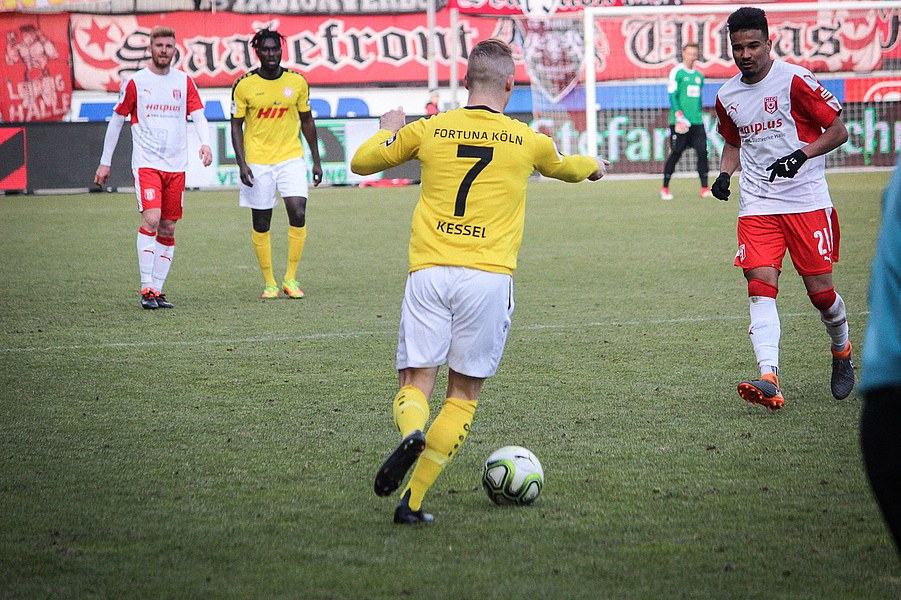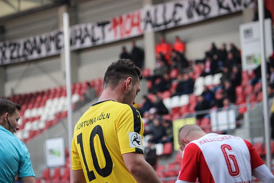 Nach zwei Siegen in Folge ging die Fortuna mit einer breiten Brust in die Partie beim angeschlagenen Halleschen FC. Dabei gelang den Kölnern fast ein Traumstart: Nach 25 Sekunden lief Keita-Ruel alleine auf Oliver Schnitzler zu. Der Torhüter machte sich aber groß und konnte den frühen Rückstand verhindern (1.). Ein paar Minuten später war es erneut Keita-Ruel: Nach einem Pass von Kegel konnte er den Ball an Schnitzler vorbei ins Tor lupfen. Der Schiedsrichter entschied allerdings auf Abseits (8.). Danach fanden auch die Gastgeber besser ins Spiel. Vor allem über die rechte Seite mit dem auffälligen Ajani drückte man die Fortuna in die eigene Hälfte. Torchancen konnten sie sich jedoch noch nicht heraus spielen. In diese Phase fiel dann die Führung der Fortuna: Kegel schickte Ernst mit einem langen Ball tief in die gegnerische Hälfte. Dort legte er den Ball in den Strafraum zu Keita-Ruel, der durch die Beine von Schnitzler köpfte (21.). Halle ließ sich vom Rückstand aber nicht beeindrucken und entwickelte mehr Zug zum Tor. Kurz nach der Kölner Führung verpasste Gjasula eine Ajani-Hereingabe nur knapp (23.). Es entwickelte sich daraufhin eine ausgeglichene Partie, in der sich der HFC aber ein optisches Übergewicht erspielte vor allem über die Außen Gefahr aufbaute. Lindenhahn und Gjasula kamen so zu aussichtsreichen Möglichkeiten (28./33.). Die größte Chance verbuchte El-Helwe, der seinen Meister aber in Boss fand (42.). Die Fortuna fand sich vornehmlich in der Defensive wieder und schaffte nur mit einem Distanzschuss von Pulido mal Entlastung (45.). Es blieb aber bei der Pausenführung.