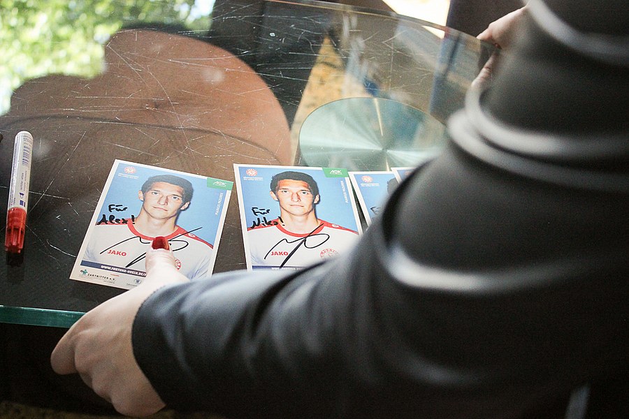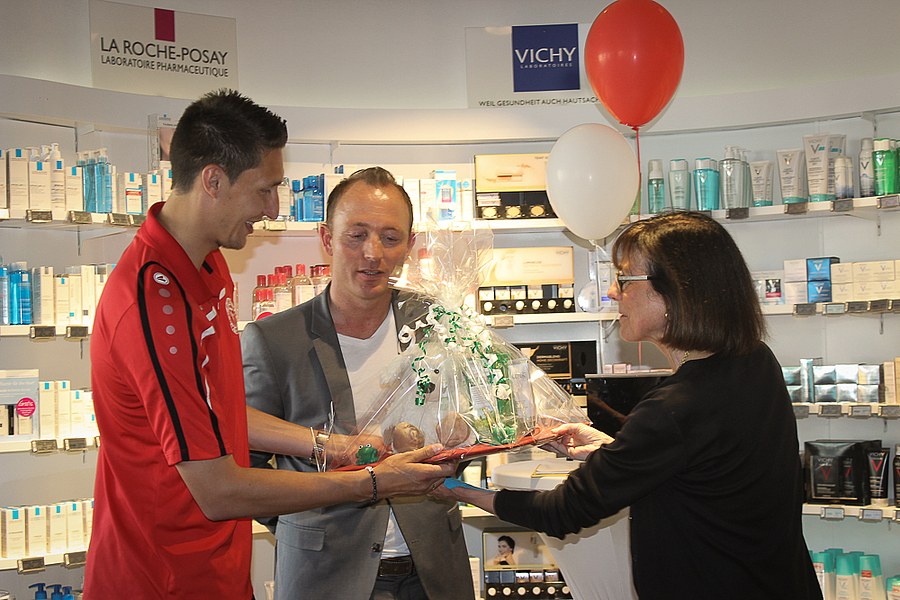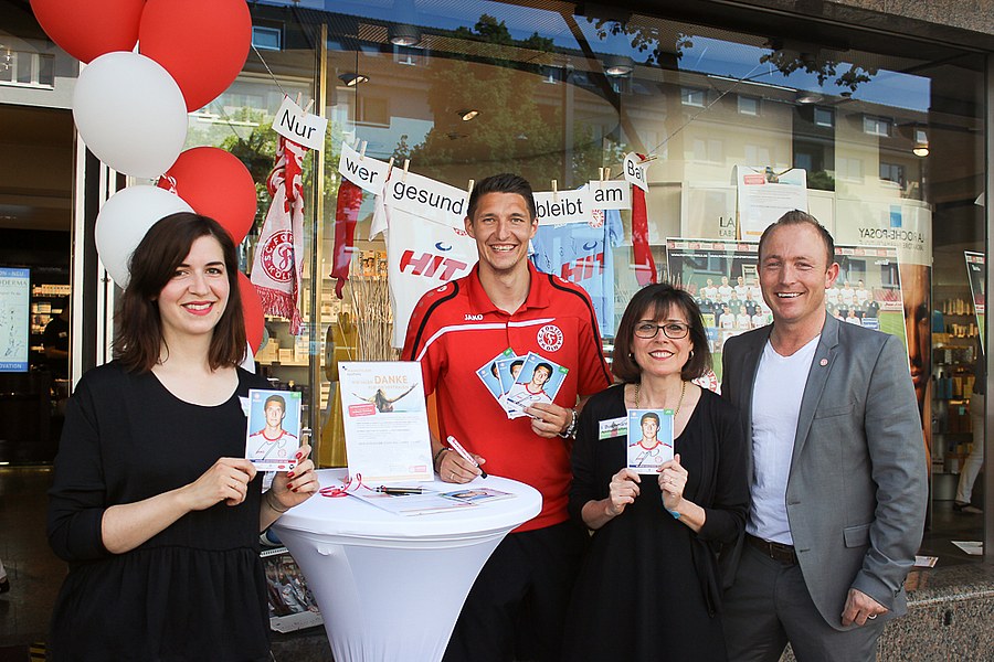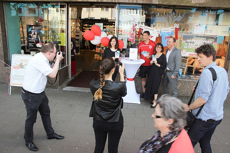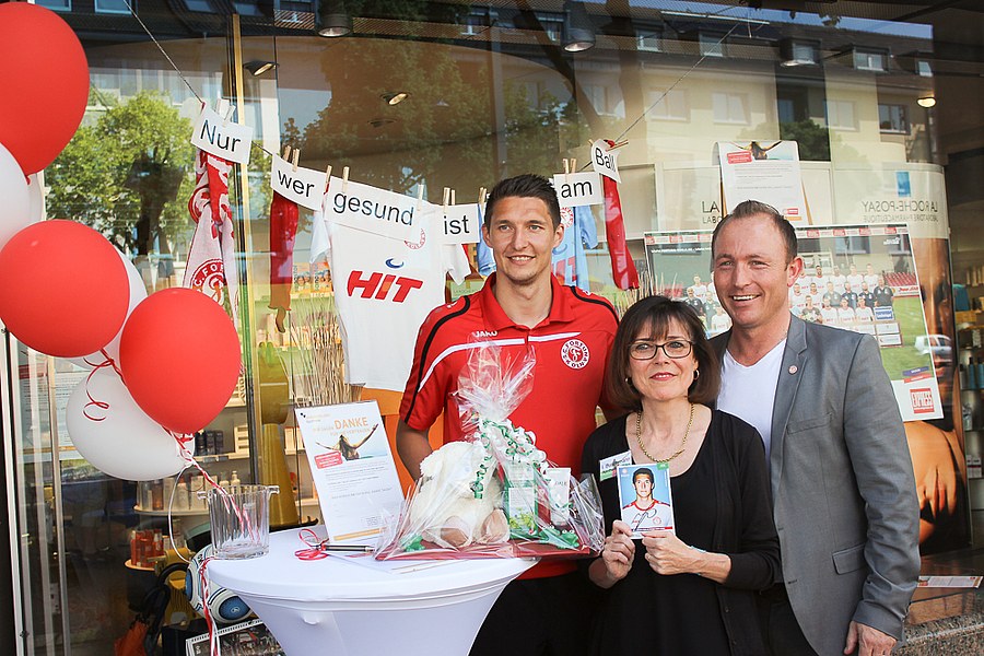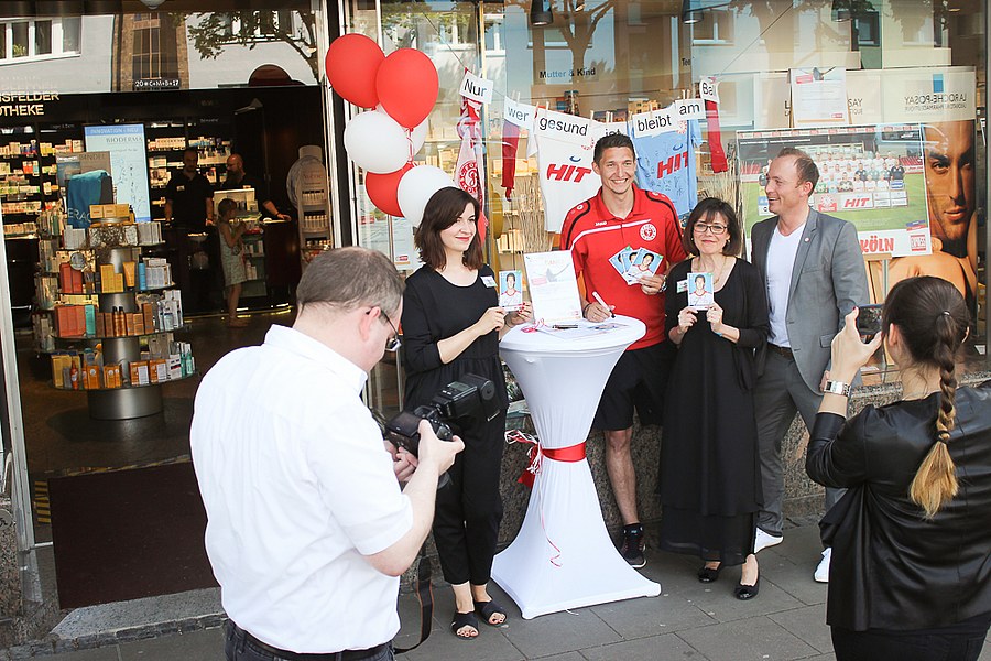 Unter dem Motto "Danke sagen" erschien Fortuna-Mittelfeldstar Markus Pazurek am 17.05 zur Autogrammstunde in der Braunsfelder Apotheke. Benjamin Bruns, Mitglied der Geschäftsleitung bei Fortuna Köln, übergab an Apothekenleiterin Ines Buschmann den Hauptpreis der Gewinnspiel-Verlosung: Zehn Gutscheine für Familientickets zum ersten Fortuna-Heimspiel in der kommenden Saison. Kunden können außerdem zehn Apotheken-Einkaufsgutscheine im Wert von 25 Euro, sowie 10x500 Gramm Fruchtsaft-Bären gewinnen.
