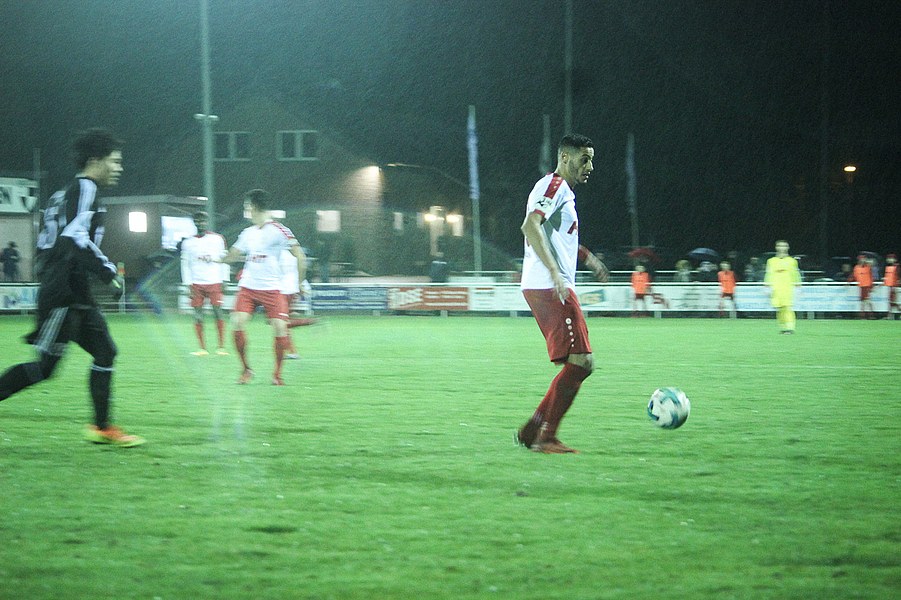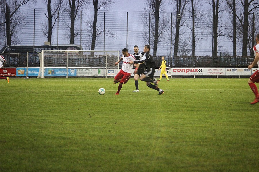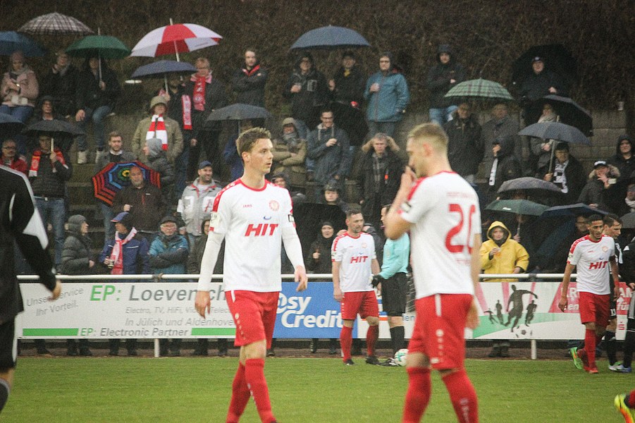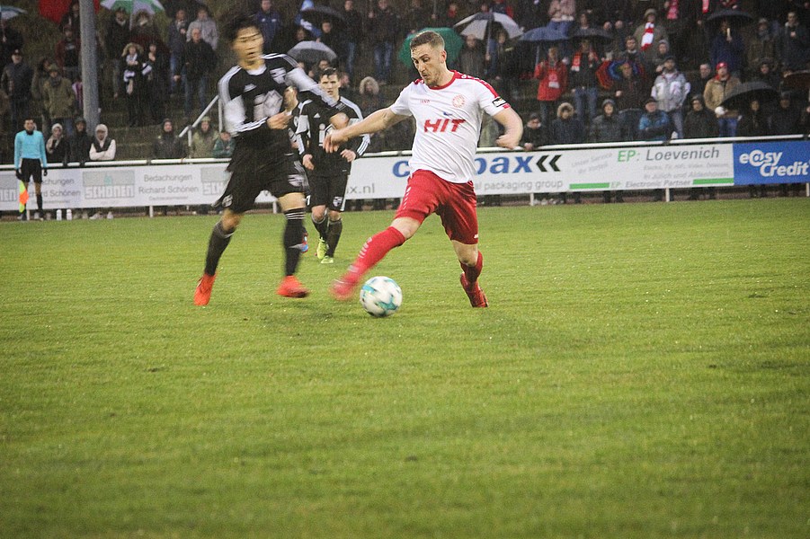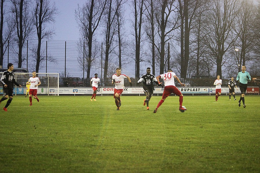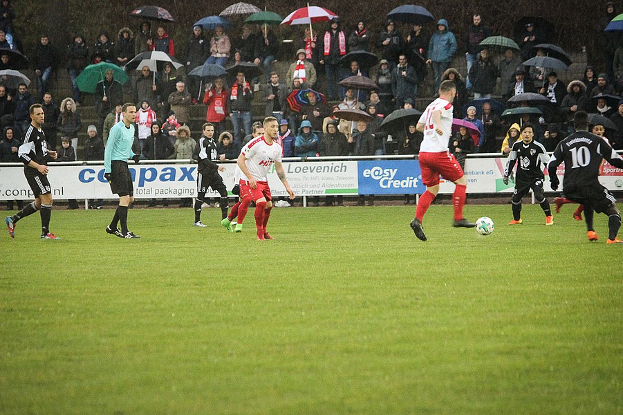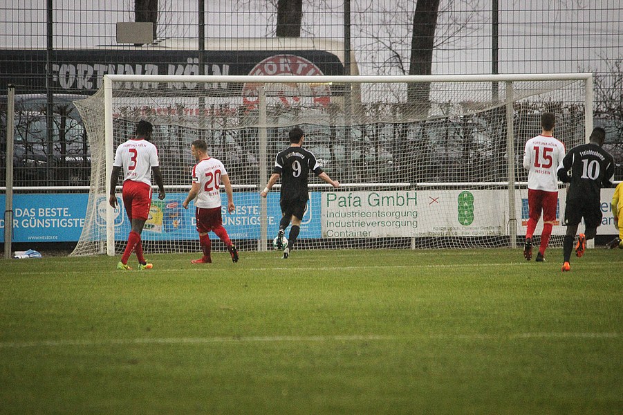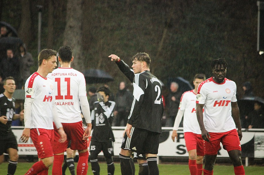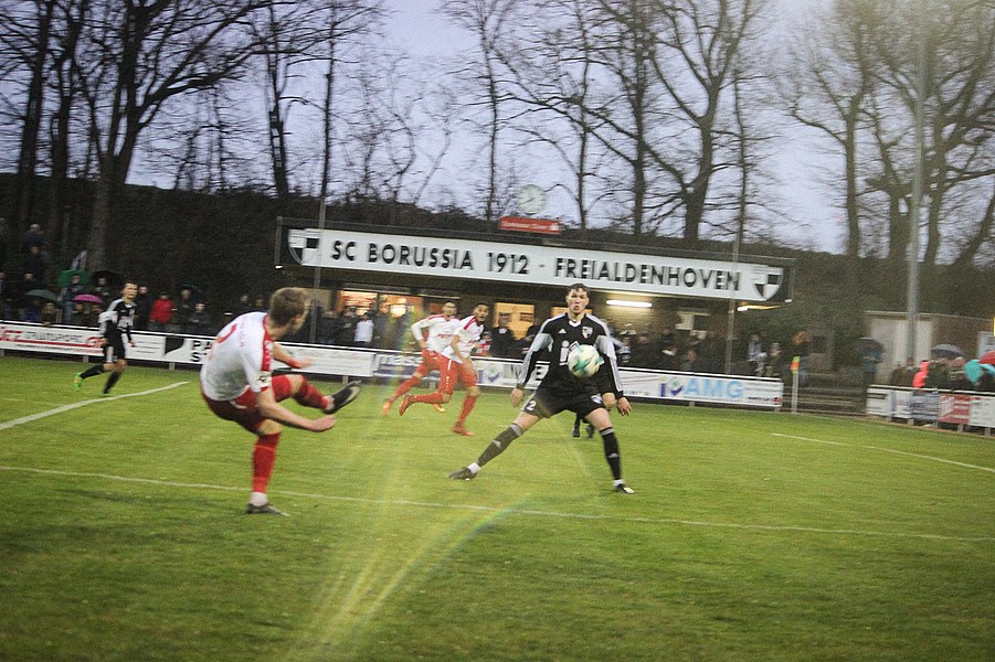 Für Borussia Freialdenhoven war es das absolute Highlightspiel, was man auch merkte. Die Hausherren liefen in der Anfangsphase früh an und lauerten auf Fehler der Kölner. Der Plan von Freialdenhoven ging dabei früh auf: Nico Brandenburger foulte Daescu im Strafraum, es gab Elfmeter. Simon verwandelte den Strafstoß mit Gewalt sicher in der Mitte (8.). Die Fortuna hatte am frühen Gegentreffer durchaus zu knabbern: Simon setzte sich gegen seine Gegenspieler durch. Sein Distanzschuss ging jedoch am Tor vorbei (16.). Erst Mitte der ersten Halbzeit kamen die Kölner besser in die Partie. Farrona Pulido zog aus 25 Metern ab und Werres im Tor von Freialdenhoven musste sich ganz lang machen (19.). Die beste Phase hatten die Gäste 20 Minuten vor Pausenpfiff. Als erstes wurde Kegels Schuss kurz vor der Linie abgeblockt (32.). Die nächste Riesenchance ließ danach nicht lange auf sich warten: Brandenburger zog aus der Distanz ab und traf die Latte, der Nachschuss von Scheu ging knapp am Tor vorbei (35.). Die Fortuna konnte vor der Pause nur noch einmal durch einen Freistoß von Kegel gefährlich werden, der knapp am Tor vrobei ging (44.). So ging es mit einer letztlich glücklichen Führung für Borussia Freialdenhoven in die Pause.