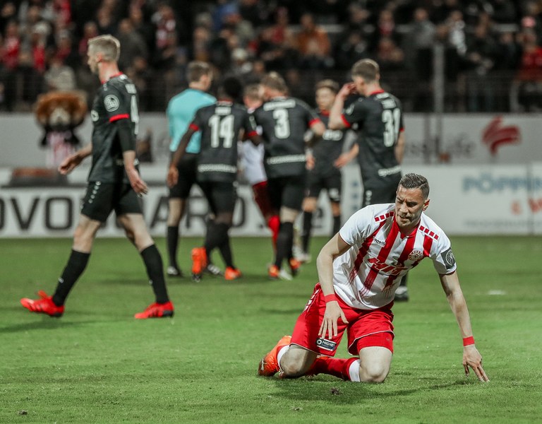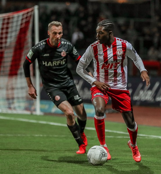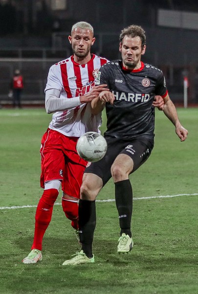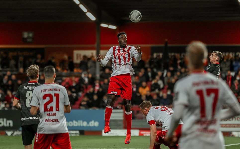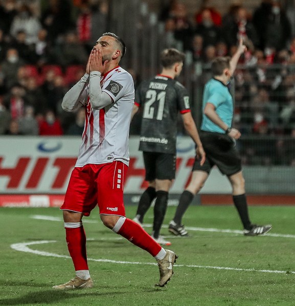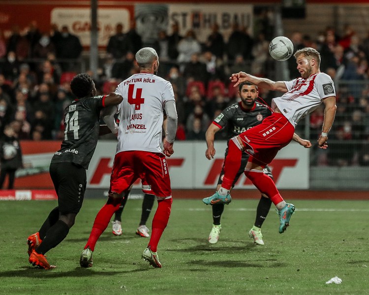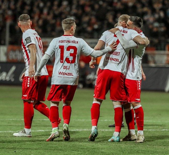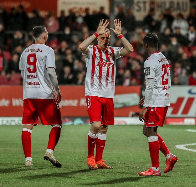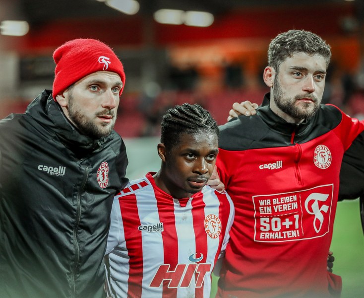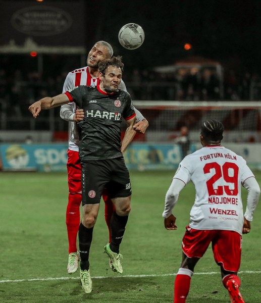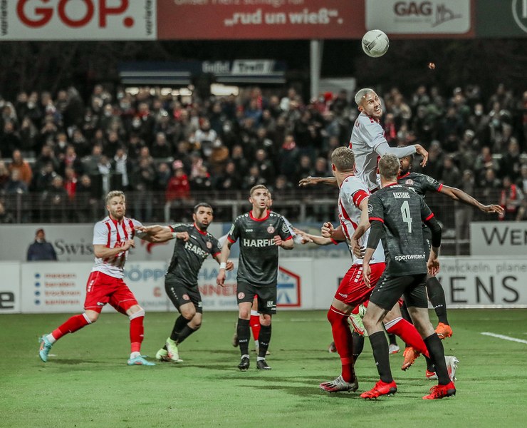 Der erste Treffer der Gäste, die mit viel Wucht vor das Tor von Fortuna-Schlussmann André Weis kamen, zeichnete sich schon frühzeitig ab. Über Isiah Young gelangten die Essener bereits nach sieben Minuten durchaus lukrativ vor den Fortuna-Kasten, doch André Weis war hellwach und parierte. In der 13. Minute ertönte der erste Jubelschrei der RWE-Anhänger an diesem Abend. Kefkir brachte einen Einwurf im Sechzehner an Engelmann, der aus gut 15 Metern verdeckt zum Schuss kam und Weis keine Chance ließ. Der frühe Gegentreffer vermachte den Eindruck, dass die Fortuna nun wacher war und sich mehr nach vorn zutraute. So war es Najar, der zunächst mehrere Gegenspieler aussteigen ließ und in einer der nächsten Aktionen nur noch durch ein elfmeterwürdiges Foul von Young gestoppt werden konnte. Sascha Marquet trat zum fälligen Strafstoß an und verwandelte diesen sicher (26.Min). Die Fortunen waren zurück im Spiel und hatten die Führung egalisiert. Alles stand wieder auf null und die Freude bei den Anhängern aus der Südstadt war riesig, aber hielt nicht lange. Quasi im Gegenzug nutze Isiah Young einen Stellungsfehler und schob zum erneuten Führungstreffer für die Essener ein (28.Min). Die Jungs von Alexander Ende versuchten viel, doch in der ersten Hälfte fehlte das Glück im Abschluss. RWE gelang es einen Gang hochzuschalten und dem Spiel ihren Stempel aufzudrücken, schaffte es aber nicht den starken Keeper André Weis erneut zu bezwingen. Damit ging es mit einem knappen Rückstand in die Pause in der Alexander Ende einmal wechselte. Der gelb vorbelastete Mittelfeldstratege Maik Kegel verließ den Platz und wurde durch Offensivmann Mike Owusu ersetzt. Die Südstädter kamen mit deutlich mehr Schwung aus der Kabine und hatten durch Batarilo (50.Min.) und Owusu (63.Min) gute Chancen auf den Ausgleichstreffer. Diesen erzielte Suheyel Najar nach einem traumhaften Freistoß ins rechte Eck (74.Min). Es ertönte das zweite Mal an diesem Abend die Tormusik und die Fortuna-Anhänger waren von dem erneuten Comeback gegen den Spitzenreiter begeistert. Den Gästen merkte man den unbedingten Willen dieses Spiel zu gewinnen an, weshalb sie weiter Druck auf das Fortuna-Tor ausübten. Schlussmann Weis parierte erneut glänzend. Doch beim Schuss vom eingewechselten Kleinsorge war er erneut machtlos (83.Min). DieFortunen gaben aber bekanntlich niemals auf und erzielten durch Dominik Lanius nur eine Minute nach dem Gegentreffer den 3:3 Endstand. Nach wahnsinnigen 90 Minuten, die für jeden neutralen Fußballfan ein Genuss waren, trennten sich die beiden Teams mit einem 3:3 Unentschieden. Vorallem die Mentalität dieser Truppe, drei Mal zurückzuliegen und anschließend wiederzukommen, verdient Riesenrespekt. So können wir es kaum erwarten diesem Team schon am kommenden Samstag erneut im Südstadion zuzuschauen und freuen uns auf mehr!
