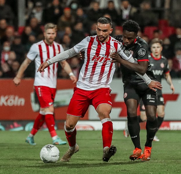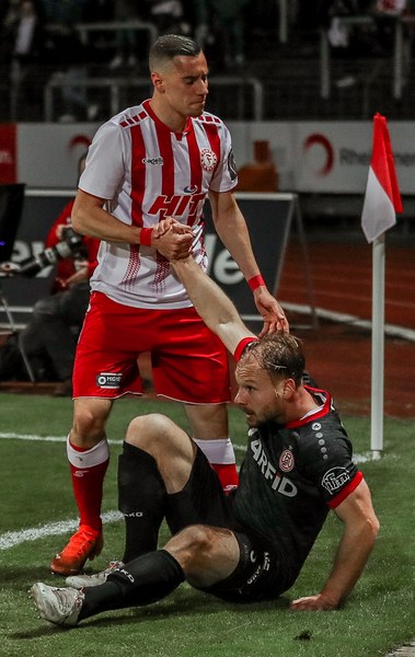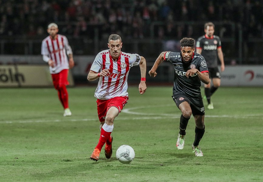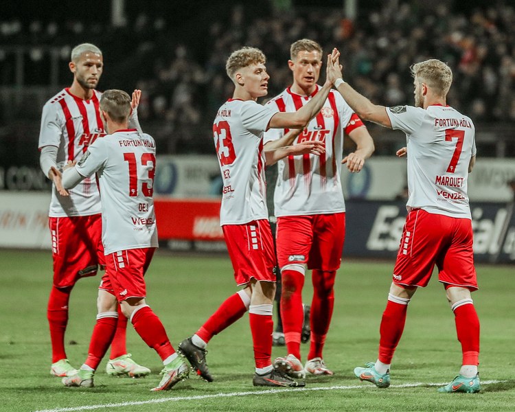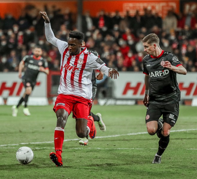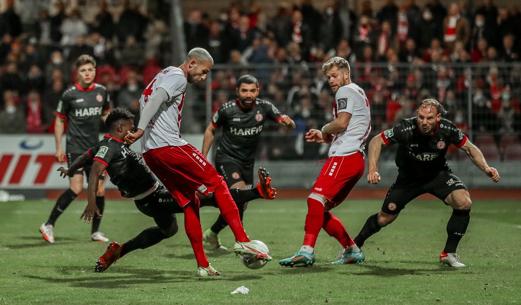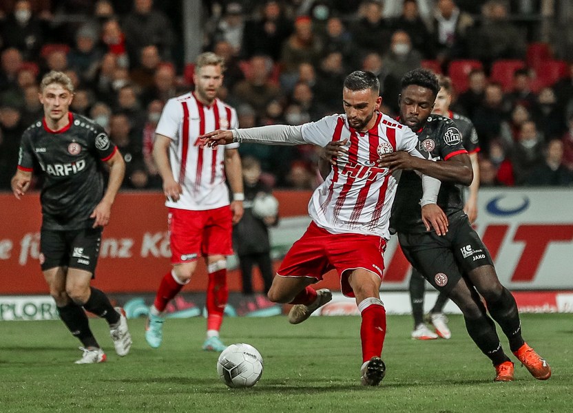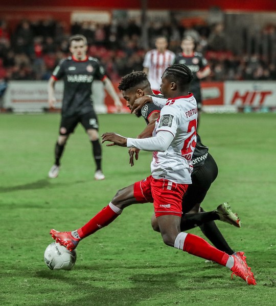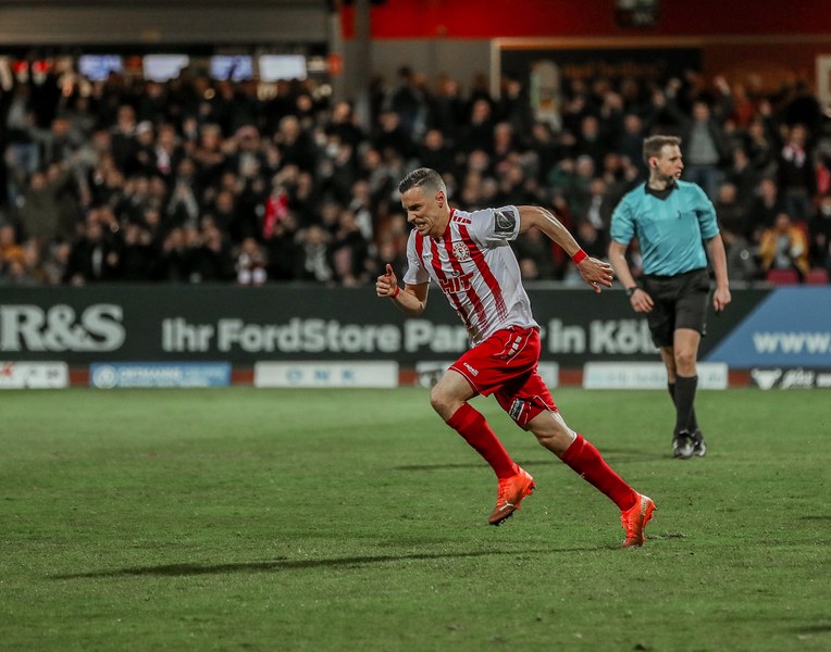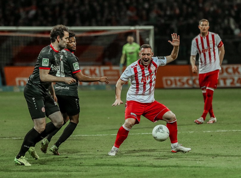Der erste Treffer der Gäste, die mit viel Wucht vor das Tor von Fortuna-Schlussmann André Weis kamen, zeichnete sich schon frühzeitig ab. Über Isiah Young gelangten die Essener bereits nach sieben Minuten durchaus lukrativ vor den Fortuna-Kasten, doch André Weis war hellwach und parierte. In der 13. Minute ertönte der erste Jubelschrei der RWE-Anhänger an diesem Abend. Kefkir brachte einen Einwurf im Sechzehner an Engelmann, der aus gut 15 Metern verdeckt zum Schuss kam und Weis keine Chance ließ. Der frühe Gegentreffer vermachte den Eindruck, dass die Fortuna nun wacher war und sich mehr nach vorn zutraute. So war es Najar, der zunächst mehrere Gegenspieler aussteigen ließ und in einer der nächsten Aktionen nur noch durch ein elfmeterwürdiges Foul von Young gestoppt werden konnte. Sascha Marquet trat zum fälligen Strafstoß an und verwandelte diesen sicher (26.Min). Die Fortunen waren zurück im Spiel und hatten die Führung egalisiert. Alles stand wieder auf null und die Freude bei den Anhängern aus der Südstadt war riesig, aber hielt nicht lange. Quasi im Gegenzug nutze Isiah Young einen Stellungsfehler und schob zum erneuten Führungstreffer für die Essener ein (28.Min). Die Jungs von Alexander Ende versuchten viel, doch in der ersten Hälfte fehlte das Glück im Abschluss. RWE gelang es einen Gang hochzuschalten und dem Spiel ihren Stempel aufzudrücken, schaffte es aber nicht den starken Keeper André Weis erneut zu bezwingen. Damit ging es mit einem knappen Rückstand in die Pause in der Alexander Ende einmal wechselte. Der gelb vorbelastete Mittelfeldstratege Maik Kegel verließ den Platz und wurde durch Offensivmann Mike Owusu ersetzt. Die Südstädter kamen mit deutlich mehr Schwung aus der Kabine und hatten durch Batarilo (50.Min.) und Owusu (63.Min) gute Chancen auf den Ausgleichstreffer. Diesen erzielte Suheyel Najar nach einem traumhaften Freistoß ins rechte Eck (74.Min). Es ertönte das zweite Mal an diesem Abend die Tormusik und die Fortuna-Anhänger waren von dem erneuten Comeback gegen den Spitzenreiter begeistert. Den Gästen merkte man den unbedingten Willen dieses Spiel zu gewinnen an, weshalb sie weiter Druck auf das Fortuna-Tor ausübten. Schlussmann Weis parierte erneut glänzend. Doch beim Schuss vom eingewechselten Kleinsorge war er erneut machtlos (83.Min). DieFortunen gaben aber bekanntlich niemals auf und erzielten durch Dominik Lanius nur eine Minute nach dem Gegentreffer den 3:3 Endstand. Nach wahnsinnigen 90 Minuten, die für jeden neutralen Fußballfan ein Genuss waren, trennten sich die beiden Teams mit einem 3:3 Unentschieden. Vorallem die Mentalität dieser Truppe, drei Mal zurückzuliegen und anschließend wiederzukommen, verdient Riesenrespekt. So können wir es kaum erwarten diesem Team schon am kommenden Samstag erneut im Südstadion zuzuschauen und freuen uns auf mehr!