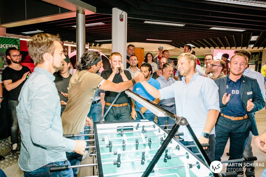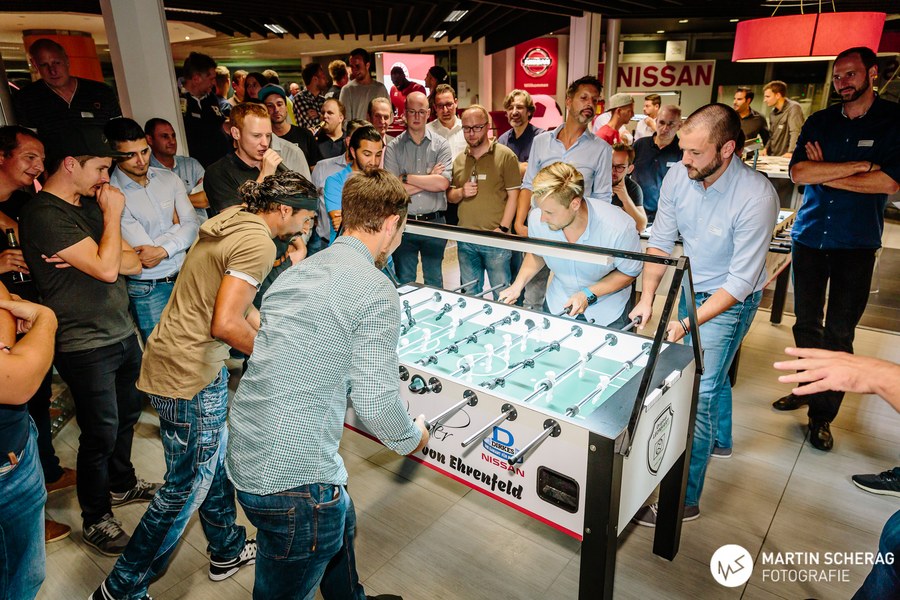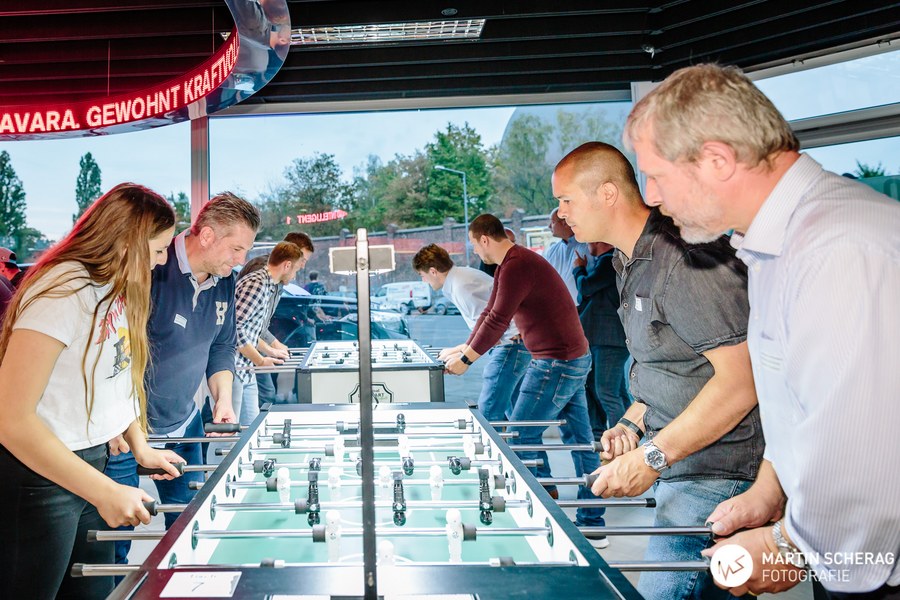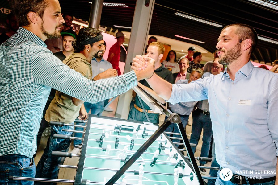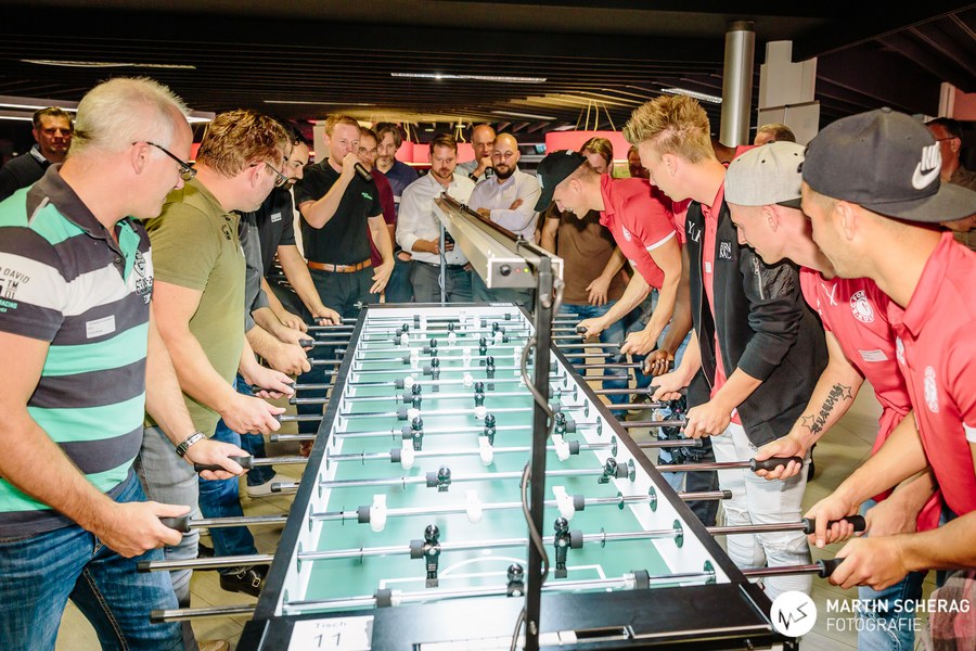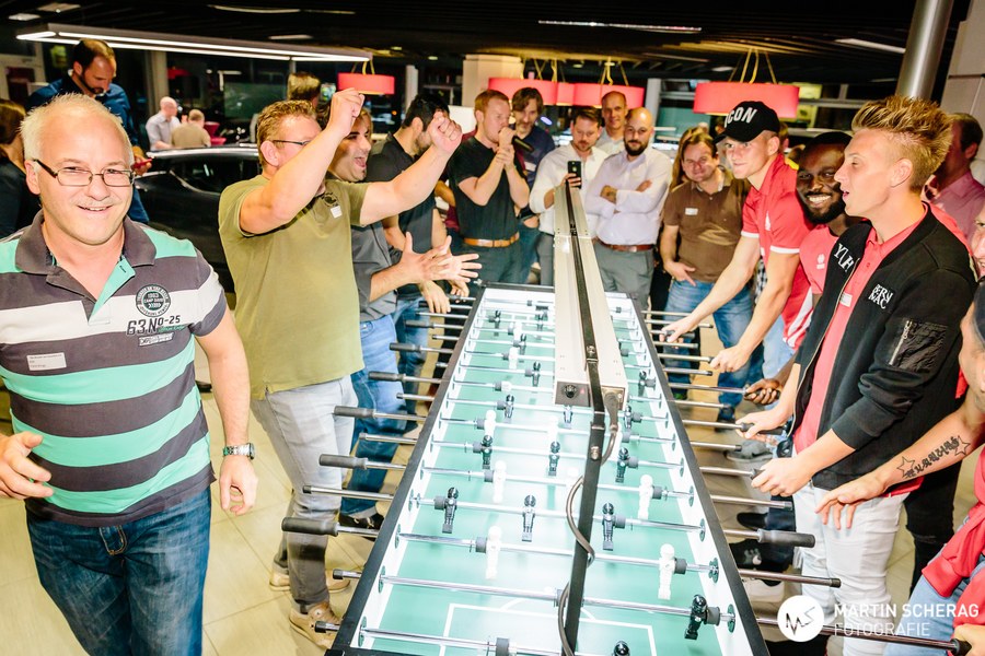 Am Donnerstagabend öffnete der langjährige Fortuna-Partner Autohaus Dirkes die Pforten seines Showrooms, in dem das diesjährige Kicker-Turnier zum dritten Mal in Folge ausgetragen werden sollte. Schon bevor die erste Spielrunde des Turniers eröffnet wurde, konnten sich die anwesenden Vertreter der Partnerunternehmen bereits an den von meinkicker.com aufgestellten Tischkickern einspielen oder sich einfach bei kühlen Getränken von Fortuna-Partnern Gaffel und Coca-Cola untereinander vernetzen. Gemeinsam mit Elmar Vogel, Leiter Marketing Automobilgruppe Dirkes GmbH eröffnete Benjamin Bruns, Leiter Sponsoring und Vertrieb Fortuna Köln offiziell den Abend. Ihm zur Seite standen auch die Fortuna-Profis Bernard Kyere, Okan Kurt, Dominik Ernst, Nico Brandenburger und auch der zur Zeit verletzte Innenverteidiger Moritz Fritz ließ sich den Spaß an diesem Abend nicht nehmen. Die insgesamt 44 teilnehmenden Mannschaften spielten in fünf Spielrunden à fünf Minuten um die Teilnahme an der Endrunde. Zwar gab es an manchen Tischen deutliche Ergebnisse, doch bereits in der Vorrunde wurden viele Duelle erst kurz vor Ende der Spielzeit entschieden. Nach Abschluss der Vorrunde zogen die besten 16 Teams in die Endrunde ein. Unter ihnen fand sich auch das Fortuna-Duo Kurt und Fritz wieder, die eine überzeugende Leistung in den ersten fünf Spielen zeigten und sich die Teilnahme an den K.O.-Spielen verdient hatten. Im Achtelfinale schieden die beiden Profis aber aus. Um die anwesenden Tischfußballer kulinarisch zu versorgen und bei Kraft zu halten, bereitete das Team von Mad Dogs diverse Hot-Dog-Variationen vor. Einen verdienten 3. Platz erkämpfte sich das Team von Pixum. In einem packenden Finale, das erst drei Sekunden vor Schluss in der Verlängerung entschieden wurde, setzte sich der Favorit und mermalige Sieger ADAC Nordrhein gegen das Team von Bodystreet durch. Mit großer Freude nahmen die Verteter des ADAC die Eintrittskarten für die Championsleague-Partie zwischen Borussia Dortmund und Atlético Madrid entgegen. Elmar Vogel und Benjamin Bruns zeigten sich in ihren Abschlussworten hochzufrieden mit dem Ablauf und der Organisation des "Wunders von Ehrenfeld 3.0" und freuten sich über die im Vergleich zum letzten Jahr gestiegenen Teilnehmerzahl.