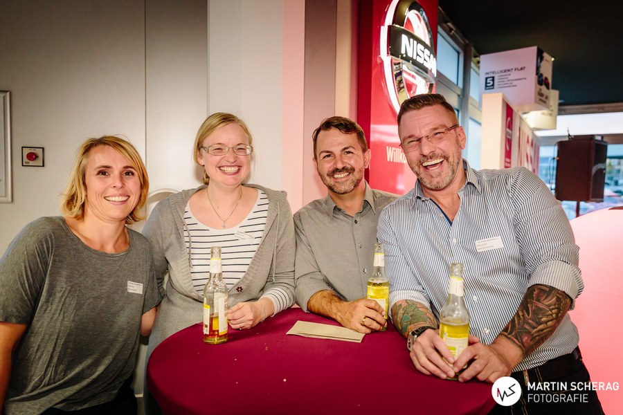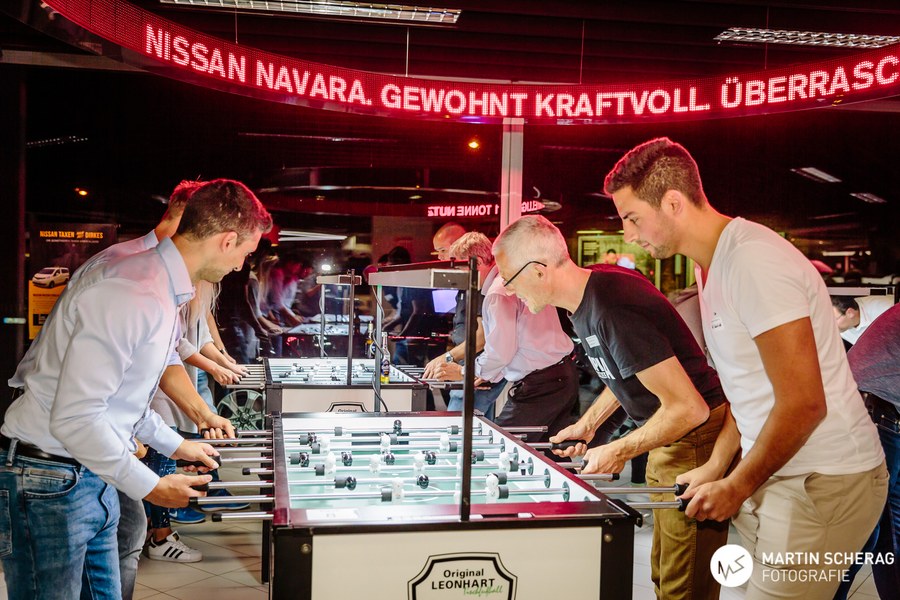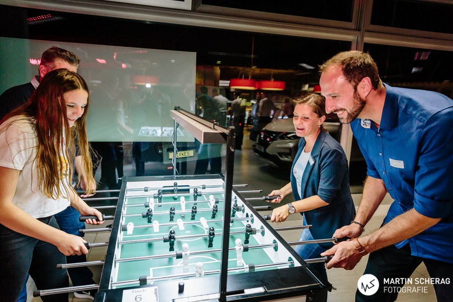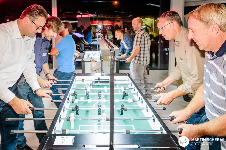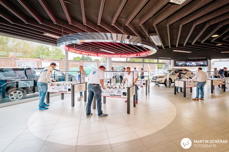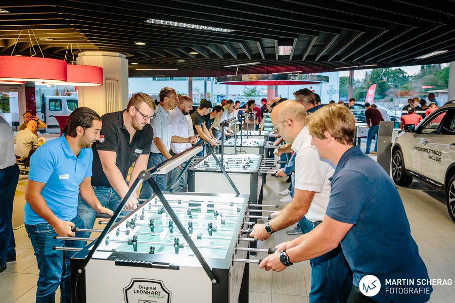 Am Donnerstagabend öffnete der langjährige Fortuna-Partner Autohaus Dirkes die Pforten seines Showrooms, in dem das diesjährige Kicker-Turnier zum dritten Mal in Folge ausgetragen werden sollte. Schon bevor die erste Spielrunde des Turniers eröffnet wurde, konnten sich die anwesenden Vertreter der Partnerunternehmen bereits an den von meinkicker.com aufgestellten Tischkickern einspielen oder sich einfach bei kühlen Getränken von Fortuna-Partnern Gaffel und Coca-Cola untereinander vernetzen. Gemeinsam mit Elmar Vogel, Leiter Marketing Automobilgruppe Dirkes GmbH eröffnete Benjamin Bruns, Leiter Sponsoring und Vertrieb Fortuna Köln offiziell den Abend. Ihm zur Seite standen auch die Fortuna-Profis Bernard Kyere, Okan Kurt, Dominik Ernst, Nico Brandenburger und auch der zur Zeit verletzte Innenverteidiger Moritz Fritz ließ sich den Spaß an diesem Abend nicht nehmen. Die insgesamt 44 teilnehmenden Mannschaften spielten in fünf Spielrunden à fünf Minuten um die Teilnahme an der Endrunde. Zwar gab es an manchen Tischen deutliche Ergebnisse, doch bereits in der Vorrunde wurden viele Duelle erst kurz vor Ende der Spielzeit entschieden. Nach Abschluss der Vorrunde zogen die besten 16 Teams in die Endrunde ein. Unter ihnen fand sich auch das Fortuna-Duo Kurt und Fritz wieder, die eine überzeugende Leistung in den ersten fünf Spielen zeigten und sich die Teilnahme an den K.O.-Spielen verdient hatten. Im Achtelfinale schieden die beiden Profis aber aus. Um die anwesenden Tischfußballer kulinarisch zu versorgen und bei Kraft zu halten, bereitete das Team von Mad Dogs diverse Hot-Dog-Variationen vor. Einen verdienten 3. Platz erkämpfte sich das Team von Pixum. In einem packenden Finale, das erst drei Sekunden vor Schluss in der Verlängerung entschieden wurde, setzte sich der Favorit und mermalige Sieger ADAC Nordrhein gegen das Team von Bodystreet durch. Mit großer Freude nahmen die Verteter des ADAC die Eintrittskarten für die Championsleague-Partie zwischen Borussia Dortmund und Atlético Madrid entgegen. Elmar Vogel und Benjamin Bruns zeigten sich in ihren Abschlussworten hochzufrieden mit dem Ablauf und der Organisation des "Wunders von Ehrenfeld 3.0" und freuten sich über die im Vergleich zum letzten Jahr gestiegenen Teilnehmerzahl.