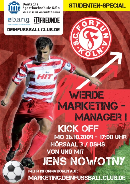 Die deinfussballclub.de DFC GmbH kooperiert ein Mal mehr mit der Deutschen Sporthochschule Köln. Die Zusammenarbeit, die sich bisher auf die leistungsdiagnostischen Tests vor der Spielzeit beschränkt, wird nun deutlich erweitert. Gemeinsam mit der Kölner  Agentur B.A.N.G und natürlich dem sportlichen Berater Jens Nowotny werden ab heute interessierte Studentinnen und Studenten gesucht, die Spaß daran haben, innovative Marketingkonzepte für Fortuna Köln zu entwickeln. Die Auftaktveranstaltung findet heute um 17 Uhr in der Deutschen Sporthochschule statt.