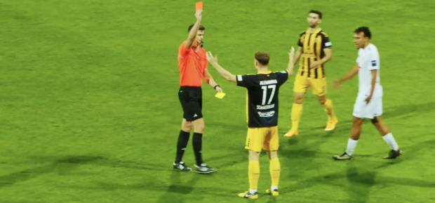 Kaum war das Spiel wieder aufgenommen, hatte Aachen einen Mann weniger auf dem Feld. Der bereits verwarnte Julian Schwermann trat den Ball nach dem Pfiff des Schiedsrichters ein paar Meter weg und sah die Ampelkarte (28.). Letztlich spielte diese Hinausstellung den Aachener aber in die Karten. „Fortuna war spielerisch klar besser. Das Spiel steht und fällt mit der Gelb-Roten-Karte, dadurch wird es eine Abwehrschlacht. Wir schießen in der ersten Hälfte einmal aufs Tor und treffen und in der zweiten Halbzeit vergeben wir einen Konter. Das war es. Aber wir haben Mannhaftigkeit und Zweikampfstärke in Perfektion gezeigt heute“, sagte Gäste-Trainer Heiner Backhaus.
