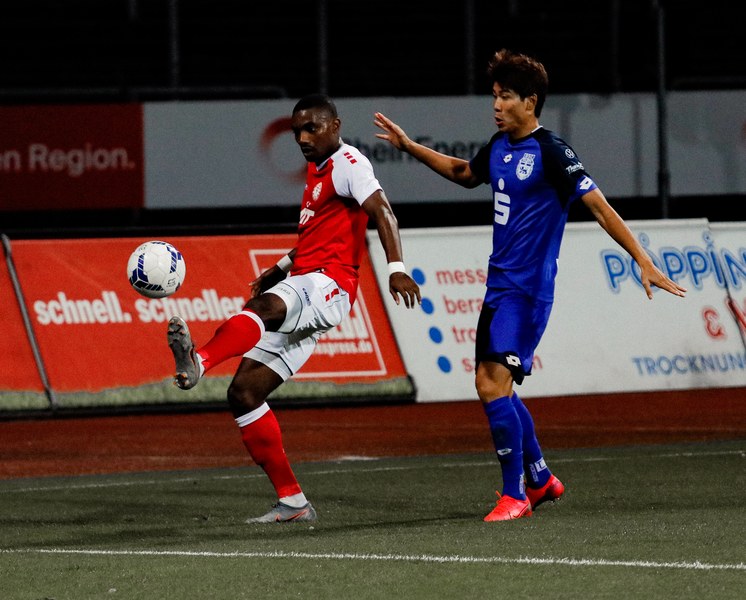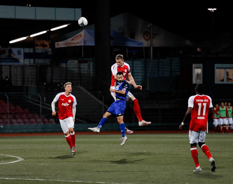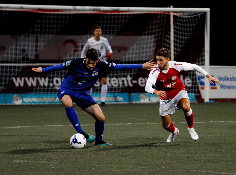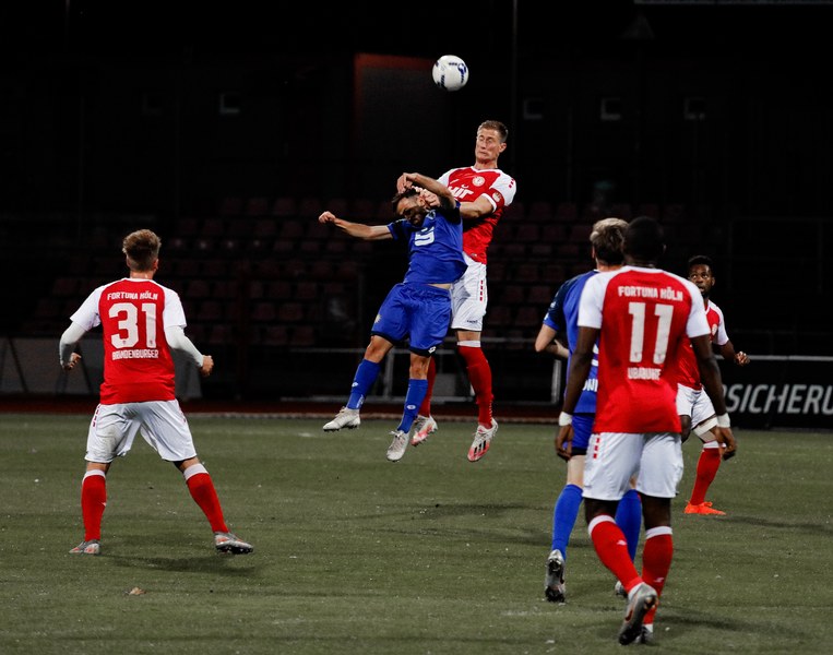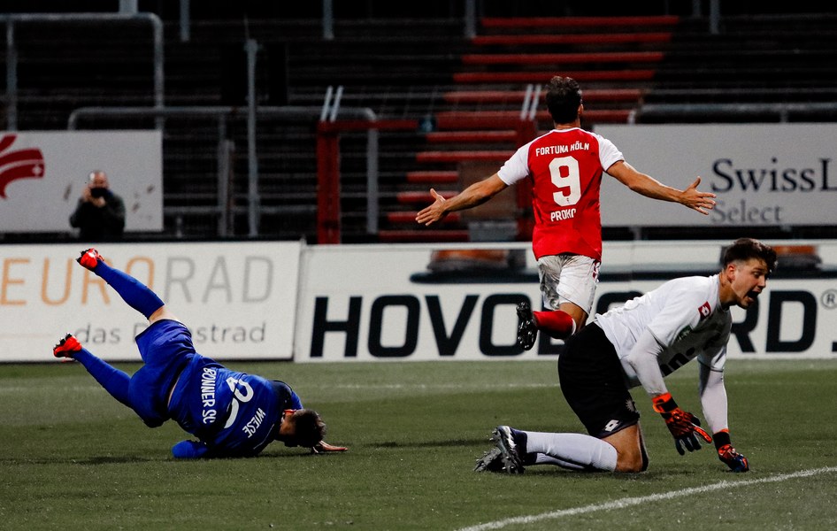 Im Vergleich zum letzten Pflichtspiel am Samstag in Wiedenbrück gab es drei Änderungen in der Startelf: Für Martin Velichkov, Franko Uzelac und Mike Owusu (alle krankheitsbeding) standen Paul Schünemann, Noe Baba und Roma Prokoph in der Anfangsformation. Nach 15 Minuten Verspätung startete dann das rheinische Derby. Die Anfangsminuten gehörten ballbesitzmäßig zwar der Fortuna, jedoch war es kein attraktives Fußballspiel der Südstädter. Während sich die Bonner mit dem gesamten Team hauptsächlich in der eigenen Hälfte bewegten, kombinierten sich die Fortunen zunächst durch die dichten Abwehrreihen, kamen allerdings nicht gefährlich in die Nähe des Sechzehners von Keeper Jonas Hupe. Je länger das Spiel andauerte, desto weiter rückten die Gäste nach vorn und sicherten sich so mehr und mehr Spielanteile. So zwangen sie Poggenberg in der 17. Minute zu einem riskanten Rückpass auf Paul Schünemann, der allerdings hellwach war und das Spielgerät mit einer Grätsche kurz vor der Linie klärte. In der 23. Minute sah es zunächst so aus, als kämen die Fortunen vor das Tor von Jonas Hupe, als Günther-Schmidt den Ball in Richtung Prokoph steckte, doch Marcel Damaschek fing den Ball ab und schickte Burak Gencal. Dieser war gedankenschnell, nutzte einen Abstimmungsfehler zwischen Baba und Löhden, tauchte vollkommen frei vor Schünemann auf und traf zum 0:1 für die Gäste. Fast im Gegenzug setzte sich Roman Prokoph gegen Bonns Kapitän David Winke durch und spielte den Ball auf den im Fünfer stehenden Francis Ubabuike, der allerdings nicht zum Abschluss kam und somit nicht die direkte Antwort geben konnte. Bereits nach 33 Minuten musste der Bonner SC verletzungsbedingt das erste Mal wechseln. Masaaki Takahara betrat für Marcel Kaiser den Platz. Auf der rechten Seite setzte sich Nico Ochojski bis zur Grundlinie durch und brachte eine Flanke an den langen Pfosten, die für viel Gefahr und Unordnung in der Bonner Hintermannschaft sorgte, letztlich aber noch geklärt wurde. Nach 40 gespielten Minuten war Roman Prokoph zur Stelle und bescherte den Fortunen den verdienten Ausgleich. Jannik Löhden blieb nach einem Freistoß vorne und verlängerte eine Flanke von Nico Ochojski auf den freistehenden Prokoph, der per Fuß vollendete. Kurz vor der Halbzeitpause fasste sich Francis Ubabuike ein Herz, zog aus 20 Minuten auf das Bonner Tor ab und versenkte den Ball in den Maschen. Mit dem Jubel über das Tor schickte die Mannschaft einen Gruß an ihren Betreuer Matthias Schäfer raus, der sich derzeit im Krankenhaus befindet. Nach dem Treffer pfiff der Unparteiische zur Pause.