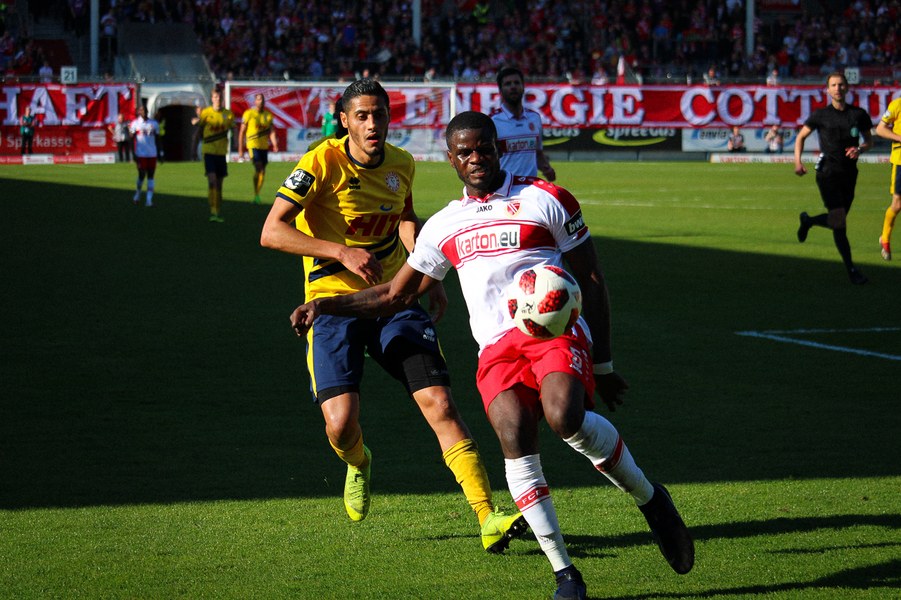Doch das Heimteam spielte sich in den letzten Minuten noch einmal in einen echten Rausch. In der 80. Minute egalisierte Fabian Holthaus den Rückstand aus Cottbusser Sicht. Sein Freistoß mit dem linken Fuß aus 25 Metern schlug oben rechts im Gehäuse der Kölner ein. In der 86. Minute folgte sogar die Führung für die Gastgeber. Streli Mamba stand plötzlich im Fünfmeterraum frei und schob die Hereingabe von der rechten Seite freistehend aus kurzer Distanz am linken Pfosten ein. Kurz danach traf Cottbus sogar noch einmal die Latte. Das Spiel war entschieden.