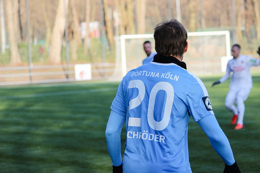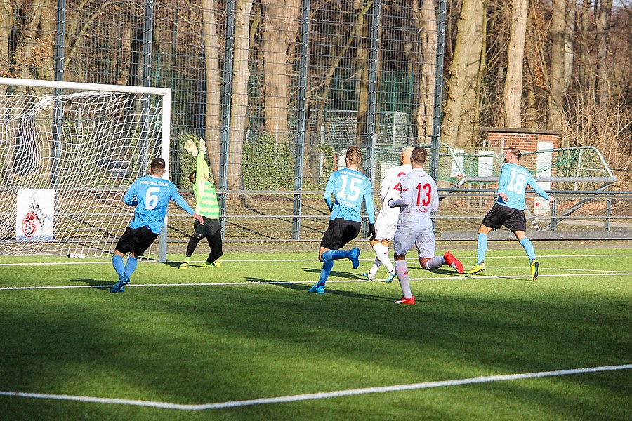 Vor knapp 50 Trainingskiebitzen entwickelte sich eine offene Anfangsphase. Die Fortuna versuchte im Block früh zu stören und schob durchaus hoch. Speziell über rechte Seite konnte Flottmann einige Ballgewinne provozieren. Danach suchte man den direkten Weg nach vorne. Es fehlte aber noch die Durchschlagskraft. Trotzdem enstanden aus Umschaltsiuationen die besten Szenen, als Bender nach einem schnellen Einwurf im Strafraum keinen Abnehmer fand und kurz darauf nach einem Konter über Souza Dahmani nicht zum Schuss kam (14./19.). Der FC ließ nach einem Fehler der Fortuna mit einem Schuss von Ban mal offensiv aufhorchen (21.). Die Südstädter wurde aber aktiver. Speziell Souza entwickelte sich zum Ativposten und versuchte auf Links Betrieb zu machen. Ein Freistoß des Südstadt-Brasilianers blieb aber das einzige Nennenswerte (28.). Stattdessen verbuchte der FC die beste Chance, als Hildebrandt nach einer Ecke am Pfosten scheiterte (32.). Danach wurde es ruhiger auf dem Feld, bis zur 42. Minute: Da kam der Regionalligist nach einem Ballgewinn in Person von Ban bis zur Strafraumkante. Der Ex-Fortune schloss trocken ab und legte den Ball direkt neben den Pfosten - keine Chance für Poggenborg. Die Fortuna hatte zwar die Chance zum schnellen Ausgleich, aber Flottmann köpfte eine Bender-Flanke vorbei. So blieb es beim 0:1 zur Pause.