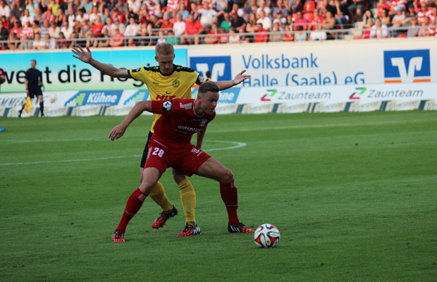 Vor 8.568 Zuschauern im Erdgas Sportpark sichert sich die Fortuna nach einem starken Auswärtssieg die ersten drei Punkte in der 3. Liga. Dabei fand der Hallesche FC zu Beginn zunächst besser in die Partie und konnte sich früh Chancen erspielen. Die Fortuna arbeitete sich jedoch über eine kompakte Defensive zunehmend besser in die Partie und meldete die Offensive der Gastgeber dabei nahezu ab. Nachdem Halle durch einen Flugkopfball von Brügmann die beste Chance zur Führung liegen ließ (30.), machte es die Fortuna auf der anderen Seite besser: Einen weiten Einwurf konnte Keeper Kleinheider nicht richtig klären, sodass Fink den Ball ins leere Tor schoss (33.). Das Tor spielte der Fortuna weiter in die Karten, die eine geschockte Halle-Elf zunächst kommen ließ, um dann blitzsauber zu kontern: Mit einem weiten Ball schickte Hörnig Kraus auf die Reise, der die Übersicht behielt und den mitgelaufenen Rahn bediente. Der Kölner schob den Ball schließlich frei vor Kleinheider souverän zum 2:0 ins Netz (41.). Der Hallesche FC drängte nach dem Seitenwechsel zwar noch einmal auf den schnellen Anschlusstreffer, kam aber nur selten zu zwingenden Möglichkeiten. Einzig Bertram traf nach einem Freistoß noch einmal die Latte (69.), während sich die Fortuna darauf beschränkte, die Führung zum ersten Sieg in der 3. Liga am Ende verdient über die Zeit zu bringen.