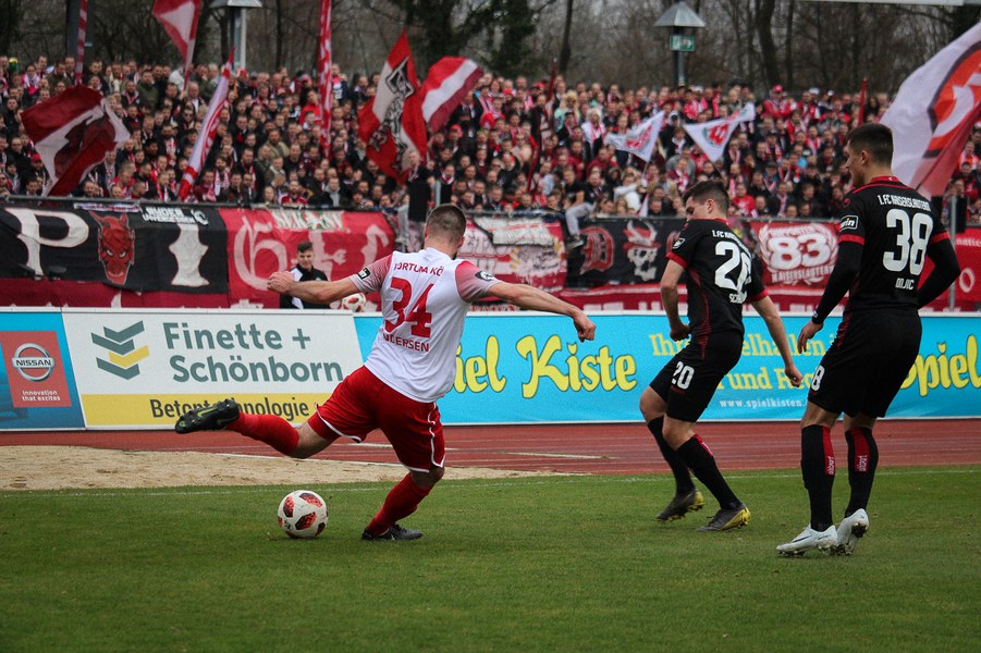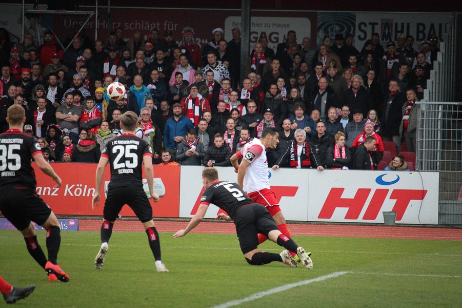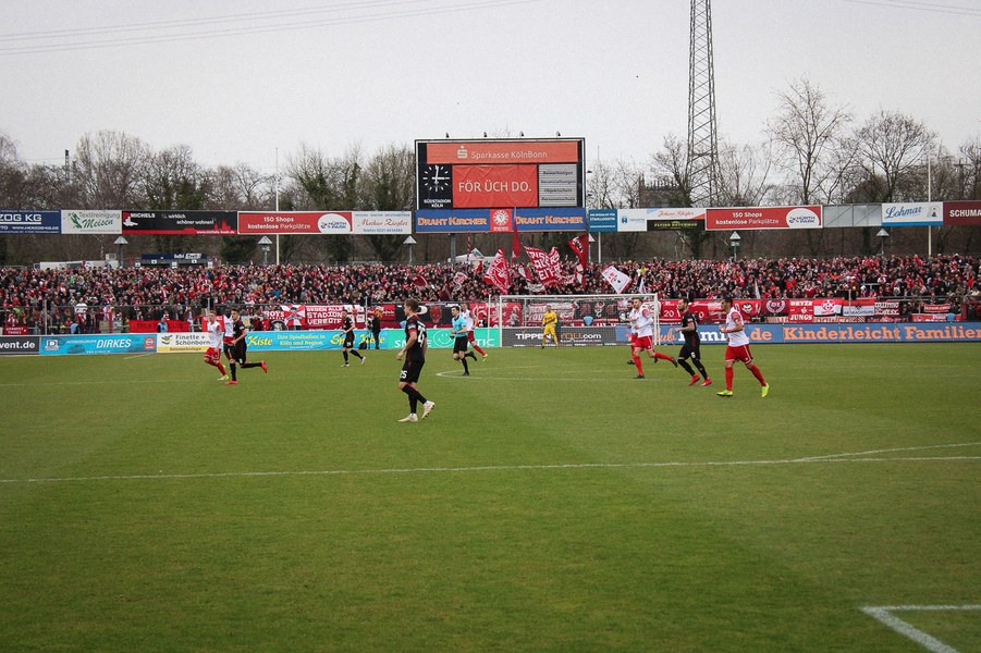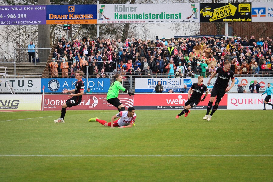 Fortuna Köln meldete sich gleich zu Beginn mit einer Doppelchance. Robin Scheu erkämpfte sich den Ball im Mittelfeld und spielte direkt in den Lauf von Hamdi Dahmani, der alleine auf Lennart Grill zulief. Der Kapitän scheiterte jedoch am ausgefahrenen Bein des Torhüters (2.). Nur eine Minute später ging Andersen über die linke Seite und spielte zurück an die Strafraumkante, an der Michael Eberwein lauerte, den Schuss aus der Distanz jedoch knapp neben den Pfosten setzte. In der 13 Spielminute machte Hamdi Dahmani es dann besser und versenkte den Ball nach Zuspiel von Michael Eberwein im langen Eck. Doch lange währte die Führung der Fortuna nicht. Christian Kühlwetter setzte zwei Minuten später die Uhren wieder auf Null und sorgte für den Ausgleich der Gäste. Es folgte ein offener Schlagabtausch im Kölner Südstadion, ehe ein Pfiff des Unparteiischen den Südstädtern einen Dämpfer verpasste. Schiedsrichter Florian Badstübner zeigte nach einem Foul an Kühlwetter auf den Punkt. Nikolai Rehnen war zwar noch am Ball, konnte aber nicht verhindern, dass der Schuss von Henrik Zuck hinter der Linie landete (27.). Das war aus Fortuna-Sicht bitter und kein Ergebnis, das den bisherigen Spielerlauf widerspiegelte. Auf der anderen Seite sorgte Andersen für den nächsten Abschluss der Fortuna. Nach einer Ecke zog er den Ball direkt auf das Tor, setzte das Spielgerät jedoch deutlich daneben. So ging es ohne weitere Tore in die Pause.
