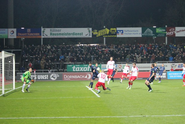 Bei kühlen Temperaturen brauchten beide Mannschaften zunächst ein paar Minuten, um sich warm zu spielen und suchten im ersten Pflichtspiel des Jahres ihre Sicherheit in den Abläufen. Dabei tastete sich die Fortuna im ungewohnten 3-5-2 langsam rein. Zwar hatte Jänicke den ersten Abschluss der Partie (5.). Mit einem Freistoß von Biada meldeten sich die Kölner aber ebenfalls an (13.). Kurz darauf war die Fortuna auf Betriebstemperatur: Nach einer Flanke von Andersen nickte Biada frei am zweiten Pfosten zum 1:0 ein (15.). In den Torjubel hinein erhöhte Königs nach Vorarbeit Dahmani frei vor Schuhen auf 2:0 (16.). Nur drei Minuten später brachte Kofler Dahmani im Strafraum zu Fall. Den fälligen Elfmeter zimmerte Königs in die Maschen (20.). Innerhalb von fünf Minuten erstürmte die Fortuna sich eine 3:0-Führung gegen Hansa. Nach einem Freistoß von Biada (30.) nahm die Fortuna zunächst den Fuß vom Gaspedal. Trotzdem kontrollierten die Kölner angetrieben von Andersen das Spiel. Speziell das bewegliche Offensivtrio Biada, Königs und Dahmani war für Rostock kaum zu packen. Zudem hatte man auch in der Defensiv Rostock im Griff. Trotzdem gelang den Gästen etwas überraschend der Anschlusstreffer: Aus 20 Metern setzte Jänicke einen Freistoß unhaltbar für Poggenborg in die Maschen (44.). Nach einem weiteren Jänicke-Freistoß (45.) ging es schießlich mit einer 3:1-Führung für die Fortuna in die Kabine, aber nicht mit 22 Spielern. So sah Kofler in der Pause gelb-rot, weil er sich zu energisch bei Schiedsrichter Wolfgang Stark beschwerte (45.+).