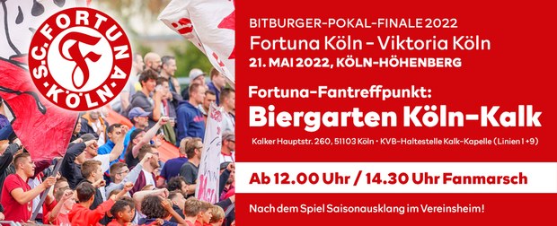 Am Samstag den 21. Mai 2022 rufen die Fans der Fortuna alle Fans und Sympathisanten des Traditionsklubs aus der Südstadt auf, sich ab 12 Uhr im Biergarten Köln-Kalk zum gemeinsamen Treffpunkt einzufinden und auf das anstehende Stadtduell im Pokalfinale einzustimmen. Ab 14:30 Uhr startet der Fanmarsch in Richtung des Sportpark Höhenberg.