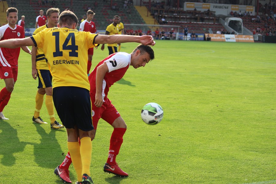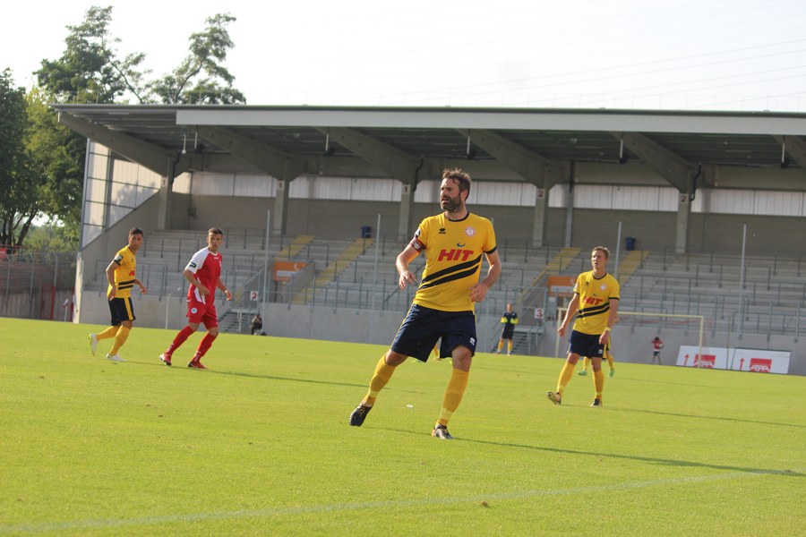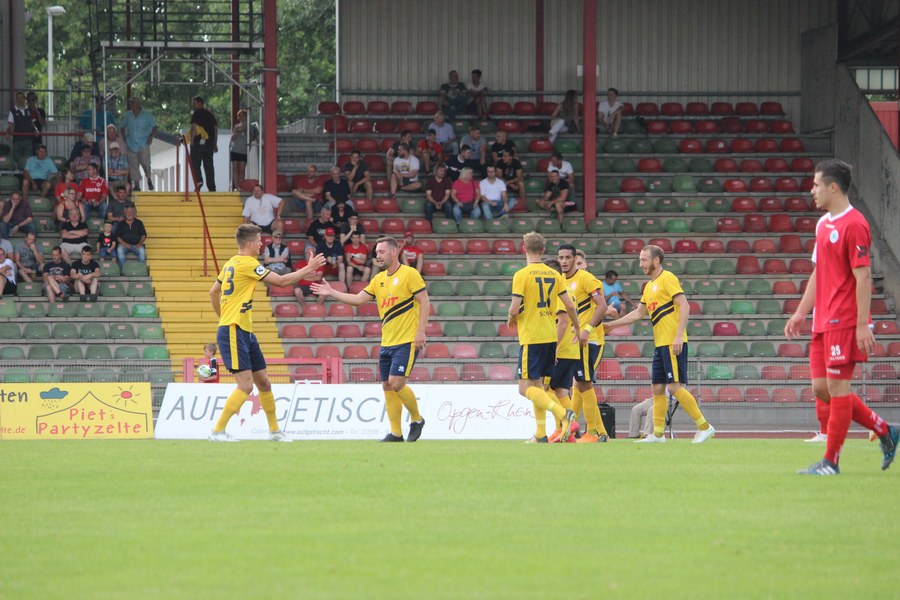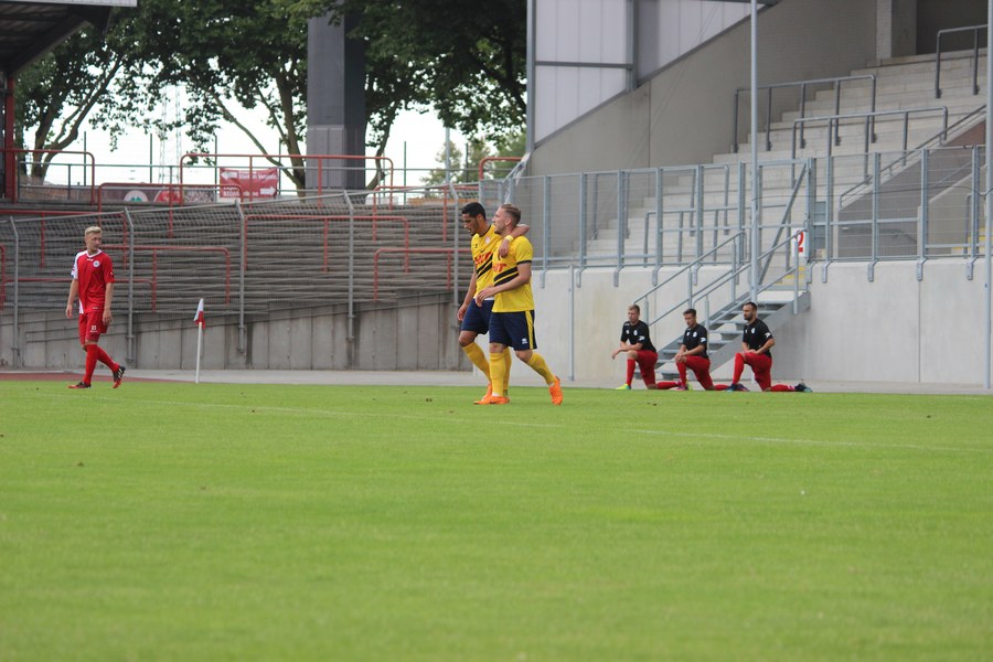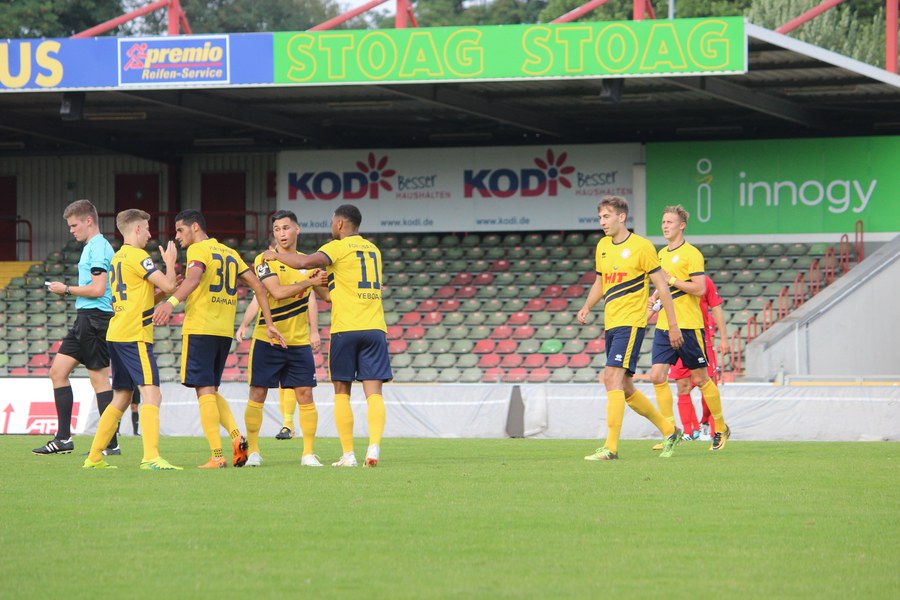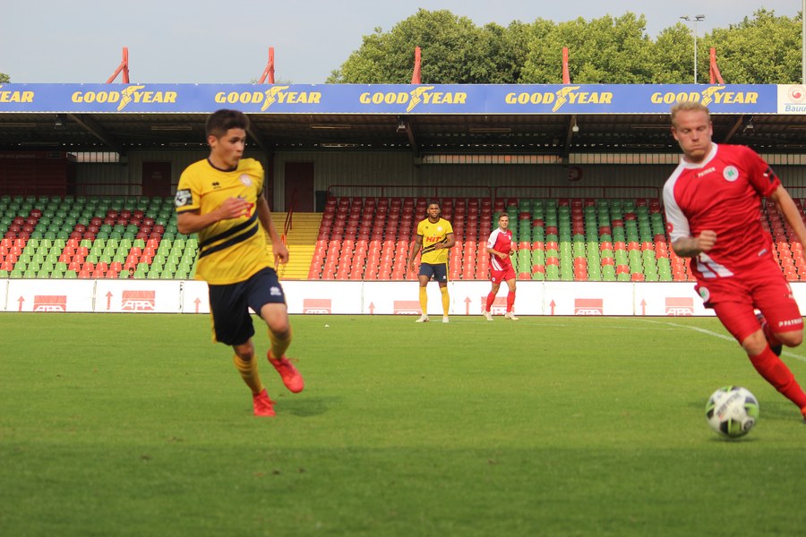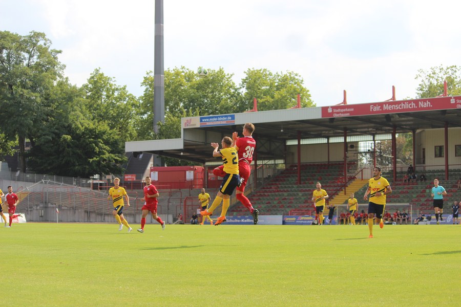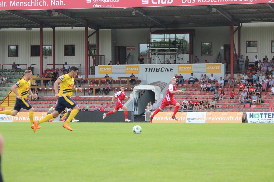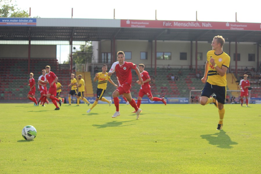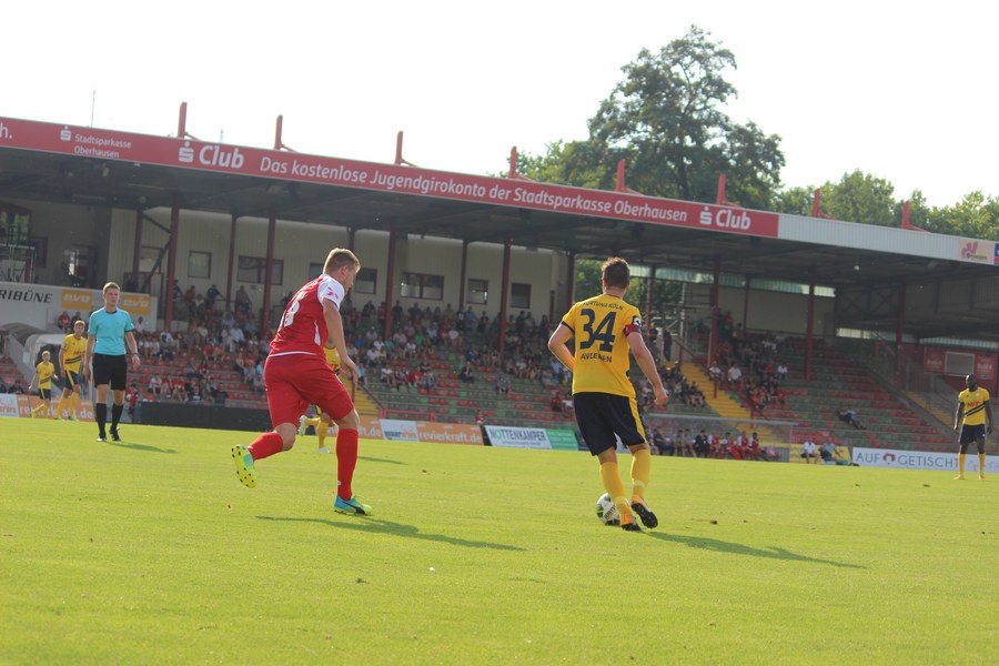 Die Mannschaften waren kaum aus der Kabine gekommen, da durfte die Fortuna schon jubeln. Kegel schickte Hartmann mit einem schnell ausgeführten Freistoß auf die Reise. Hartmann legte auf den mitgelaufenen Scheu zurück, der den Ball links unten im Tor platzierte (1.). In der Folge zeigte sich die Fortuna weiter aggressiv und lief die Gastgeber bereits sehr früh an. Zeitweise sogar so hoch, dass Hartmann den Schlussmann der Oberhausener foulte (7.). Generell war die Anfangsphase durch kleinere Fouls geprägt, da beide Mannschaften vollen Einsatz auf den Rasen brachten. Die Oberhausener wurden nach dem ersten Drittel der ersten Halbzeit mal gefährlich, als März aus der Distanz nur knapp den Kasten verfehlte (15.). Die später folgende Trinkpause tat der Fortuna offenbar gut. Nach einem rasanten Konter, den die Fortuna in erster Instanz nicht vollenden konnte, landete der Ball beim mittlerweile aufgerückten Kegel, der aus rund vierzehn Metern mit voller Kraft den Ball im Tor versenkte (26.). Die Fortuna zeigte sich weiter hellwach und legte kurz darauf nach, als Schiek mit druckvollen Pass über 40 Meter die gesamte Mannschaft von Rot-Weiß Oberhausen überraschte und Dahmani den Ball nach kurzer Mitnahme nur noch einschieben musste (30). Die Fortuna machte offensiv so gut wie alles richtig, vernachlässigte aber auch ihre Defensivaufgaben nicht. So kamen die Oberhausener erst kurz vor der Halbzeit durch Eggersglüß noch einmal zu einer Chance, als dieser aus zu spitzem Winkel an Rehnen scheiterte (41.). So ging es mit einem 3:0 aus Sicht der Fortuna in die Kabine.