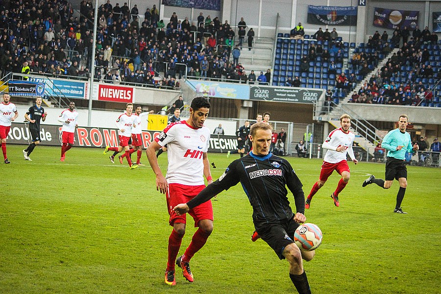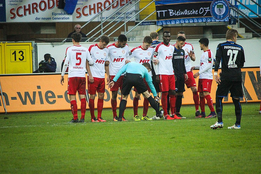 Die Südstädter kontrollierten mit der Führung im Rücken die Partie, auch weil Paderborn die Fortuna vor keine großen Probleme stellte. So versuchte wieder Dahmani mit einer Bogenlampe aus der Distanz, Kruse zu überraschen (30.). Aus dem Nichts hatte Paderborn dann aber die Chance zum Ausgleich, als Michel auf links entwischte. Seinen Querpass konnte Vucinovic aber gegen Poggenborg nicht vollenden (32.). Plötzlich lebten die Gastgeber aber wieder und hatten über Vucinovic und van der Biezen weitere Abschlüsse (37./40.). Nach einer Eckenserie verüasste schließlich Bertels im Gestocher den Ausgleich (41.). Die Souveränität der Fortuna war nun weg. Man brachte die Führung aber in die Kabine, bei Pfiffen der Paderborn-Fans.