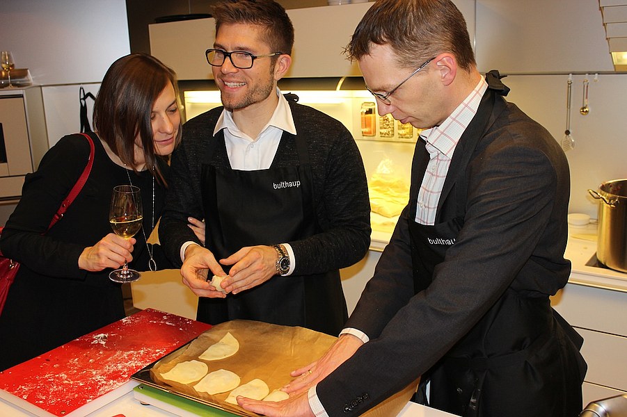 Neben dem Kochen stand vor allem der Kontakt zwischen den Partnern im Vordergrund: Während sich die Männer beim gemeinsamen Kochen näher kennenlernten, durften sich deren Begleitungen bei Sekt und Wein zurücklehnen. Anschließend wurde das fertige Menü gemeinsam genossen. „Wir möchten unseren Partnern mit solchen Abenden die Möglichkeit bieten, miteinander in Kontakt zu treten und sich immer weiter und besser zu vernetzen. Herr Vianden hat uns mit „bulthaup am Mediapark“ den perfekten Rahmen dafür geboten. Das war ein hochklassiger Anfang und wir freuen uns auf die nächsten Partnerevents“, zeigte sich auch Benjamin Bruns mit dem Kochevent sehr zufrieden.