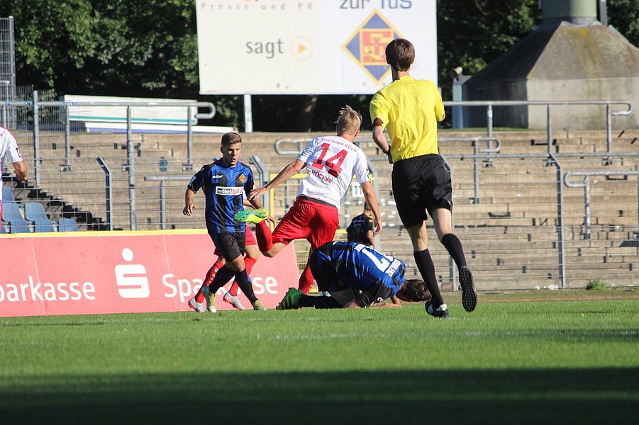 Zu Beginn des Spiels waren diese auch zu erkennen. Schnell nahmen die Kölner das Heft in die Hand und kreierten erste kleine Chancen. So war es überraschend als sich die TuS in der 5. Minute eine Großchance erarbeitete und einen Querpass aus nächster Distanz am Tor vorbei schoss. Trotzdem war die Fortuna das bessere Team und belohnte sich nach 12 Minuten nachdem Koruk es besser machte und einen Flachpass von Bösing locker einschob. In der Folge verstärkte sich das Bild und die TuS besann sich in erster Linie auf Kontergelegenheiten. Ein Schuss von Kegel sollte jedoch das einzig Erwähnenswerte bis zur Pause bleiben (27.).