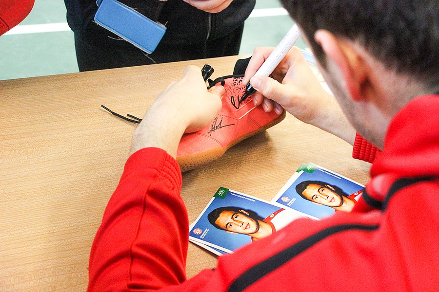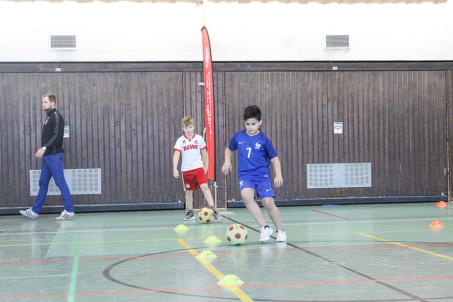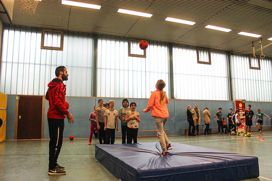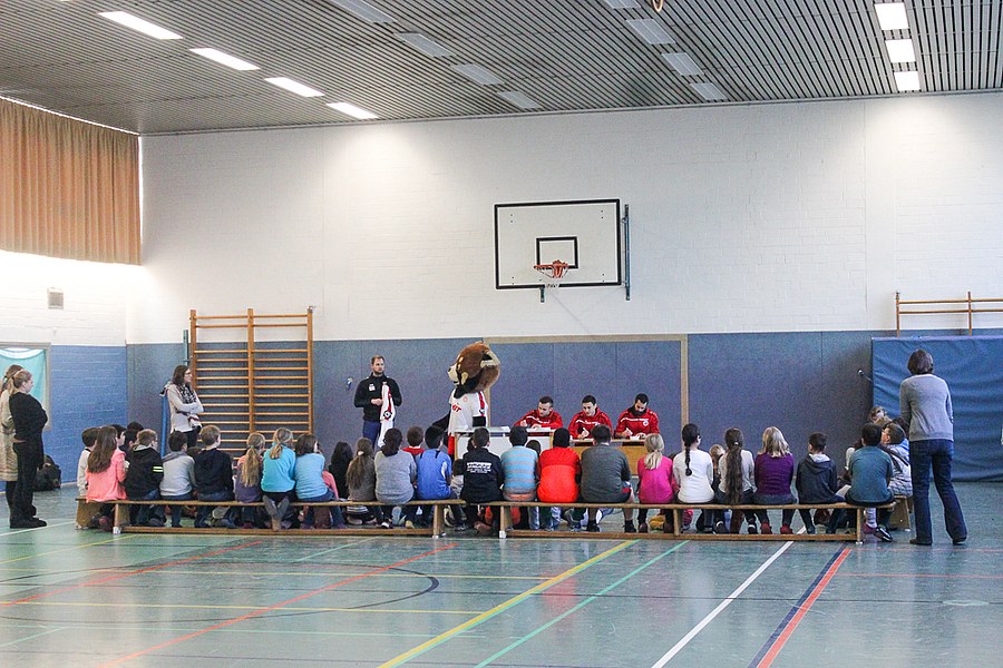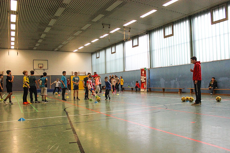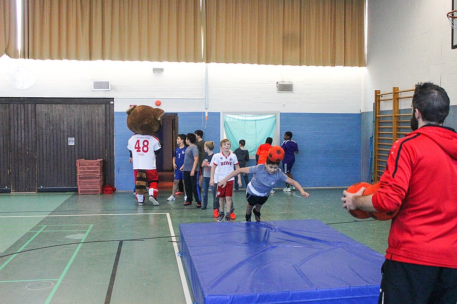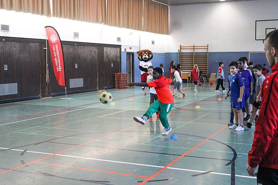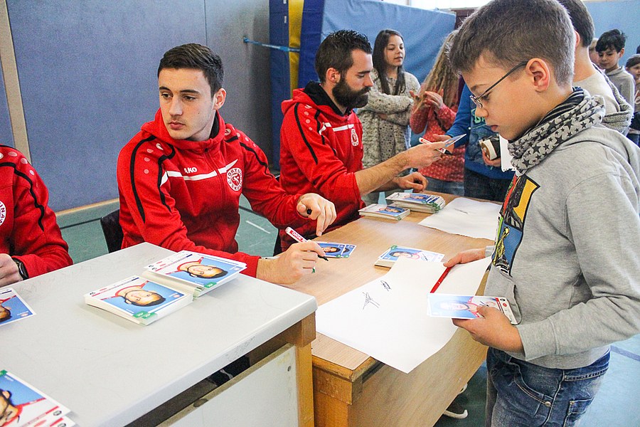 Die AOK-Schulaktionen gehören schon fast zur Routine für die Fortuna-Profis. Dabei ist der Spaß aber immer wieder aufs neue groß bei Kindern und Erwachsenen. Die drei Spieler von Fortuna Köln stellten an verschiedenen Stationen wieder einmal drei unterschiedliche Übungen vor, an denen sich die Schüler im Anschluss selbst probieren konnten. Nachdem Andersen, Bösing und Engelman die Kinder in zwei Gruppen durch den Morgen begleitet und zum Schwitzen gebracht haben, stand um 11 Uhr eine Begrüßung seitens der gesamten Schule auf dem Plan. Die Profis der Fortuna stellten sich den Fragen der wissbegierigen Schülern und verteilten im Anschluss Autogramme. Dabei ließen sich die Kinder nicht nur Autogramm-Karten beschriften, auch das Schuhwerk der Schüler wurde signiert.
