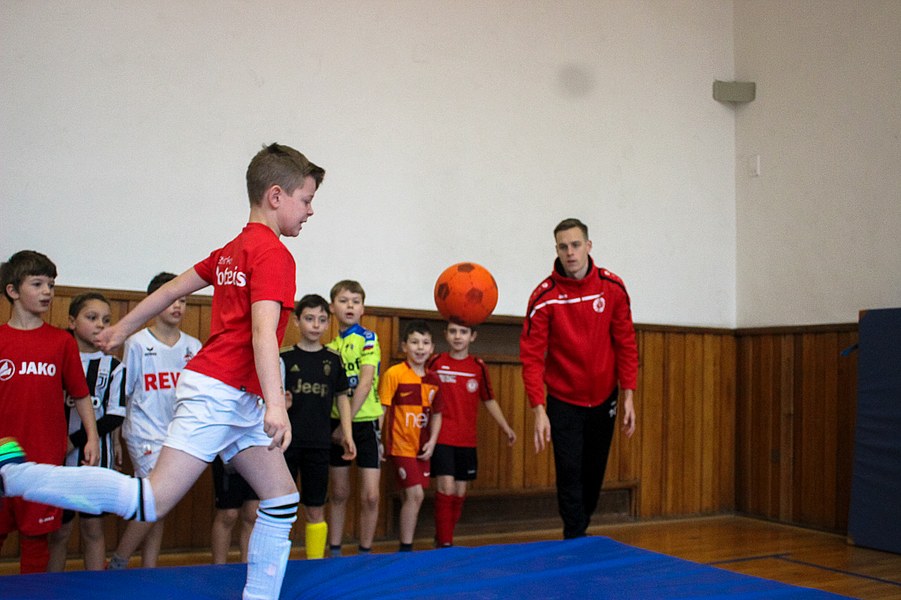 Wieder einmal ließ die Fortuna Kinderaugen strahlen. Es stand eine Schulaktion für die Fortuna-Profis an. Aus diesem Grund besuchten Lars Bender, Barnard Kyere und Christopher Theisen die Schüler der KGS Zugweg. Mit zwei Klassen stand als erstes das obligatorische Training an. Die drei Fortunen leiteten nicht nur die Einheit, sondern nahmen auch selbst daran teil. Insgesamt gab es drei verschiedene Übungen: Eine Schussübung, einen Hindernisparkour und eine Übung für Fallrückzieher sowie Flugkopfbälle. Die Klassen wurden immer in drei Gruppen aufgeteilt, die jeweils ein Profi begleitete.