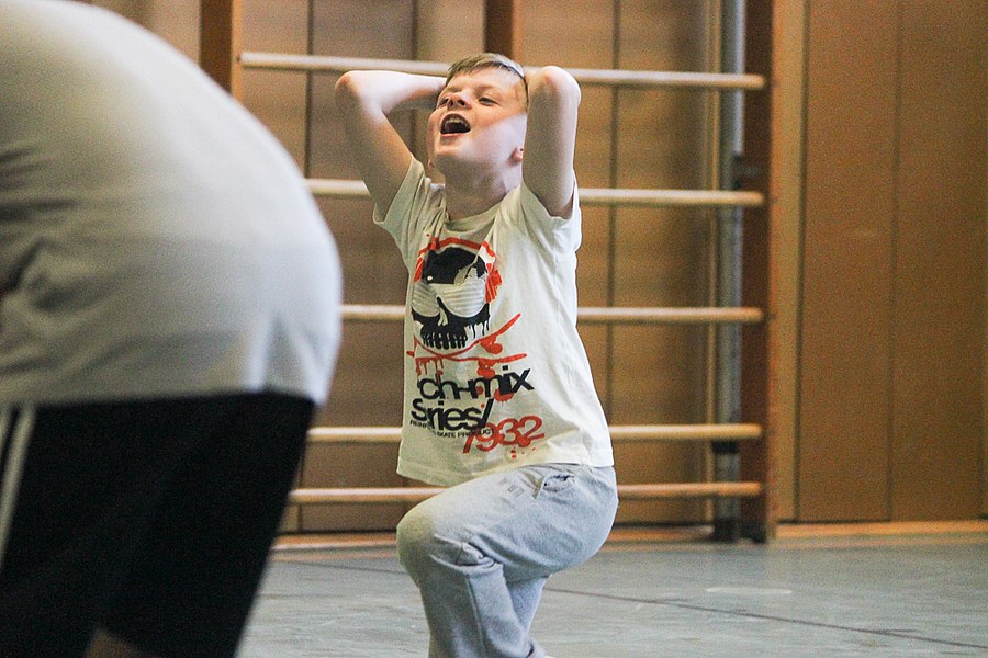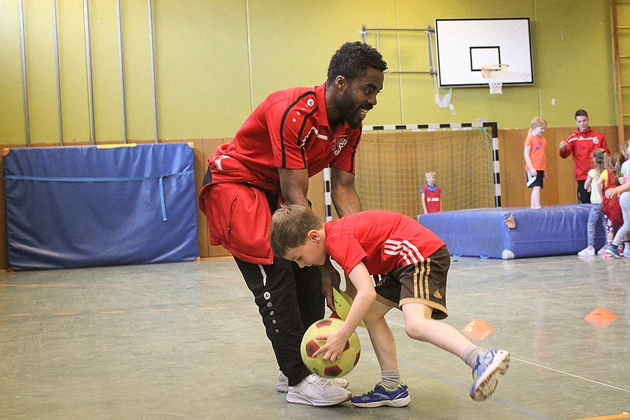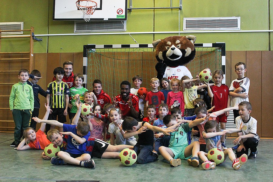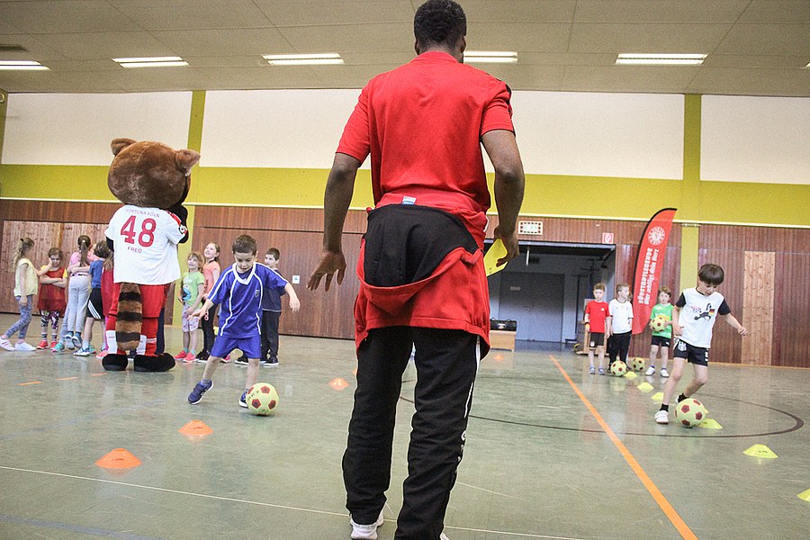 Der Montag-Morgen startete mit lachenden Gesichtern an der GGS Oberdollendorf - Christopher Theisen, Kusi Kwame, Tim Boss und Vereinsmaskottchen Fred hatten gute Laune mit nach Königswinter gebracht. Neben Übungen zum Torabschluss, Dribbling und Kopfbällen sorgten lustige Wettkämpfe für gehörig Spannung bei den Schülerinnen und Schülern der Grundschule. Wer es sich zutraute, durfte sich auch bei der Ausführung eines Fallrückziehers weiterbilden.