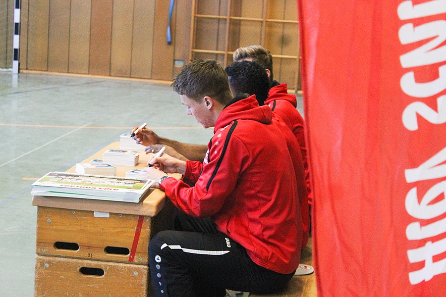 Im Anschluss an den sportlichen Teil kam die ganze Schule zusammen, um mehr über das Leben der Profi-Fußballer zu erfahren. Die Klassensprecher hatten im Vorfeld Fragen gesammelt und gaben diese als Vertreter der Klassen an die Fußballer der Fortuna weiter. Nachdem alle Fragen beantwortet waren und Christopher Theisen auch die Abseitsregel nicht unerklärt ließ, bedankten sich die Kinder bei den Südstadt-Fußballern mit einem gelungenen Überraschungsauftritt. Die drei Profis belohnten die Schüler daraufhin mit Autogrammkarten, Mannschaftspostern und Geschenktüten von Fortuna-Partner Schmitz & Nittenwilm.