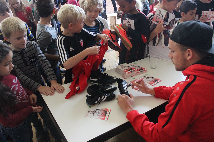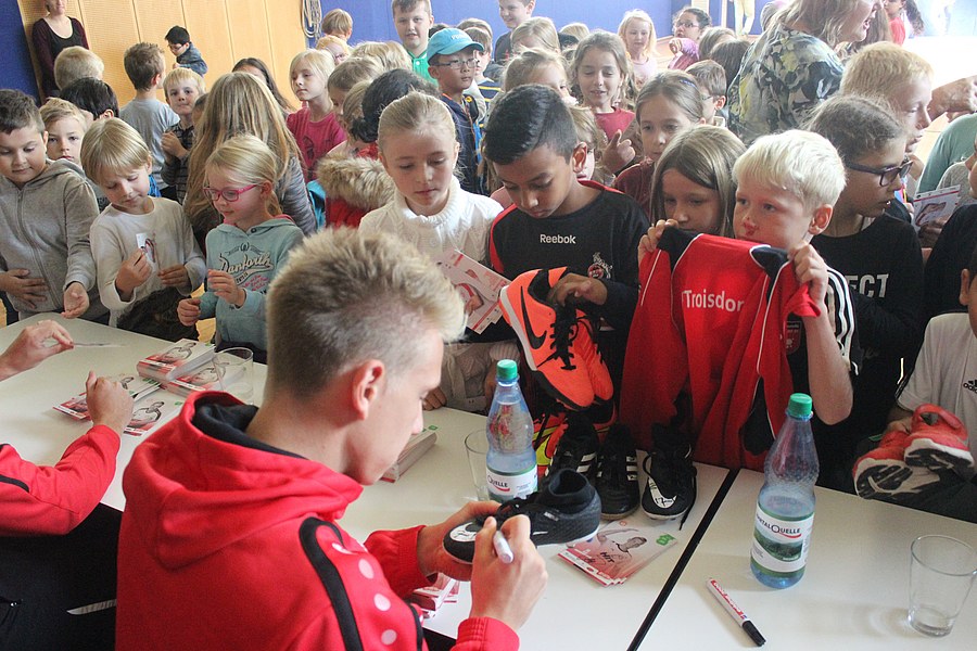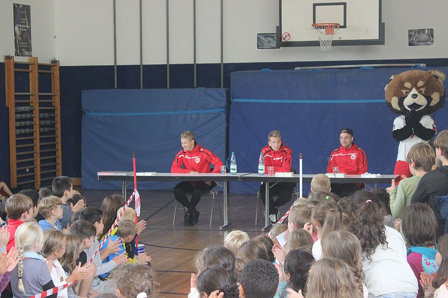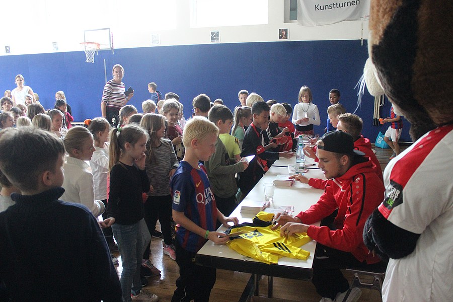 Im Anschluss an die Trainingseinheit ging es für alle Schüler der KGS Schlossstraße in die Turnhalle zu einer gemeinsamen Fragerunde. Hier hatten die Kids die Möglichkeit, den Fortuna-Profis einige persönliche Fragen zu stellen und damit das Leben eines Profifußballers besser kennenzulernen. Nach der Autogrammstunde im Anschluss ging es für die Schüler mit vielen, neuen Eindrücken zurück in die Klassenzimmer. Ein rundum gelungener Tag für Groß und Klein!