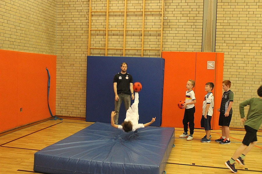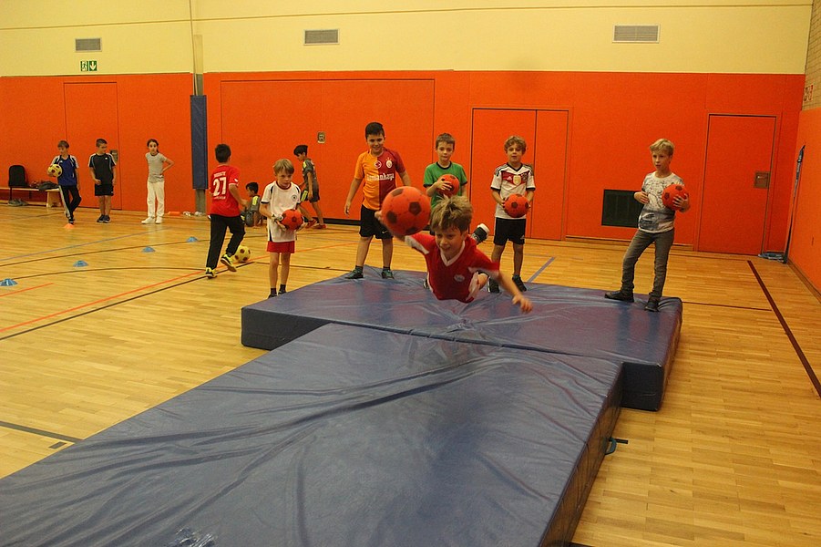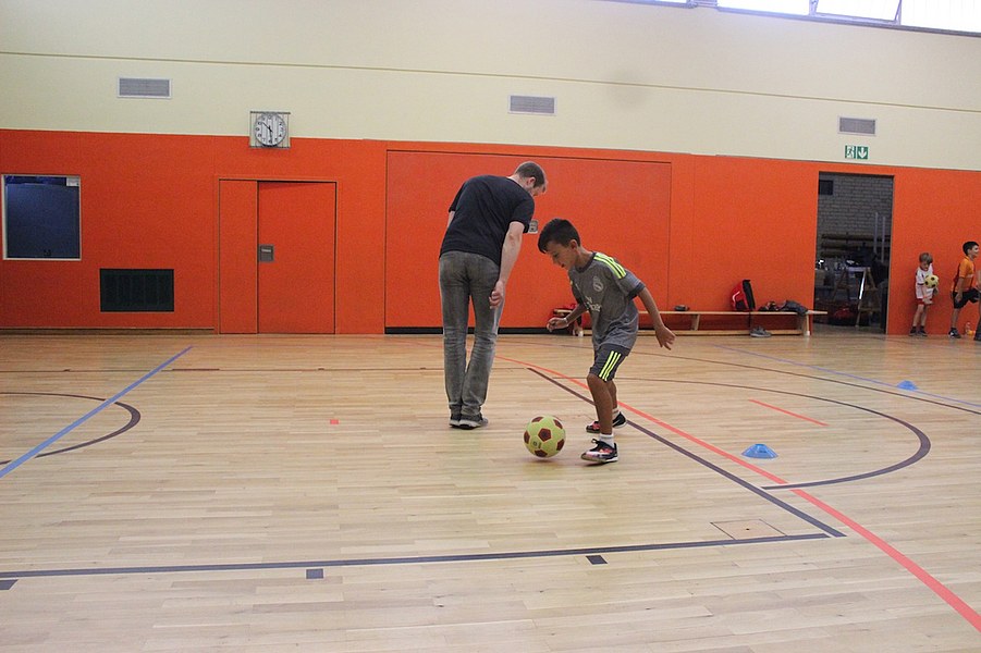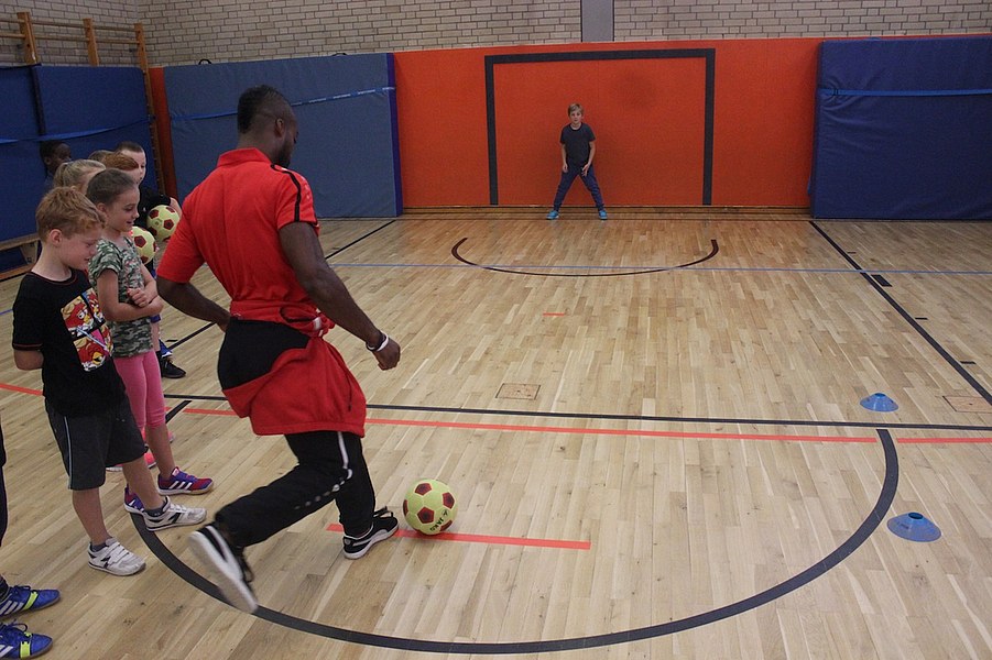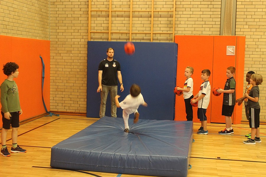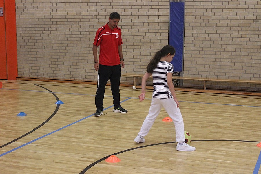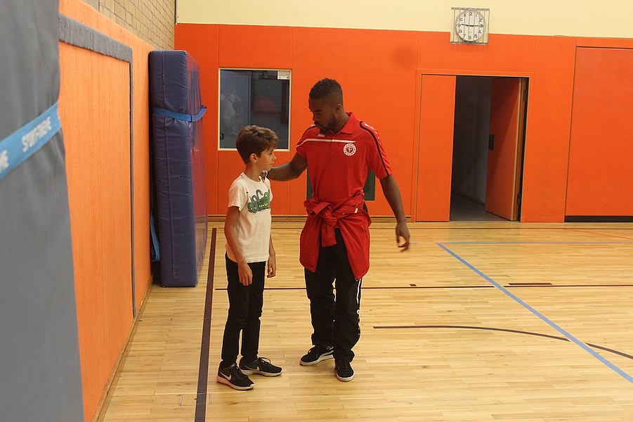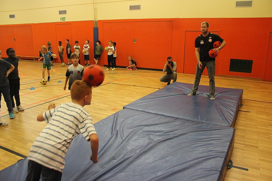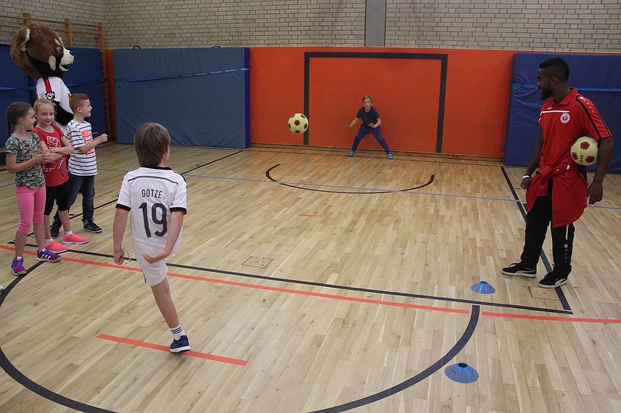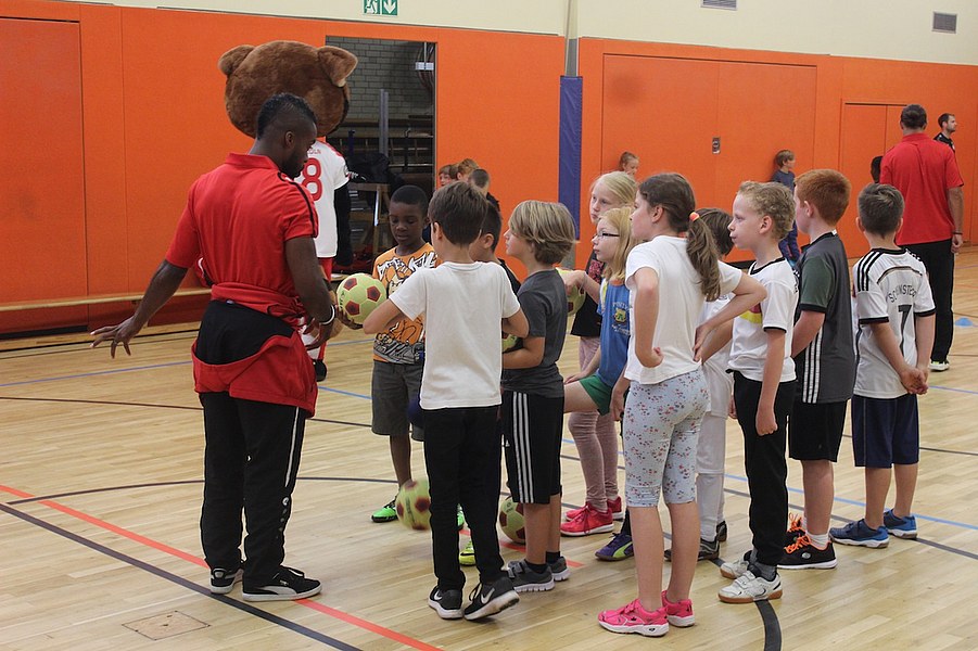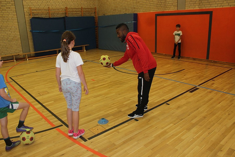 Für die Kinder war das Training in der Sporthalle eine schöne Abwechslung zum Unterricht am Montagmorgen. An drei Stationen wurden von den beiden Profis verschiedene Übungen wie Dribblings und Torschüsse erklärt und geleitet. Mit Tipps und Tricks wurden die Kinder unterstützt und hatten dabei sichtlich Spaß.