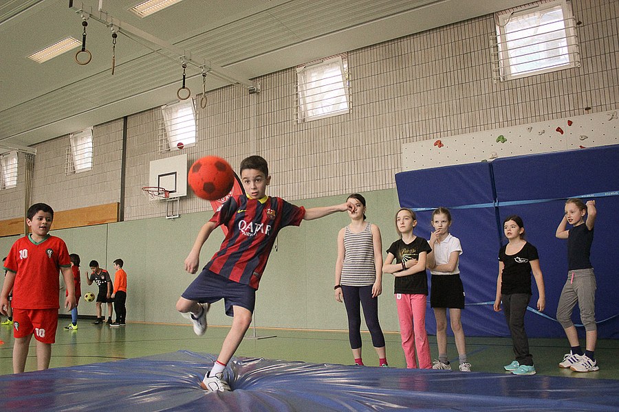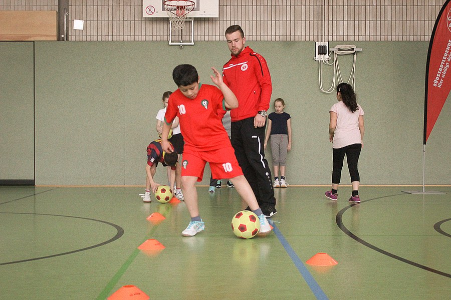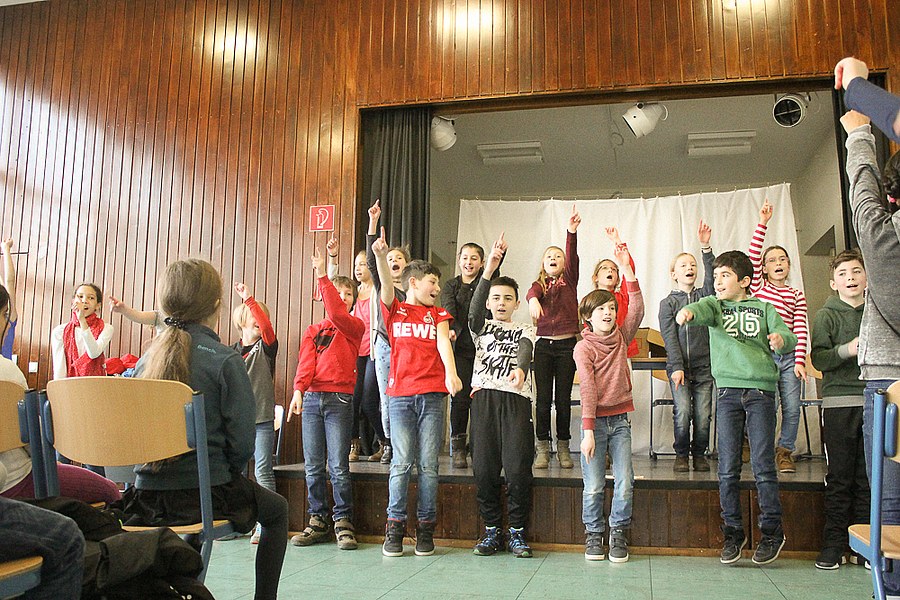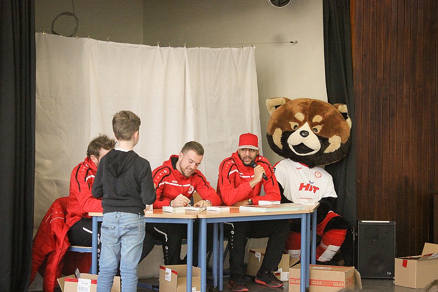 Zu Beginn des Tages wurden die Schüler in unterschiedliche Gruppen aufgeteilt. An drei Stationen wartete jeweils ein Fortuna-Profi, um das Dribbling, den Abschluss und das Kopfballspiel der Kinder zu schulen. Nachdem mit diesem Programmpunkt der sportliche Teil des Tages abgeschlossen war, ging es in die Aula der Schule. Mit einer Überraschung wartete man hier bereits gespannt auf die Fortuna-Profis. In der Aula führten die Schüler die Fortuna-Hymne mit einer kleinen Tanzeinlage auf, sehr zur Freude von Schneider, Schröder und Uaferro.