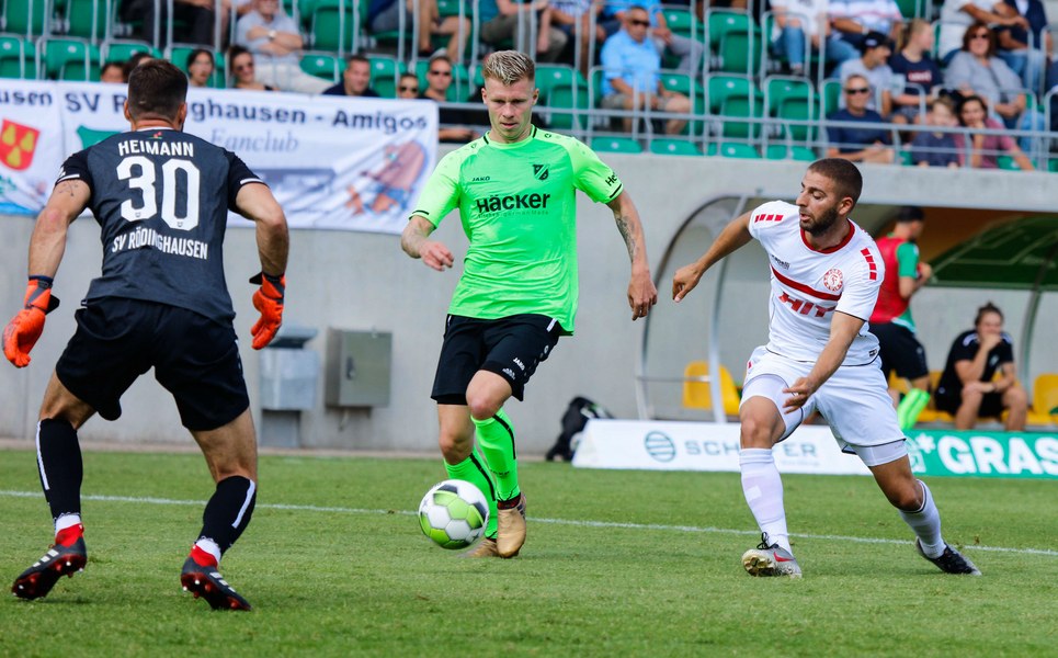 Abtasten war in der Anfangsphase angesagt, ehe Rödinghausen in der 9. Minute für den ersten Nadelstich sorgte. Mit einem Pass über die letzte Reihe hebelte Rödinghausen die ganze Abwehr aus, sodass Tobias Steffen alleine auf Kevin Rauhut zulief. Der Kölner Schlussmann fuhr im 1 gegen 1 jedoch blitzschnell das linke Bein aus und klärte den Ball. Den Nachschuss setzte der SVR neben das Tor. Fortuna zeigte sich beeindruckt und hatte Mühe, den Gastgeber aus der eigenen Hälfte zu bekommen. Letztlich sorgte eine Ecke für das erste Tor des Tages. Rödinghausens Julian Wolff war am zweiten Pfosten zur Stelle und traf zur Führung der Gastgeber (14.). Nur vier Minuten später war es Christian Derflinger, der per Direktabnahme von der Sechzehner-Kante auf 2:0 erhöhte. Kevin Rauhut hatte die Finger zwar noch dran, konnte den strammen Schuss aber nicht mehr über die Latte lenken. Für die erste Chance der Fortuna sorgte Kelvin Lunga. Nach Hereingabe von Alem Koljic von der linken Seite hielt Lunga am zweiten Pfosten den Fuß hin, setzte den Ball aber neben das Tor (25.). Auf der Gegenseite sorgte ein erneuter Standard für Gefahr vor dem Kasten von Kevin Rauhut. Eine Freitsoß aus gut 18 Metern landete im Getümmel vor dem Strafraum, der Abschluss landete schließlich am Außenpfosten.