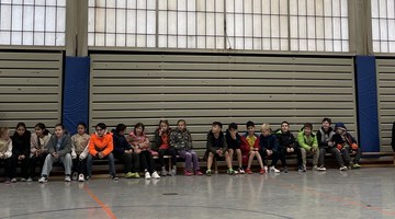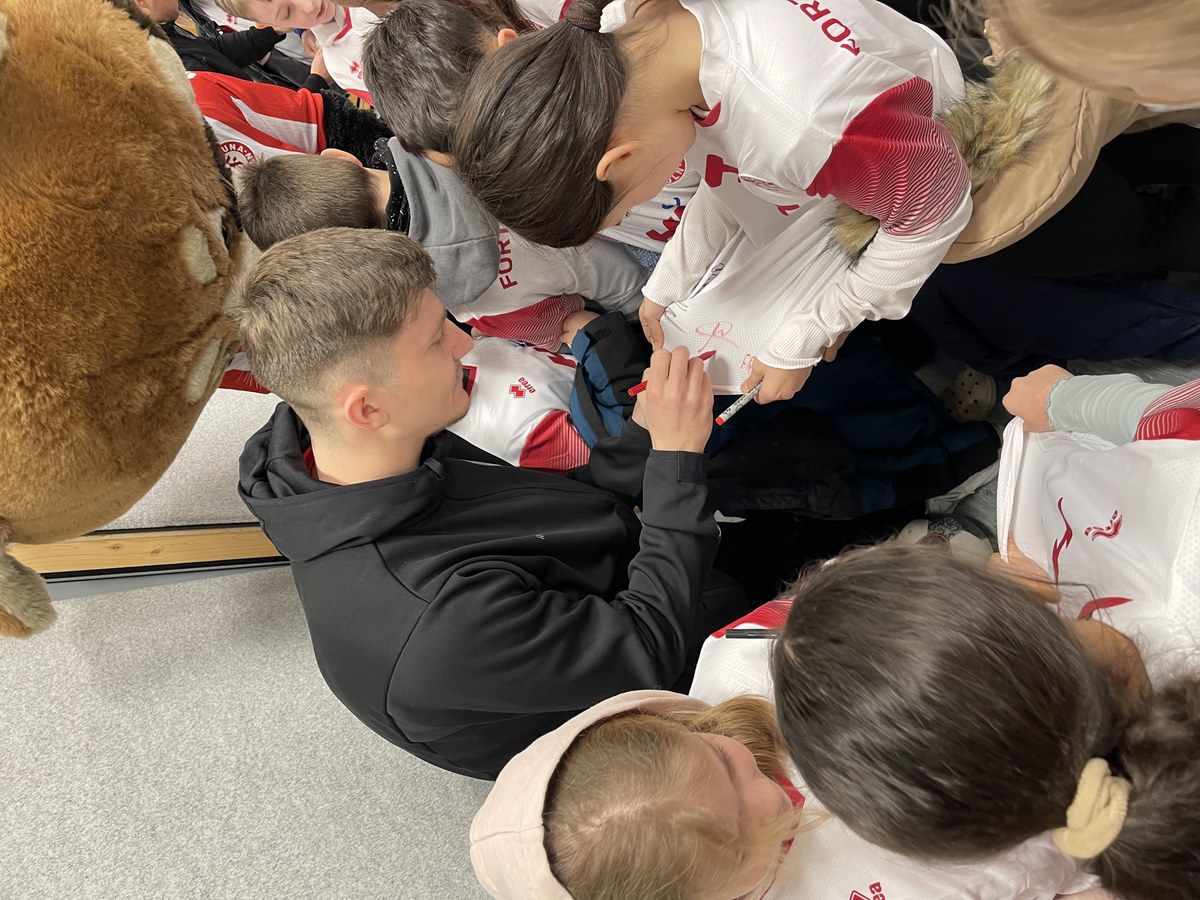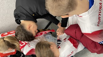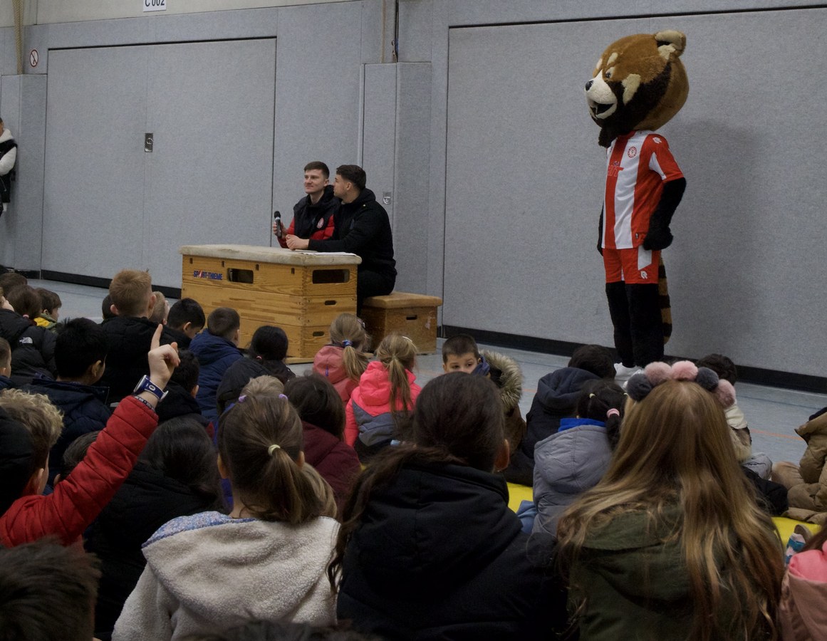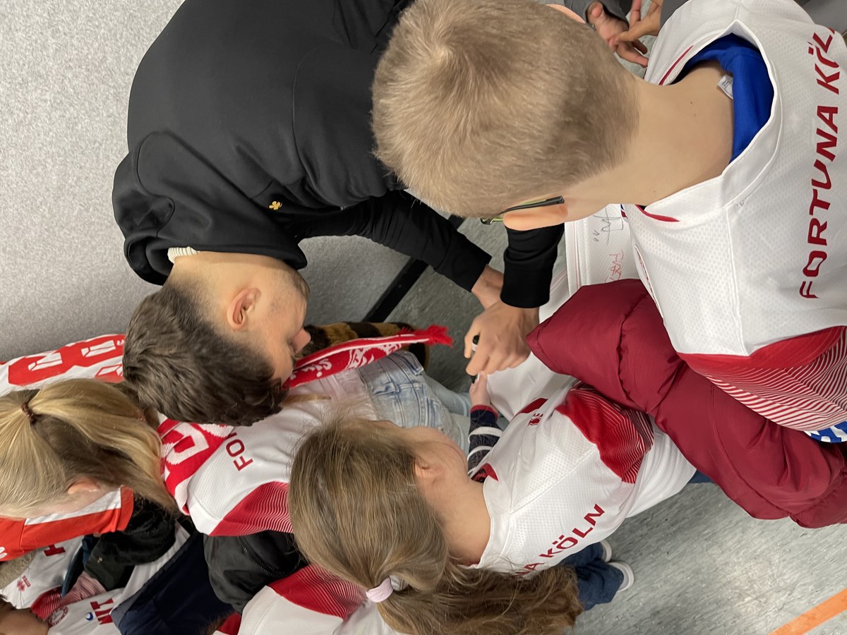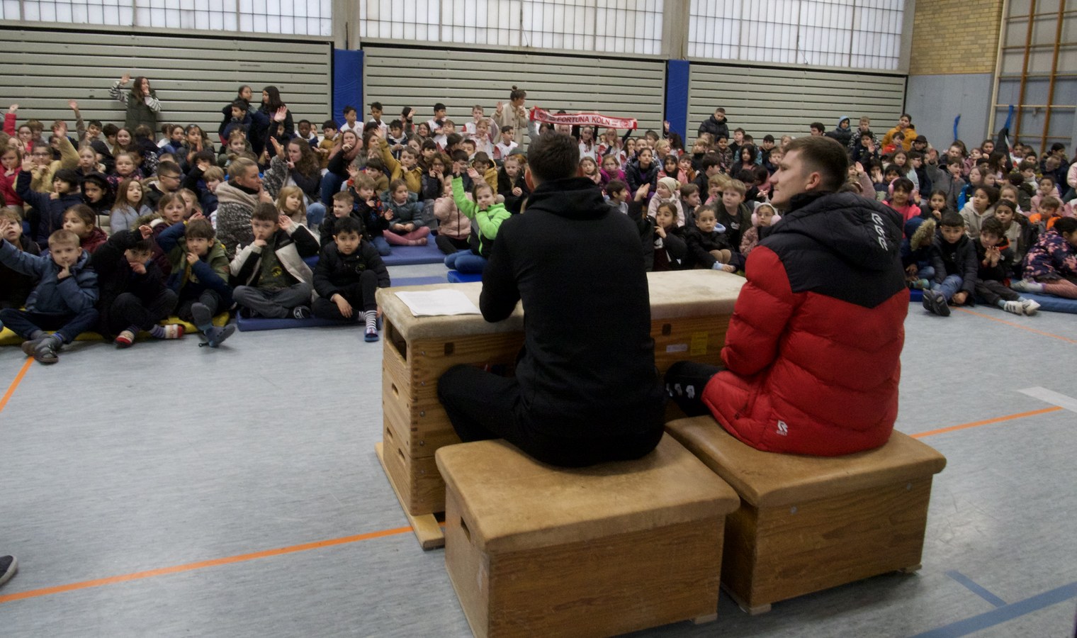 Zur Begrüßung wurde die Fortuna-Hymne über Lautsprecher in der Turnhalle in Porz eingespielt und die Kinder sangen lautstark „Dat bes du, bin ich, sin mer“ mit. Es folgte eine Kinder-Pressekonferenz, die beiden Profis wurden eifrig mit Fragen gelöchert. Nach einem Foto von Fred mit jeder Klasse wurde es dann sportlich. Mika und Breitfelder stellten sich beim Elfmeterschießen ins Tor und übten anschließend fleißig Fallrückzieher mit den Kindern.