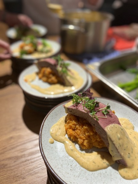 Als Vorspeise gab es Wildlachs mit Avocado an Gurke und Rote Beete. Im Hauptgang folgte Roastbeef mit einer Sauce Café de Paris mit Süßkartoffel-Röstzwiebel-Stampf und gebratenem Frühlingslauch. Das Dessert rundete den kulinarischen Ausflug nach Bonn passend ab. Weiße Schokolade traf Apfel und Mandel in dieser Komposition. Feinsten Wein von Fortuna-Partner Christian Schardt gab es obendrein.
