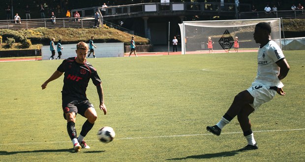 Vor den beiden Gegentreffern hatte vor allem Timo Bornemann das 1:0 auf dem Kopf. Nach Flanke von Robin Afamefuna scheiterte er aber freistehend aus acht Metern an Keeper Tiago Cardoso (10.). Aus einer eigenen Ecke resultierte das 0:1 sieben Minuten später. Kilian Sauck schickte Jan Urbich ins Laufduell mit Tom Geerkens. Der Gladbacher setzte sich durch und lupfte den Ball aus zwölf Metern über Lennart Winkler hinweg ins Tor. Nach 31 Minuten köpfte Kemal Cirpan eine Ecke von Yannik Dasbach unbedrängt zum 2:0 für die Hausherren in die Maschen.