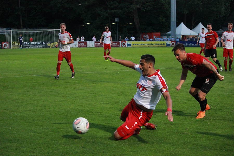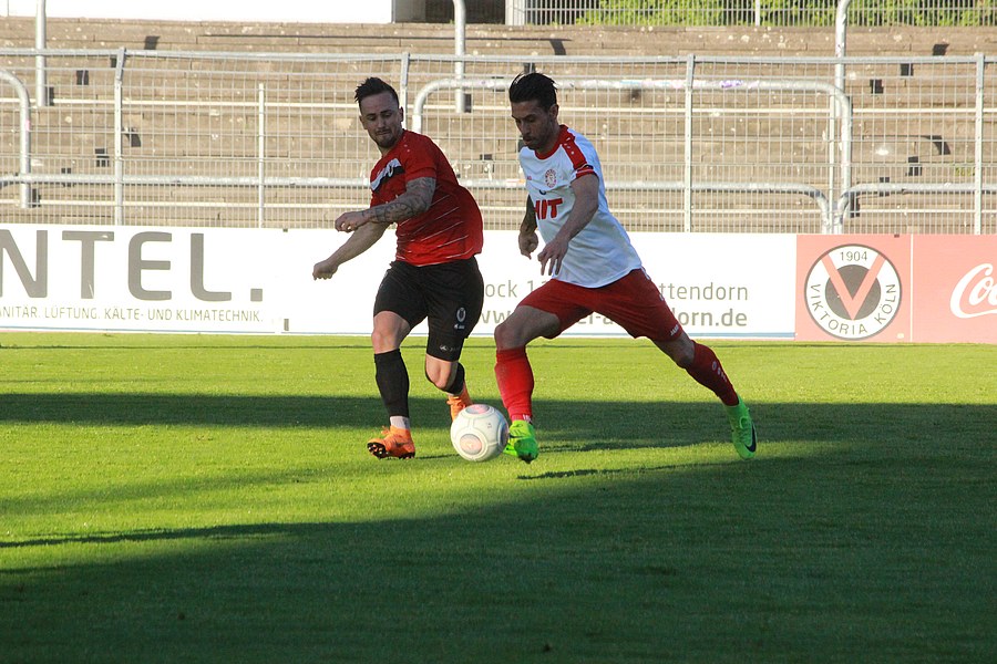 Es entwickelte sich von Beginn an ein intensives Derby im Sportpark Höhenberg. Unterstützt von zahlreichen Fans bot die Fortuna der Viktoria wenig Räume für Kombinationen. So versuchten beide Teams über Zweikämpfe und der einen oder anderen Emotion ins Spiel zu finden. Schließlich prüfte Koronkiewicz nach einer Ecke Boss das erste Mal (7.). Im Gegenzug meldete Keita-Ruel die Fortuna per Kopf nach der ersten Fortuna-Ecke an (8.). Die Fortuna schaffte es über die linke Seite dann aber mehr und mehr die Viktoria festzunageln. Die besseren Chancen hatten aber zunächst die Gastgeber mit einem sehenswerten Außenristschuss von Golley (15.). Anschließend neutralisierten sich beide Teams bis auf ein paar Distanzschüsse. Es spielte sich viel im Mittelfeld ab, ehe der Schiedsrichter Heller das Spiel belebte: So musste der bereits verwarnte Menz nach einem Handspiel an der Mittellinie mit gelb-rot vom Platz (31.). Anschließend verwehrte der Unparteiische der Fortuna einen Foulelfmeter, als Patzler außerhalb des Fünfmeterraums Brandenburger umräumte (33.). Aus dem Spiel heraus ließ Nottbeck dann gegen Boss die nächste Viktoria-Chance liegen (37.). Die Fortuna fing sich anschließend aber und schnupperte mit einem Volley von Dahmani an der Führung (45.). So blieb es aber beim 0:0 zur Pause.