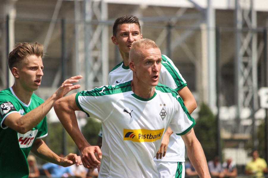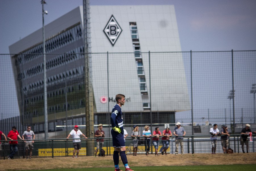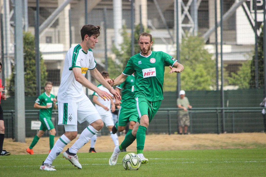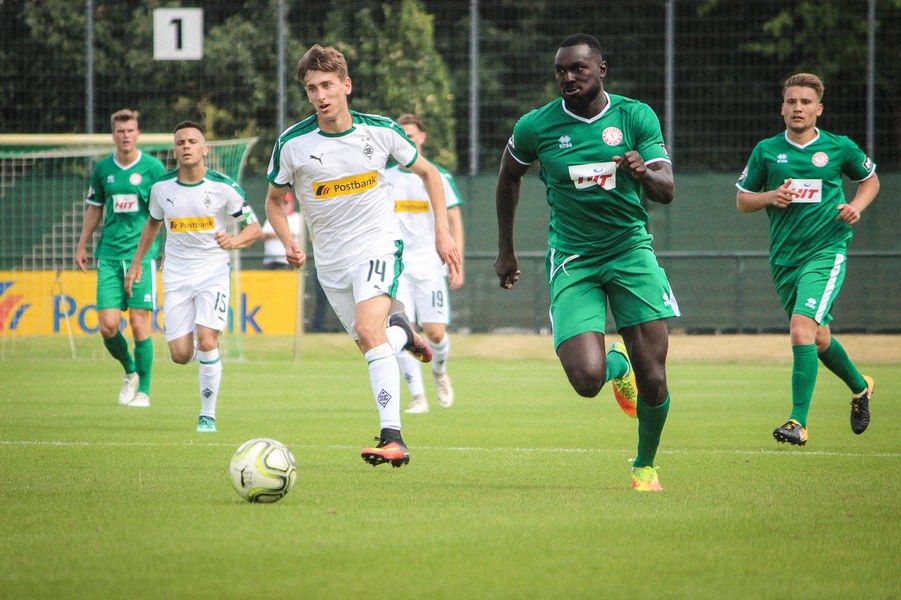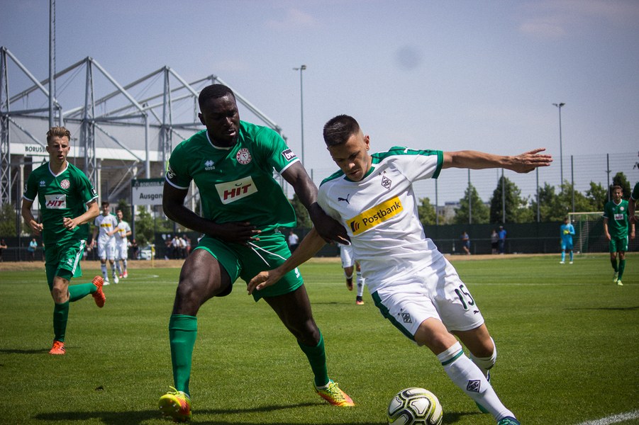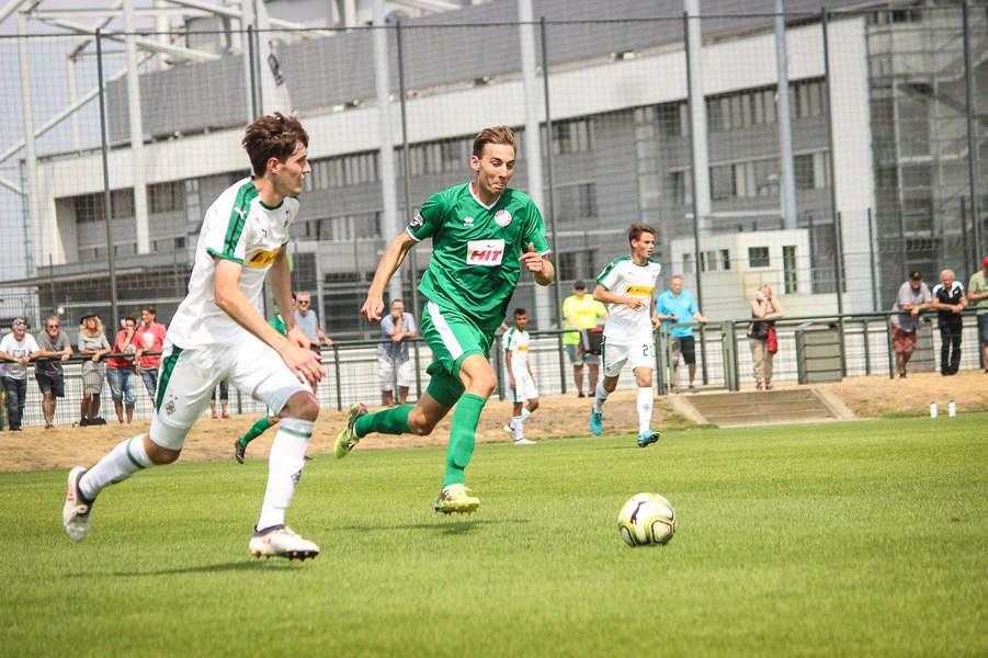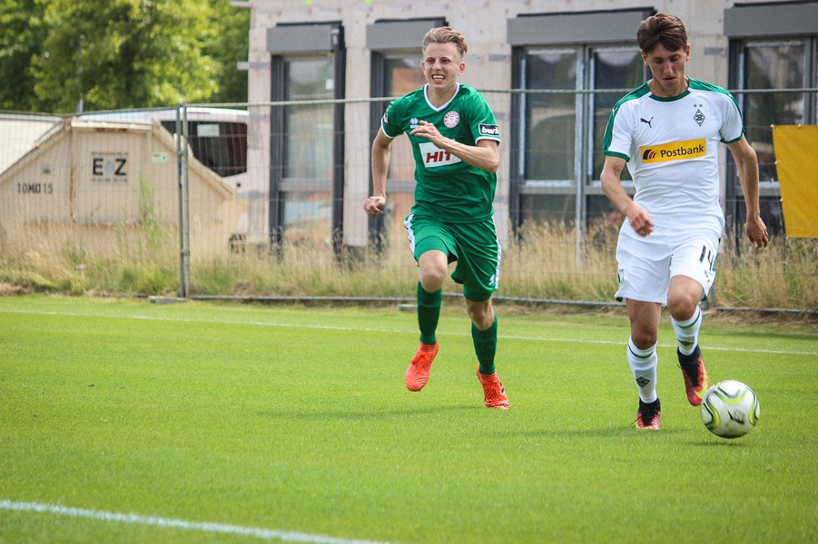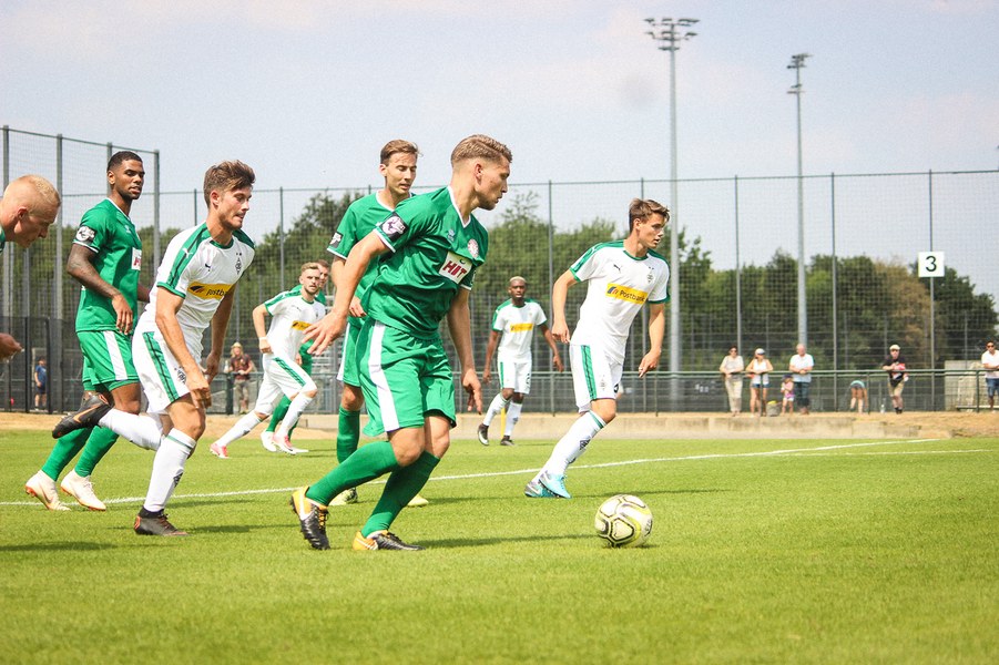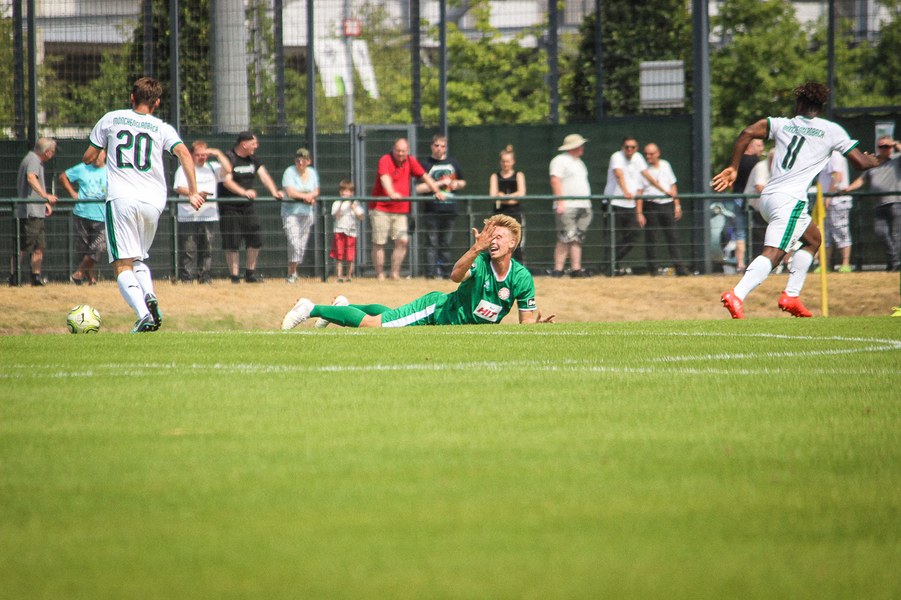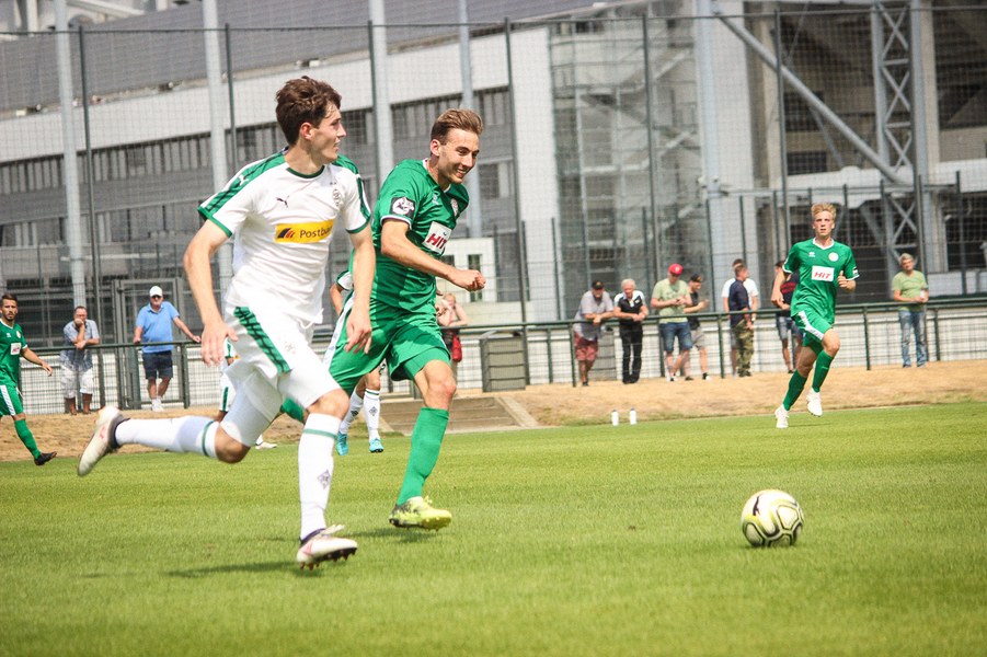 Trotz der heißen Temperaturen legten beide Mannschaften schon zu Beginn ein ambitioniertes Tempo an den Tag. So erspielten sie sich nach zehn Minuten auch immer wieder kleinere Chancen, die aber beide Seiten nicht entschlossen genug zuende spielten. Nach einer Viertelstunde konnte sich keine Mannschaft qualitativ von seinem Gegner absetzen, wodurch die Partie nach durchaus attrkativem Start etwas abflachte. Die beste Chance der Anfangsphase hatten die Gladbacher, als Kraus eine Hereingabe direkt nahm, sein Ball aber knapp über das Tor abgefälscht wurde (20.) In der Folge erspielte sich die Borussia Mitte der ersten Hälfte ein leichtes Chancenplus. Nach der kurzen Trinkpause fiel es den Spielern schwerer, wieder in die Partie zu kommen. Die Anzahl kleinerer Fouls nahm zu und die spielerische Komponente nahm etwas ab. So war es ein langer Ball auf Yeboah, der die Viererkette de Borussia überraschte und am Ende zur Führung der Fortuna führte, als Yeboah den Ball auf den im Zentrum vollstreckenden Hartmann querlegte (33.). Im Anschluss an den Treffer hatte die Fortuna zeitweise auch etwas mehr Kontrolle über das Spielgeschehen, konnte aber nicht weiter nachlegen. So ging es mit einer 1:0 Führung in die Pause.