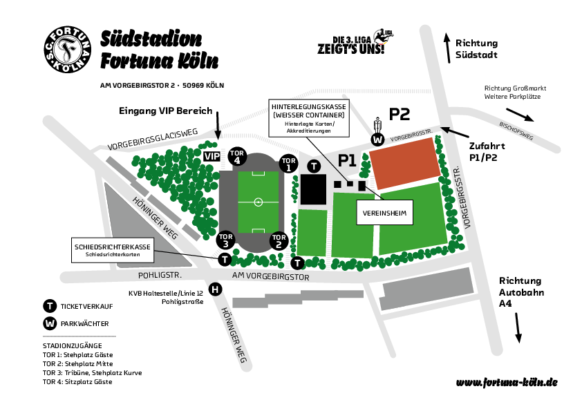 An den drei Kassen bei Tor 3, die an der Seite vom Haupteingang stehen, können Karten für Stehplatz Mitte gekauft werden. Besucher, die von der Haltestelle Pohligstraße aus kommen, können somit an Tor 3 schon Karten für Stehplatz Mitte kaufen und dann an Tor 2 mit reduzierter Wartezeit ins Südstadion.