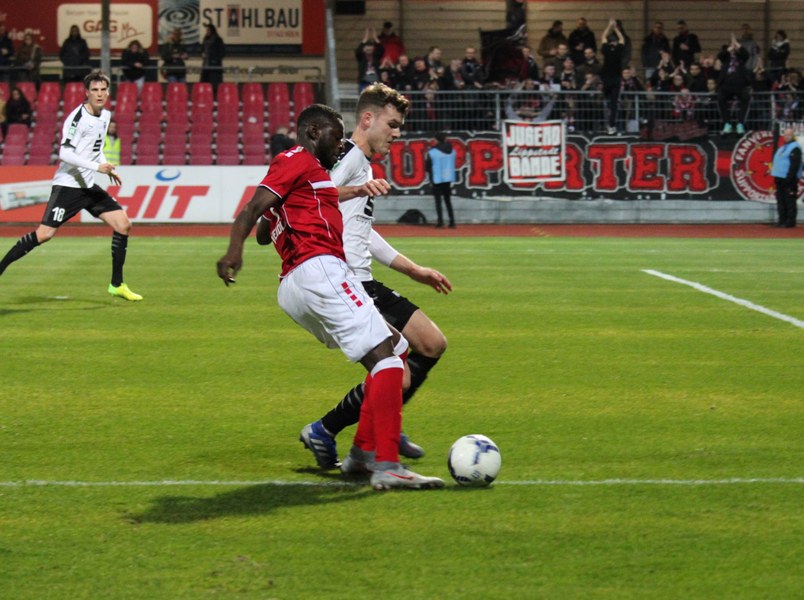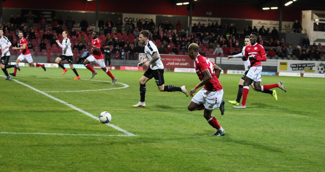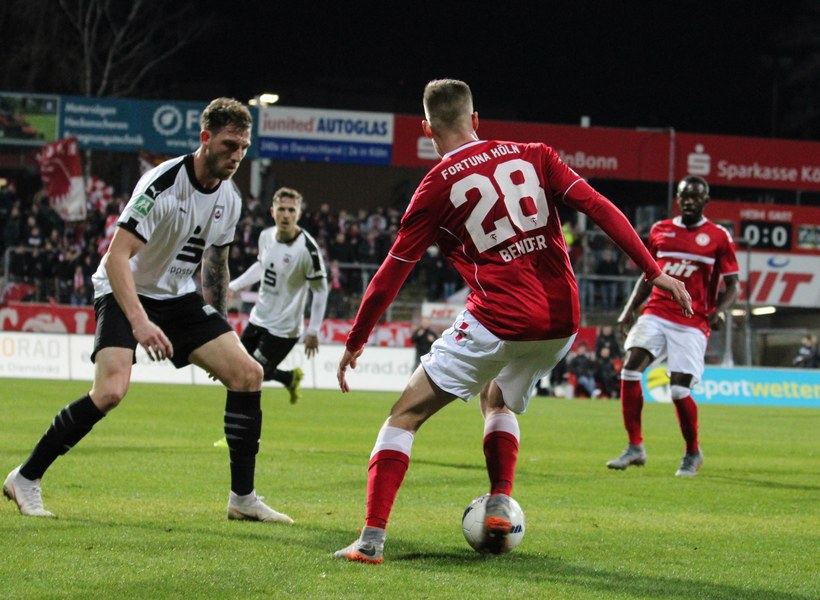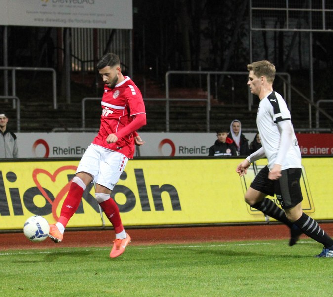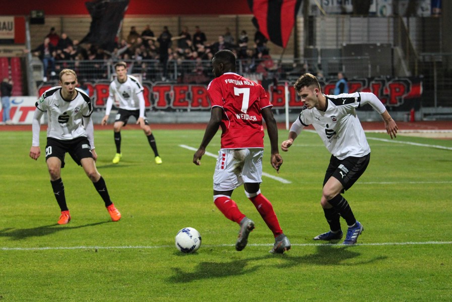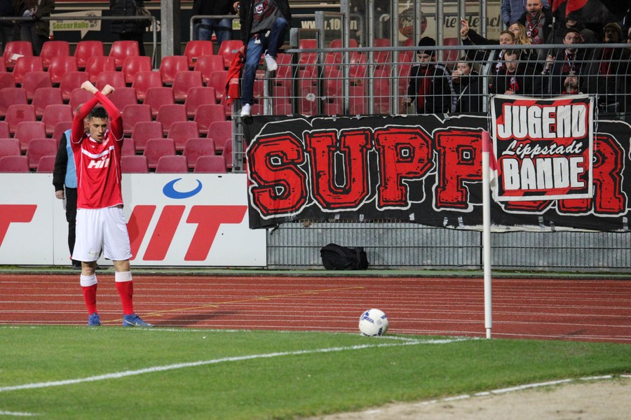 Die Fortuna sicherte sich im Spiel, das aufgrund der späten Anreise der Mannschaft und Fans der Gäste rund fünf Minuten später startete, die erste Torannäherung. Das Team von Thomas Stratos setzte gut nach und eroberte sich am gegnerischen Strafraum den Ball. Das Spielberät landete schließlich bei Lars Bender, der den Ball auf das Tor zog, das Gehäuse jedoch deutlich verpasste (1.). Fünf Minuten später schaffte es Mike Owusu nicht, eine Hereingabe von Suheyel Najar zu kontrollierten. So versprang der Ball in die Arme von Keeper Balkenhoff. Lippstadt meldete sich zunächst über Ecken im Spiel an. Doch sowohl Roman Prokoph (8.), als auch Noe Baba (9.) waren hellwach und köpften den Ball aus der Gefahrenzone. Fortuna sicherte sich mehr Ballanteile, schaffte es aber aus aussichtsreichen Positionen nicht, Druck hinter die Abschlüsse zu bekommen (12./14./15.). Auf der anderen Seite musste Rauhut erstmals in der 16. Minute eingreifen. Den Satten Schuss lenkte Fortunas Schlussmann den Ball aber sicher zur Seite. Die Südstädter suchten immer wieder den Weg nach vorne, brachten sich hintern jedoch durch Ungenauigkeiten selbst in Bedrängnis. 29. Minuten waren gespielt, als sich die rechte Angriffsseite der Fortuna zu Wort meldete. Weidlich setzte sich gegen seinen Mitspieler durch und legte auf Ochojski ab. Der suchte mit seiner Flanke zwar Stürmer Prokoph, fand jedoch nur einen Lippstädter-Abwehrkopf. Kurz vor der Pause sorgte Lars Bender dann für einen Aufschrei der Fortunen. Nach einer Ecke lauerte er am zweiten Posten und zog den Ball auf das Tor. Balkenhoff hatte den Ball jedoch im Nachfassen. Trotzdem hatte die Fortuna Glück, nicht mit einem Rückstand in die Pause zu gehen. Nils Köhler nahm Maß und zimmerte den Ball an die Unterkante der Latte. Von dort sprang er jedoch vor die Linie, sodass es mit einem torlosen Remis in die Pause ging.
