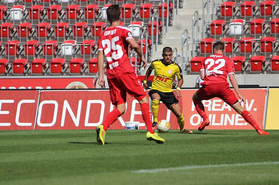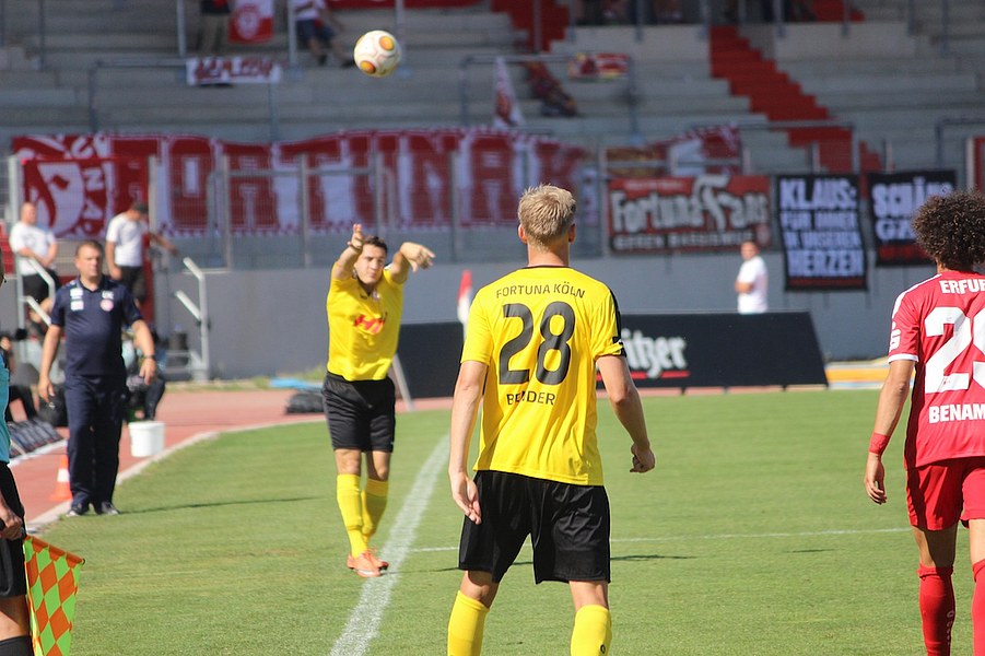 Bei knallender Hitze tasteten sich beide Mannschaften langsam in die Partie. Es dominierten die langen Bälle auf beiden Seiten. Die Fortuna bekam aber schnell ein Gefühl für das Spiel, auch wenn man früh verletzungsbedingt auf Kwame verzichten musste - für ihn kam Röcker (12.). Die Südstädter hatte ein leichtes optisches Übergewicht - Torszenen gab es aber auf beiden Seiten nicht. Erst nach einer guten Viertelstunde wurde es mal interessant, als nach Abstimmungsproblemen in der Kölner Defensive Benamar aus dem Rückraum zum Abschluss kam (16.). Es blieb in der Folge ein Abnutzungskampf im Steigerwaldstadion. Hier und da schleichten sich aufgrund der Temperaturen Konzentrationsfehler auf beiden Seite ein, bis Mitte der 1. Halbzeit aber ohne Folge. Nach kurzer Trinkpause fasste sich Bergmann für RWE ein Herz und setzte nach seinem Solo Kammlott in Szene, dessen Schuss Boss aber sicher parierte (29.). Die Gastgeber hatten nun mehr vom Spiel. Nach einer guten halben Stunde verbuchte auch die Fortuna ihren ersten gefährlichen Abschluss, als sich Souza von links aus spitzem Winkel versuchte (33.). Der Fortuna fehlte aber insgesamt das Tempo in ihren Aktionen. Erfurt schien nun besser mit den Bedingungen klar zu kommen: Einen zu kurz geratenen Rückpass erlief Benamar, aber Boss verkürzte geschickt den Winkel gegen den Erfurter (35.). Kurz darauf setzte sich Pigl nach langem Ball gegen Röcker durch, scheiterte aber wieder an Fortuna-Keeper Boss (38.). Kurz vor der Pause sorgte ein ruhender Ball von Tyrala für Durcheinander vor dem Tor von Boss, es ging aber torlos in die Kabine (45.).