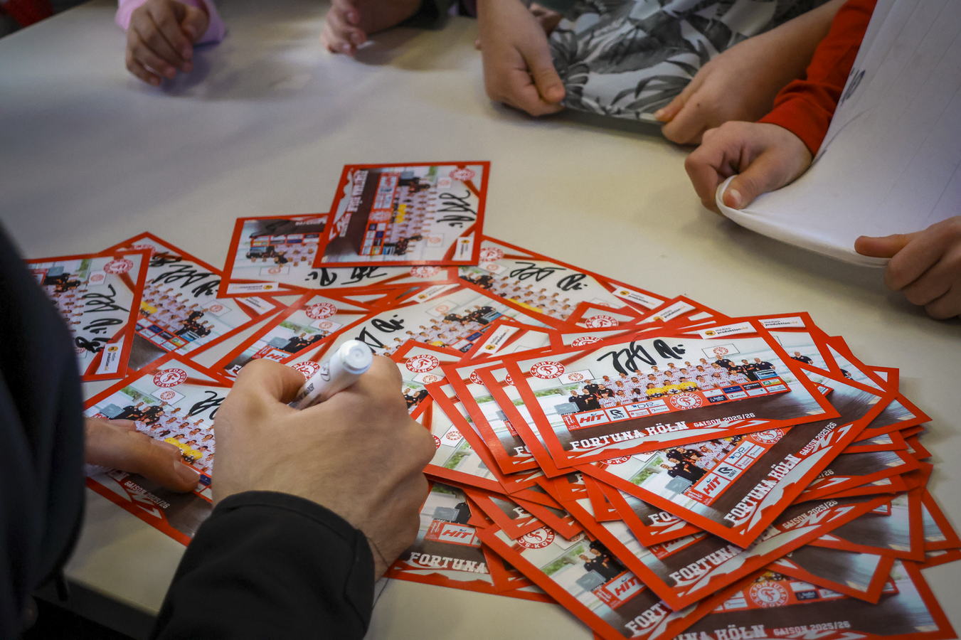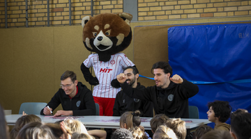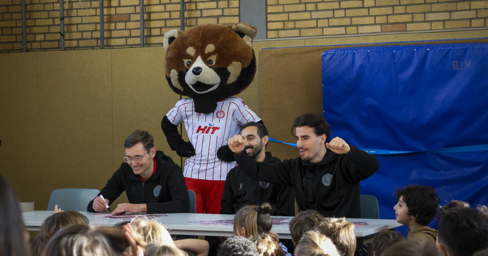 Im Anschluss fand in der Turnhalle eine gemeinsame Frage- und Autogrammstunde statt, an der rund 200 Kinder teilnahmen. Die Schülerinnen und Schüler nutzten die Gelegenheit, den Profis persönliche Fragen zu stellen, unter anderem zu ihren Essgewohnheiten, bisherigen sportlichen Erfolgen sowie ihrem Werdegang im Fußball. Die Veranstaltung stellte für alle Beteiligten ein besonderes Erlebnis dar und wird den Kindern sicherlich noch lange in Erinnerung bleiben. Neben der sportlichen Betätigung stand vor allem der persönliche Austausch im Vordergrund, der die Aktion zu einem vollen Erfolg machte.