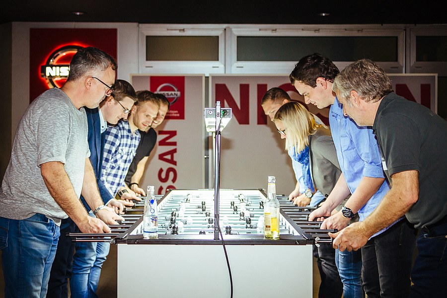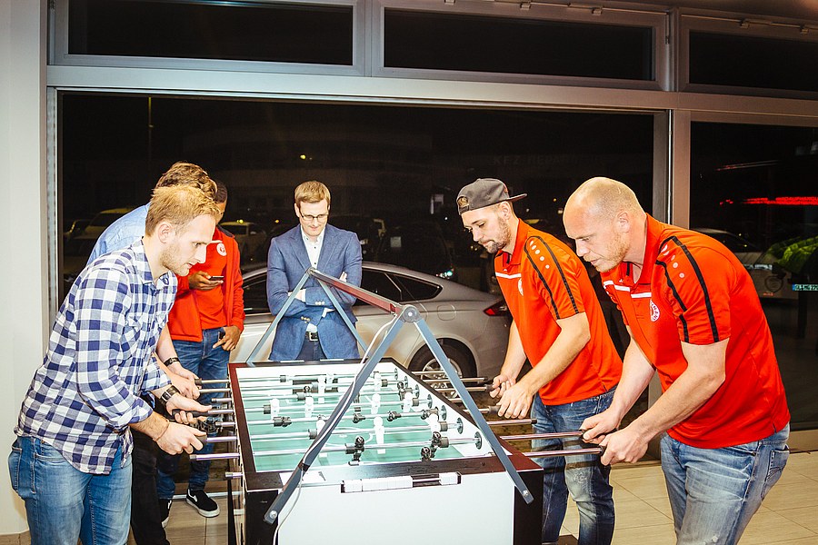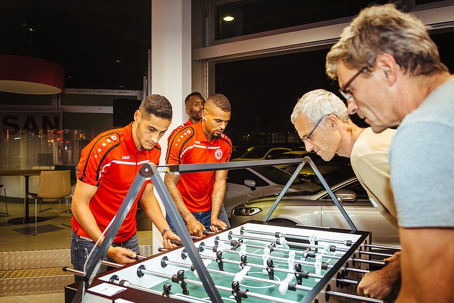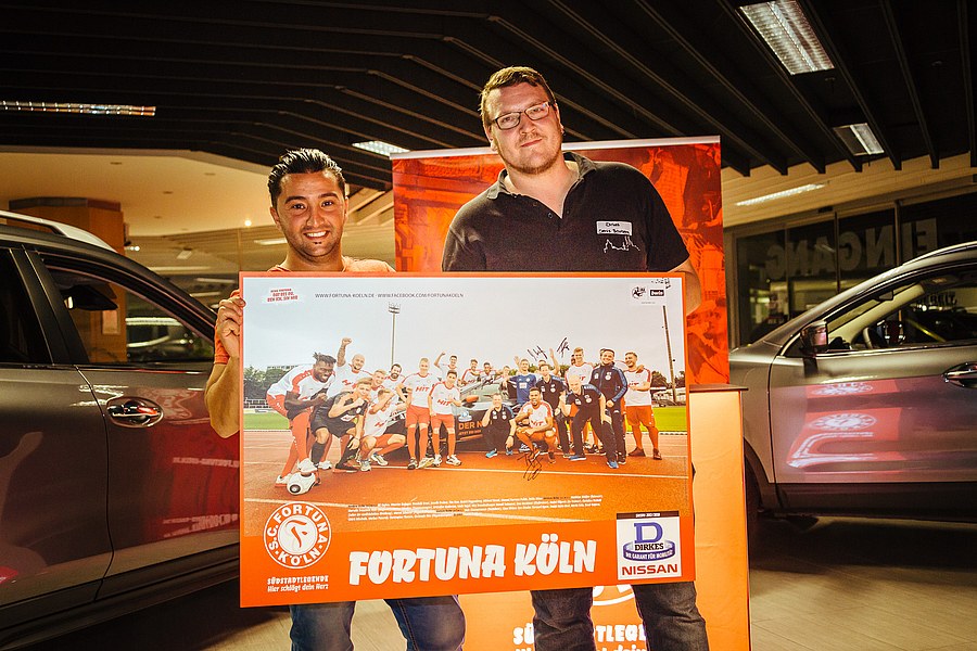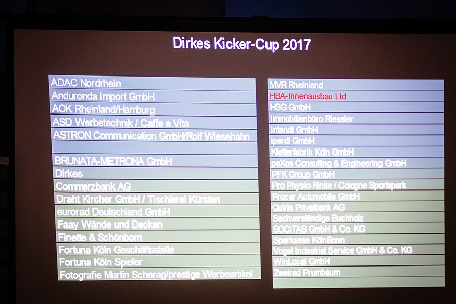 Die Automobilgruppe Dirkes veranstaltete bereits zum dritten Mal das Kickerturnier für das Fortuna-Netzwerk. Elmar Vogel, Leiter Unternehmenskommunikation der Automobilgruppe Dirkes, und Benjamin Bruns, Mitglied der Geschäftsleitung von Fortuna Köln, luden dafür in die Dirkes-Zentrale am Maarweg ein. Unter dem Motto „Das Wunder von Ehrenfeld 2.0“ führte wie gewohnt Fortuna-Partner meinkicker.com durch das Turnier. Auch die Fortuna-Profis Hamdi Dahmani, Maik Kegel, Cedric Mimbala, Andre Poggenborg und Daniel Keita-Ruel spielten abwechselnd als ein Fortuna-Team mit. Dem Gewinnerteam winkten zwei Nissan Champions League Tickets. Diese sicherte sich der ADAC Nordrhein, der durch das Turnier marschierte und im Finale das Team des Gastgebers Automobilgruppe Dirkes schlug.