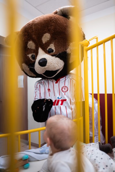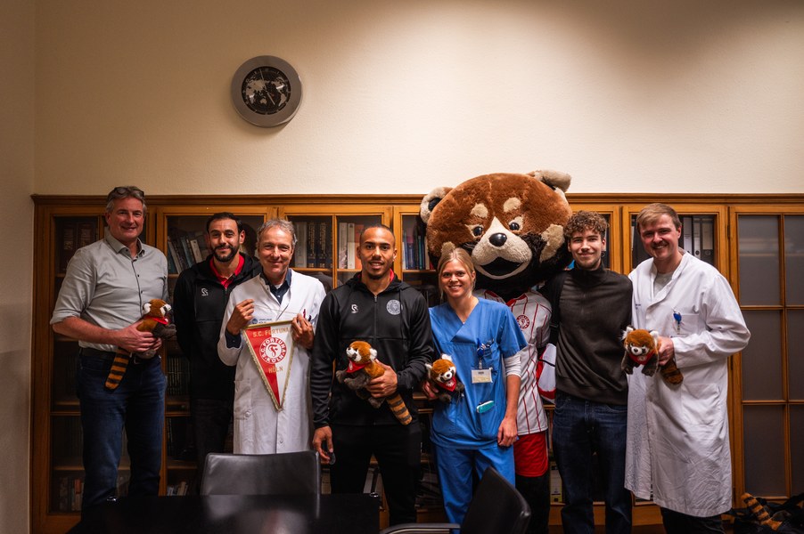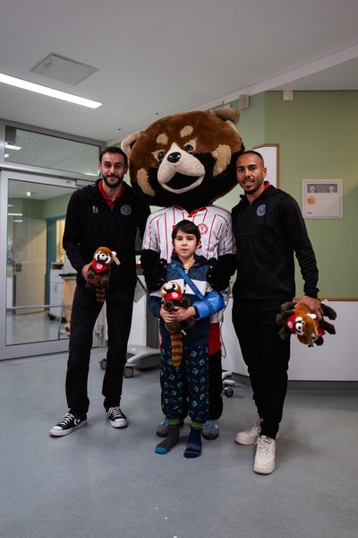 Im Gepäck hatten sie Trikots, Wimpel und 100 kuschelige Stofftiere, „Fred der Panda“, das beliebte Maskottchen des Vereins. Die Übergabe sorgte überall für leuchtende Augen und strahlende Gesichter. Viele Kinder hielten ihren neuen Begleiter sofort fest im Arm, manche erzählten den Spielern sogar stolz, wo der Panda künftig schlafen oder sie im Klinikalltag begleiten würde.